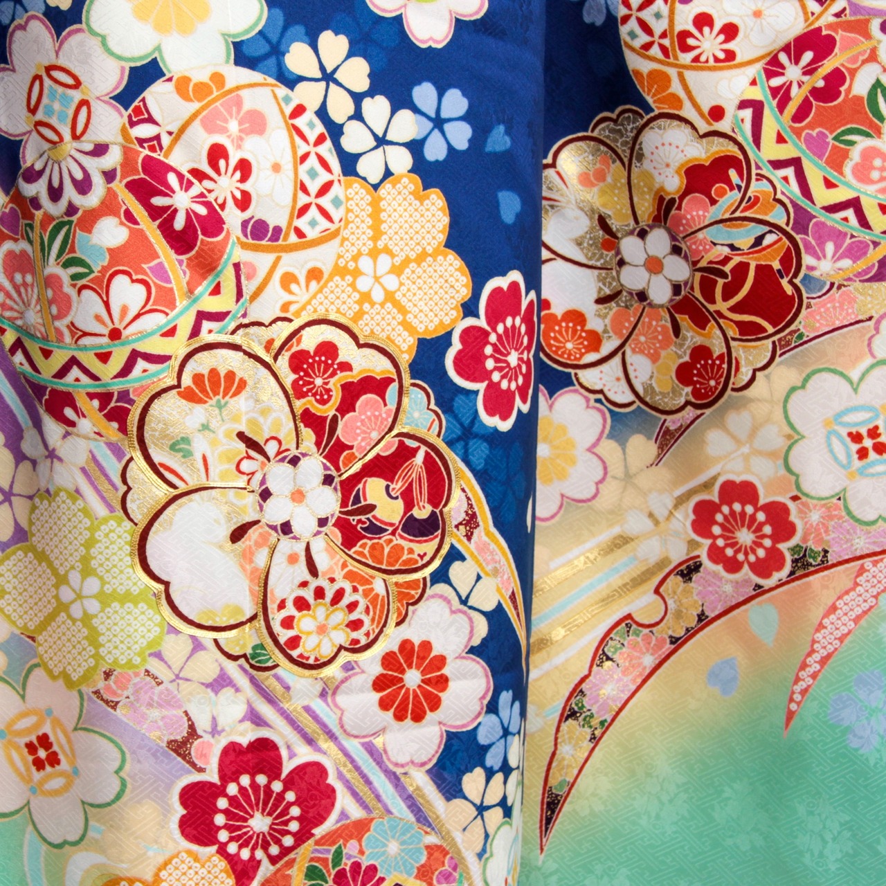 振袖フルセット 振袖セット 振袖 M〜Lサイズ 青×新古典 美品 成人式 着物 晴れ着 7点フルセット F-392