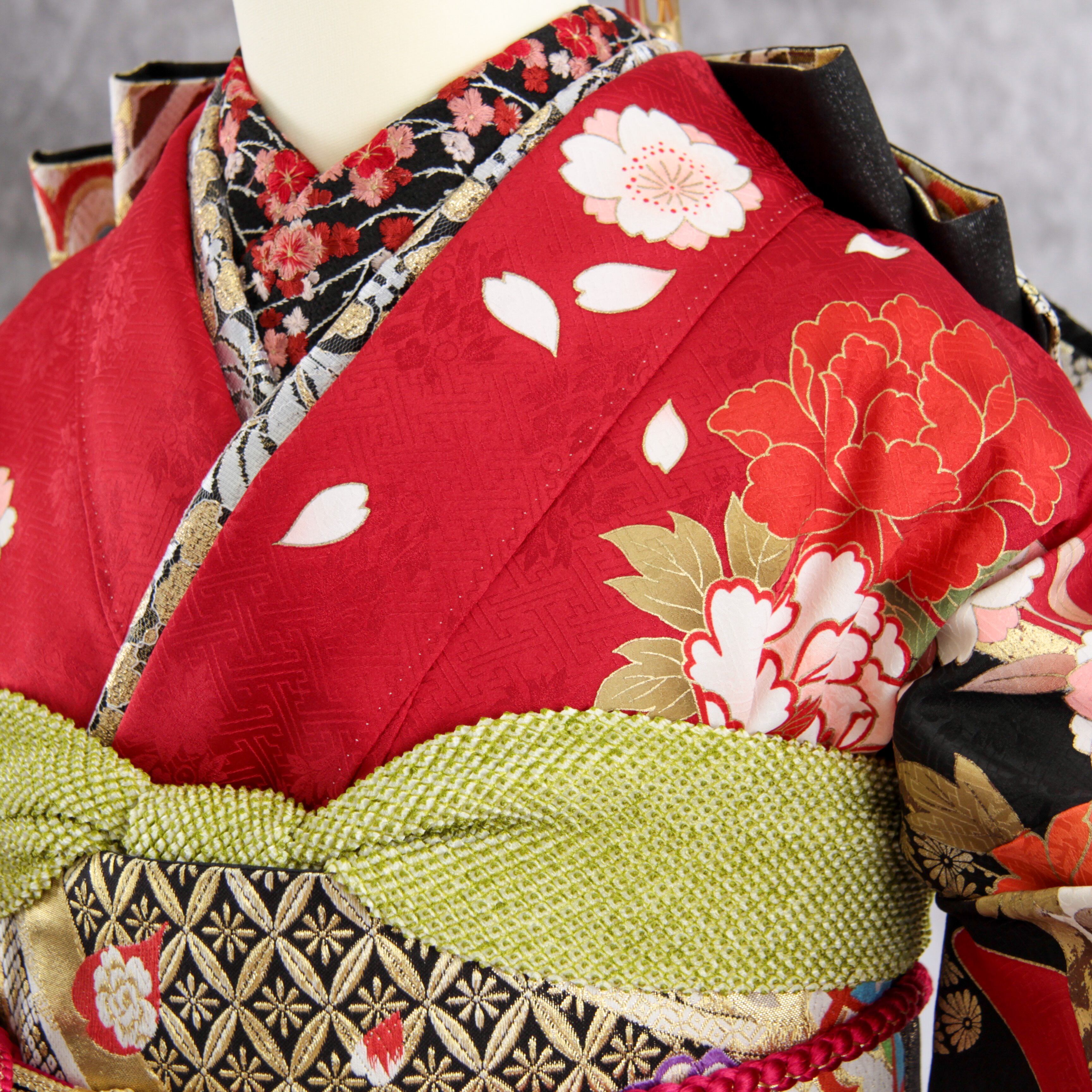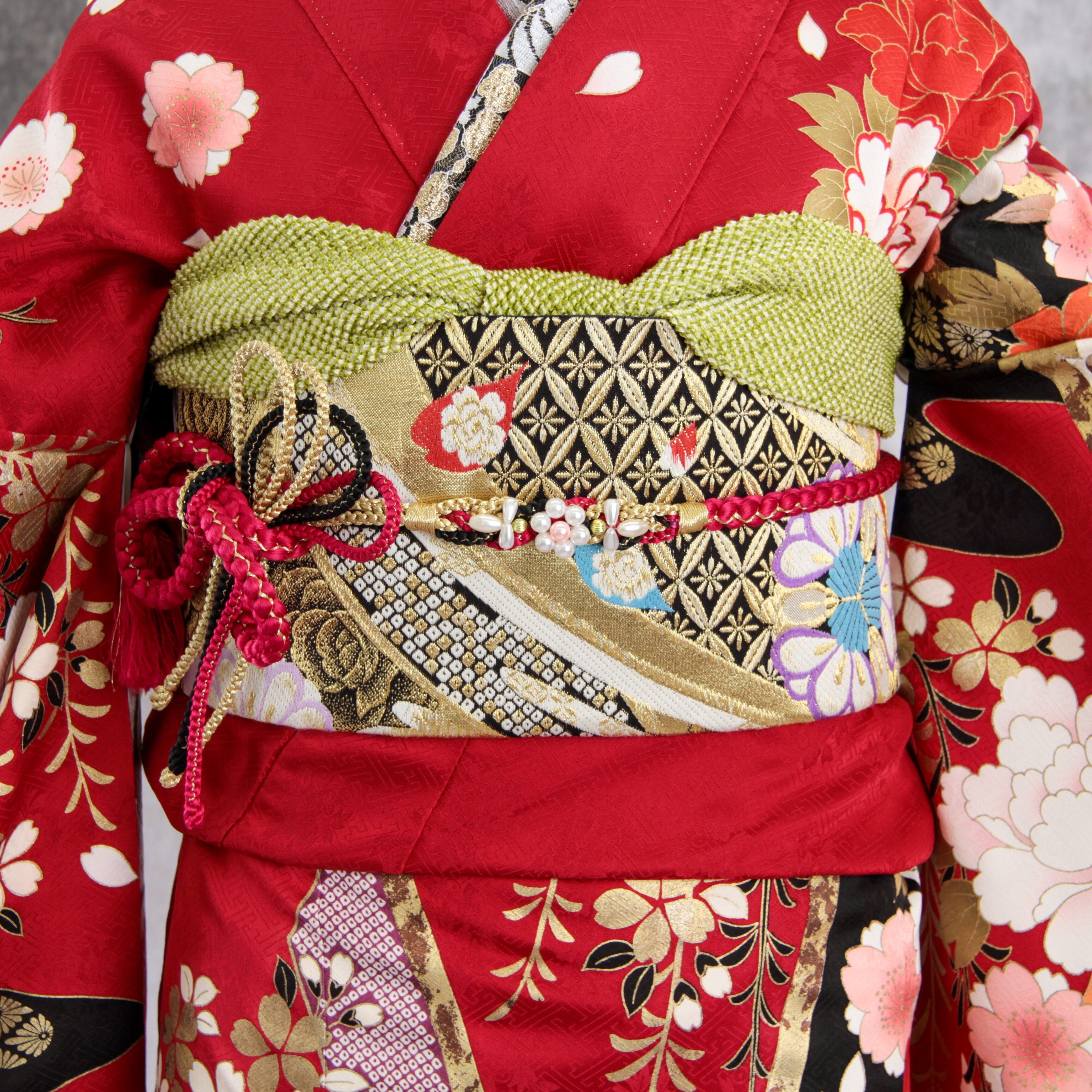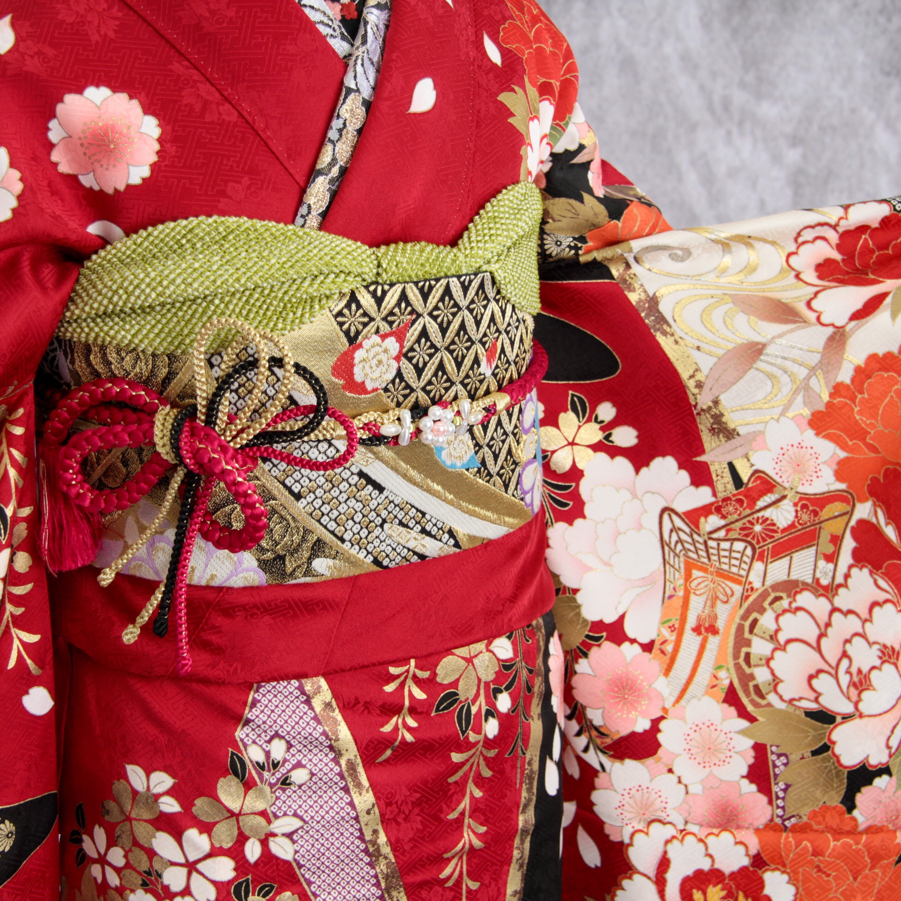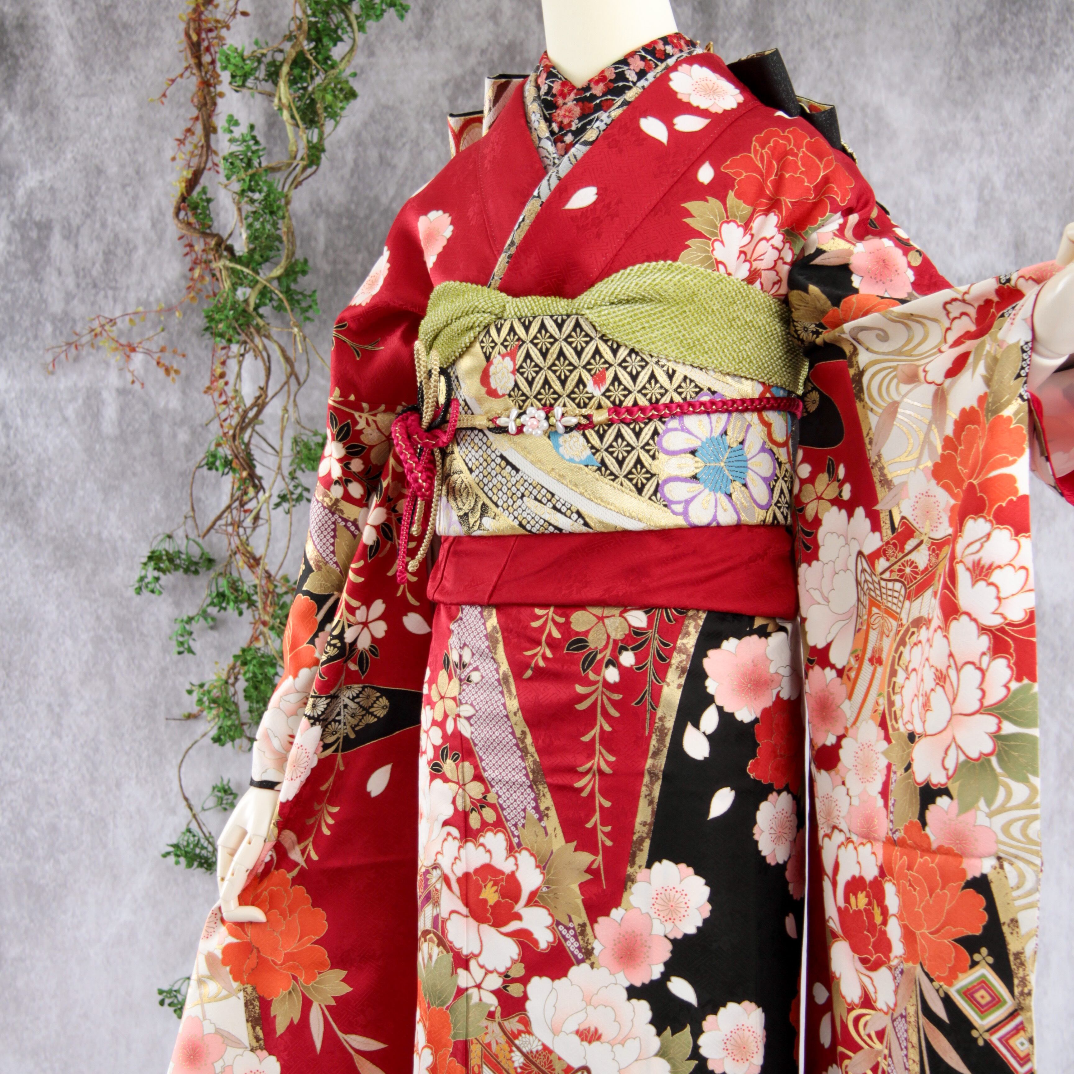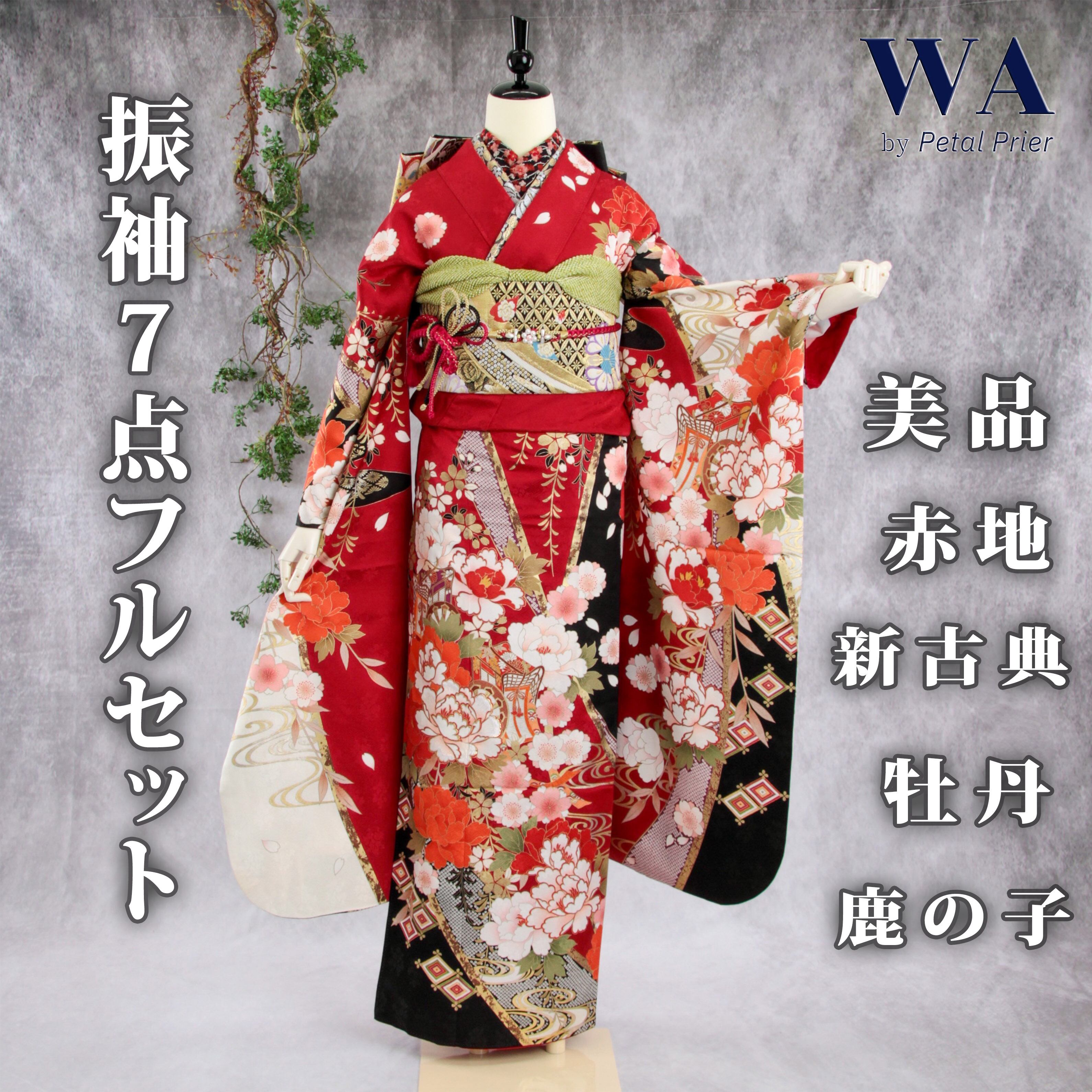 振袖フルセット 振袖セット 振袖 Lサイズ 赤×新古典 美品 成人式 着物 晴れ着 7点フルセット F-417