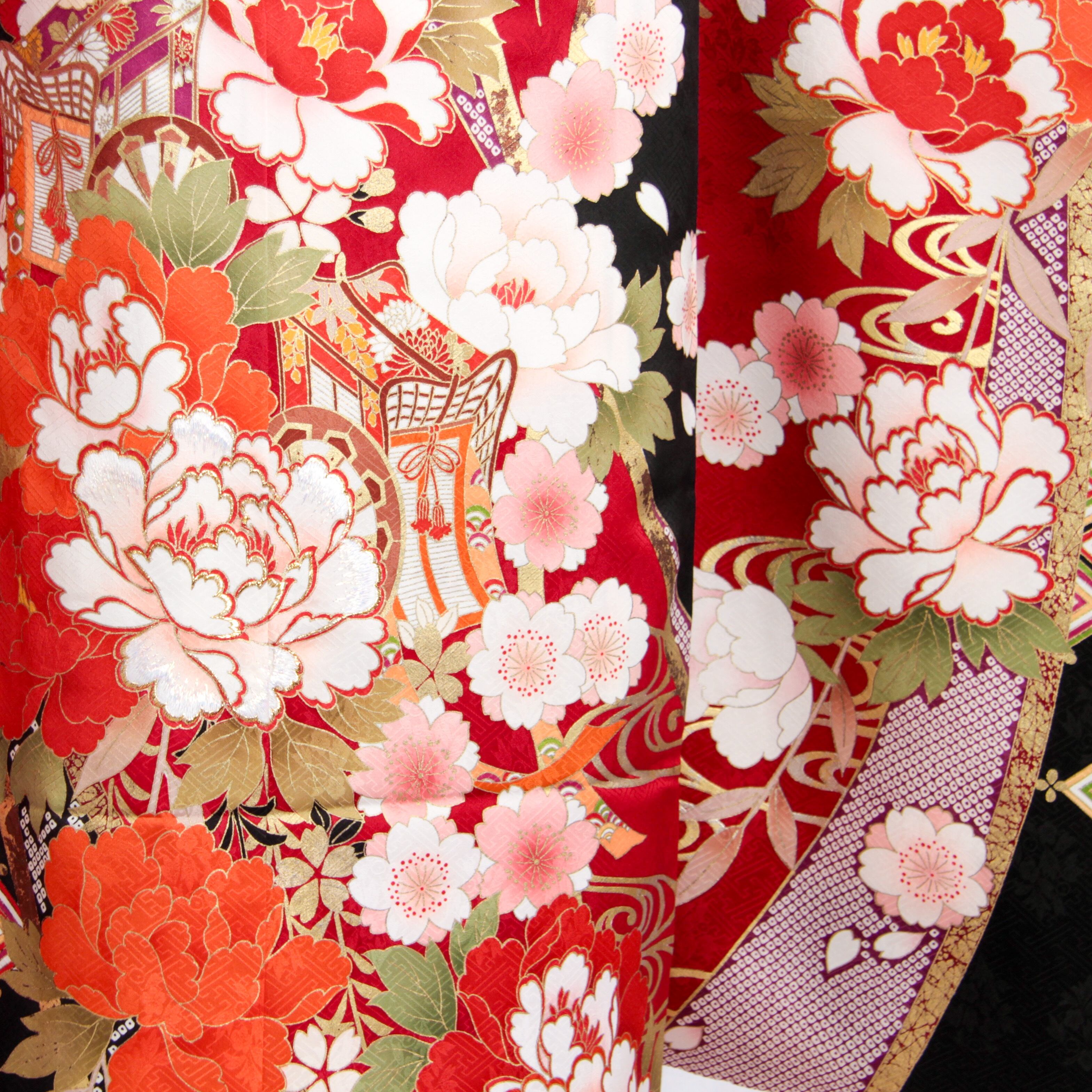 赤地に御所車や牡丹が印象的な新古典振袖です。