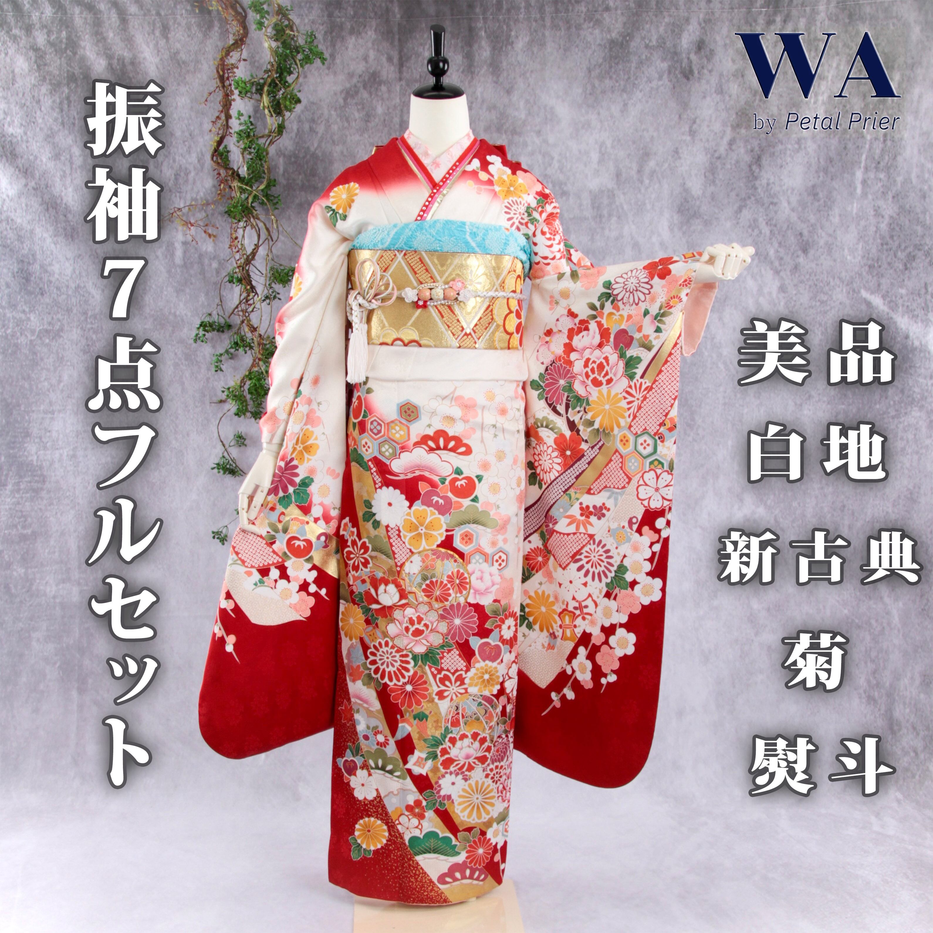 振袖フルセット 振袖セット 振袖 Mサイズ 白×新古典 美品 成人式 着物 晴れ着 7点フルセット F-389