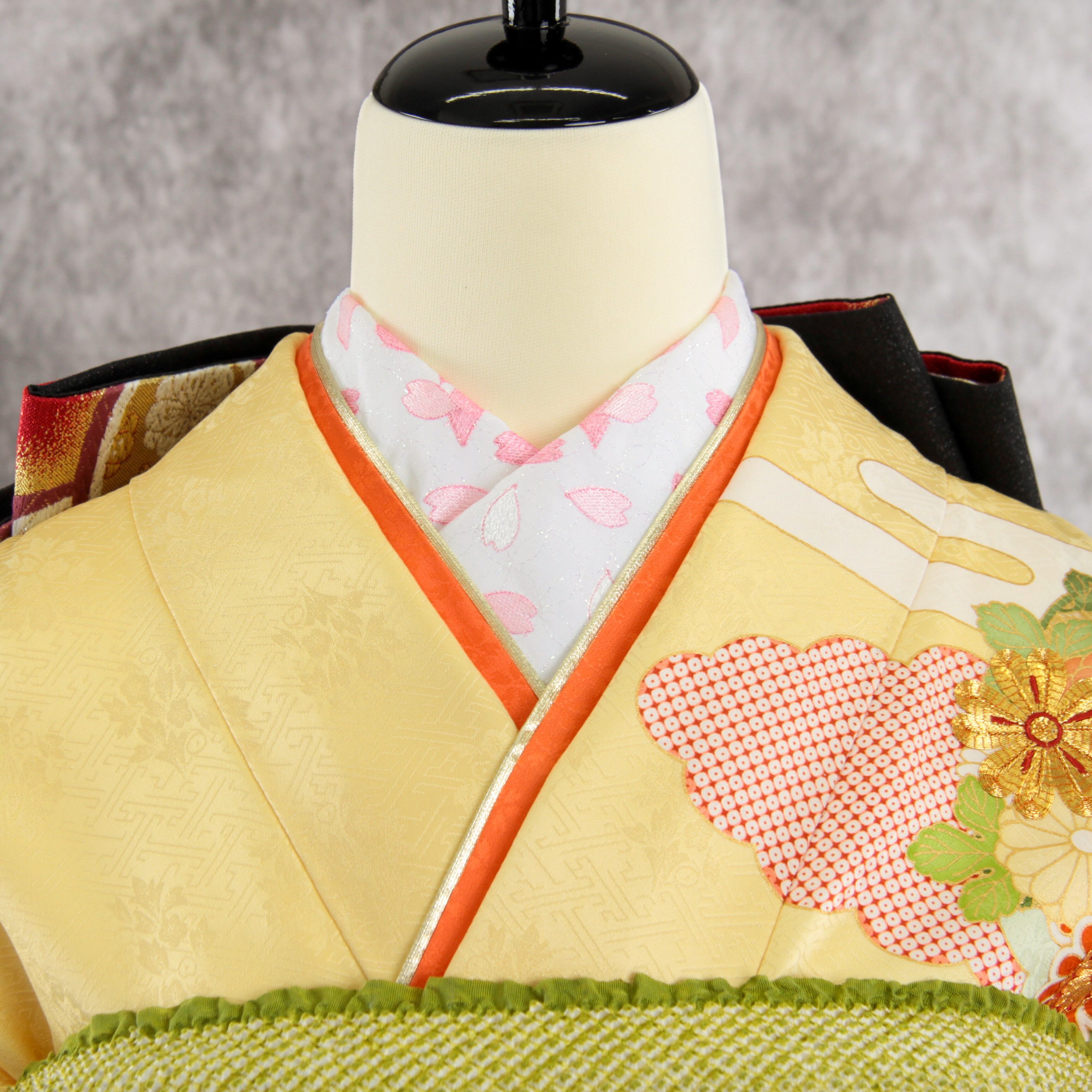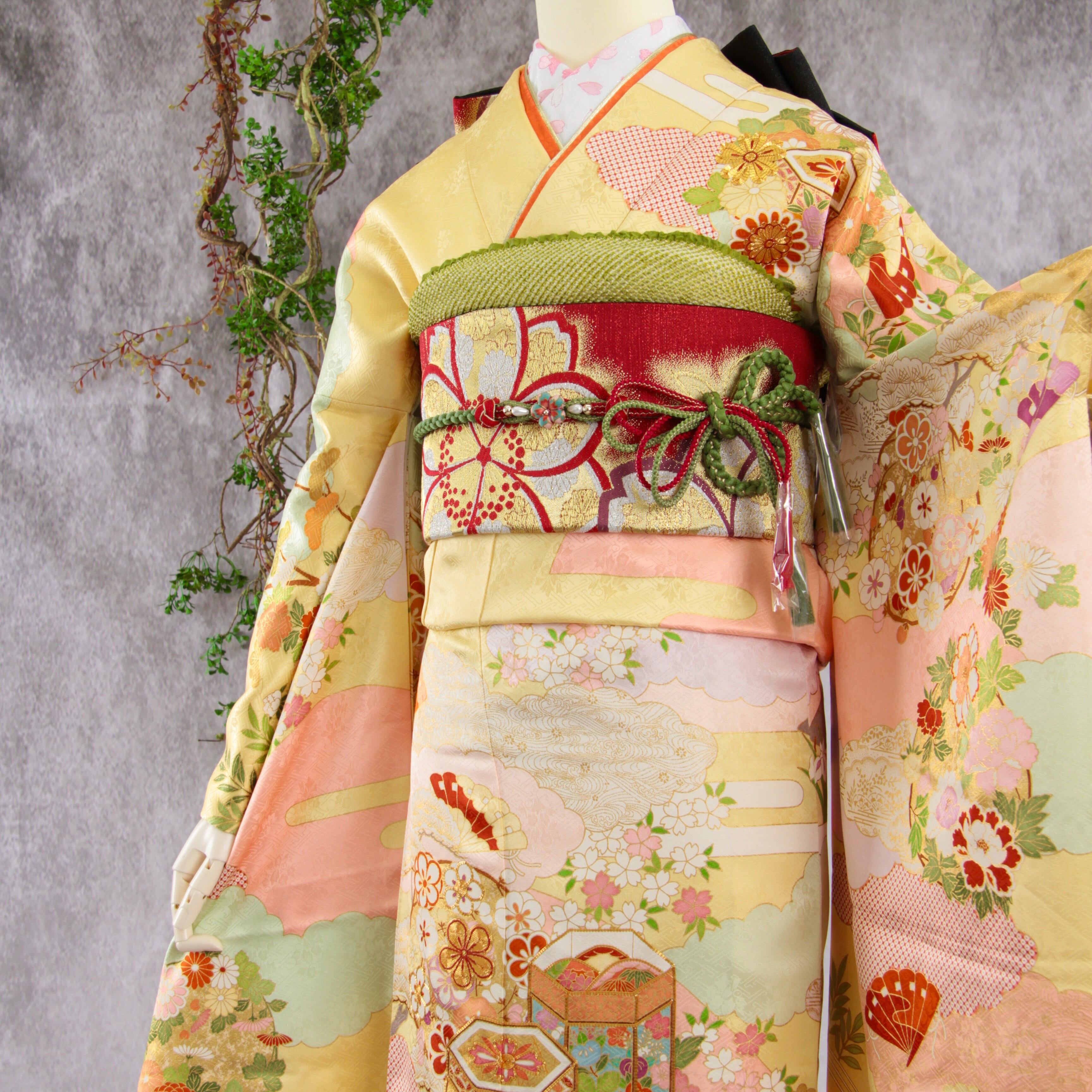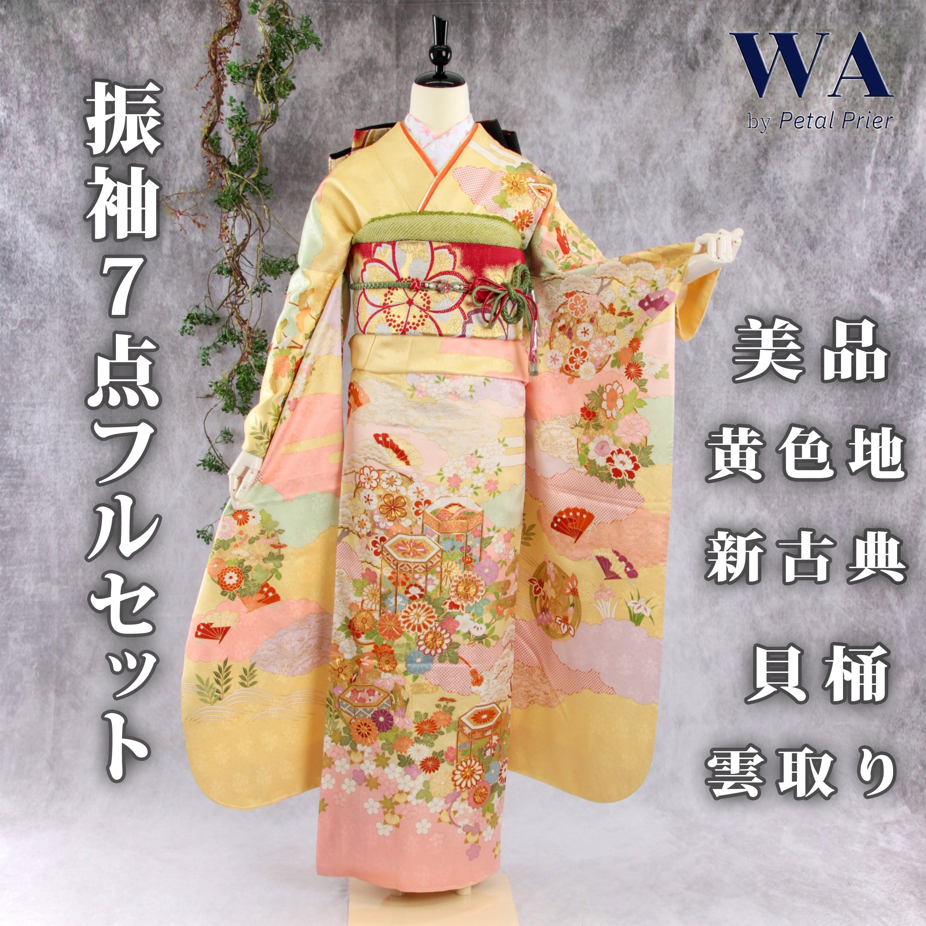 振袖フルセット 振袖セット 振袖 LLサイズ 黄色×新古典 美品 成人式 着物 晴れ着 7点フルセット F-419