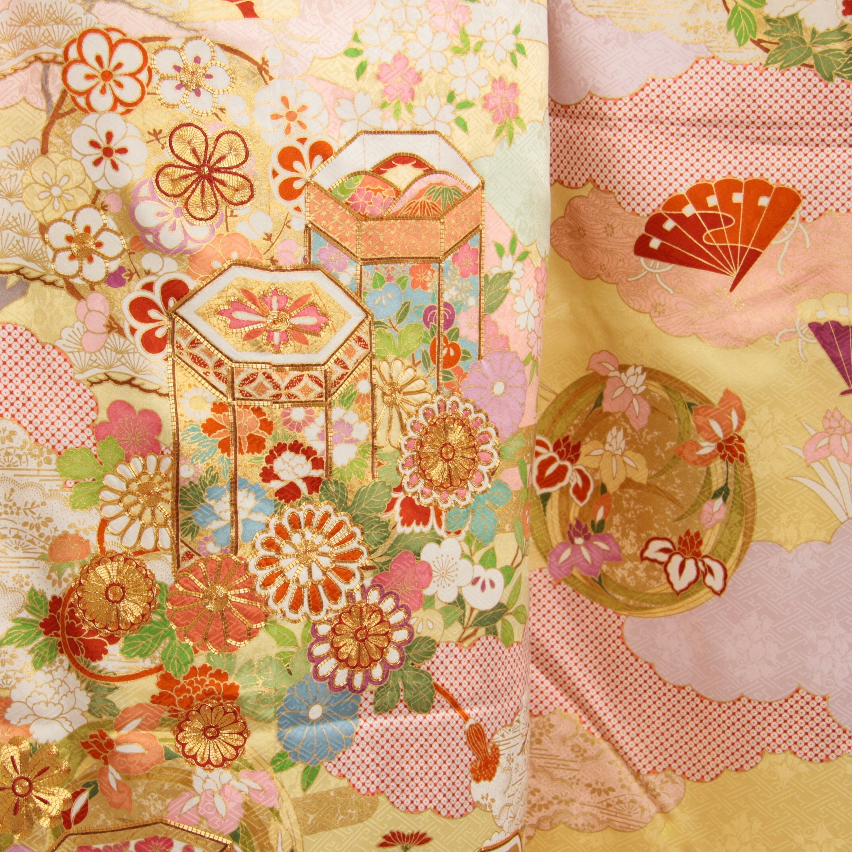 柔らかい黄色地に雲取りや貝桶が印象的な新古典振袖です。