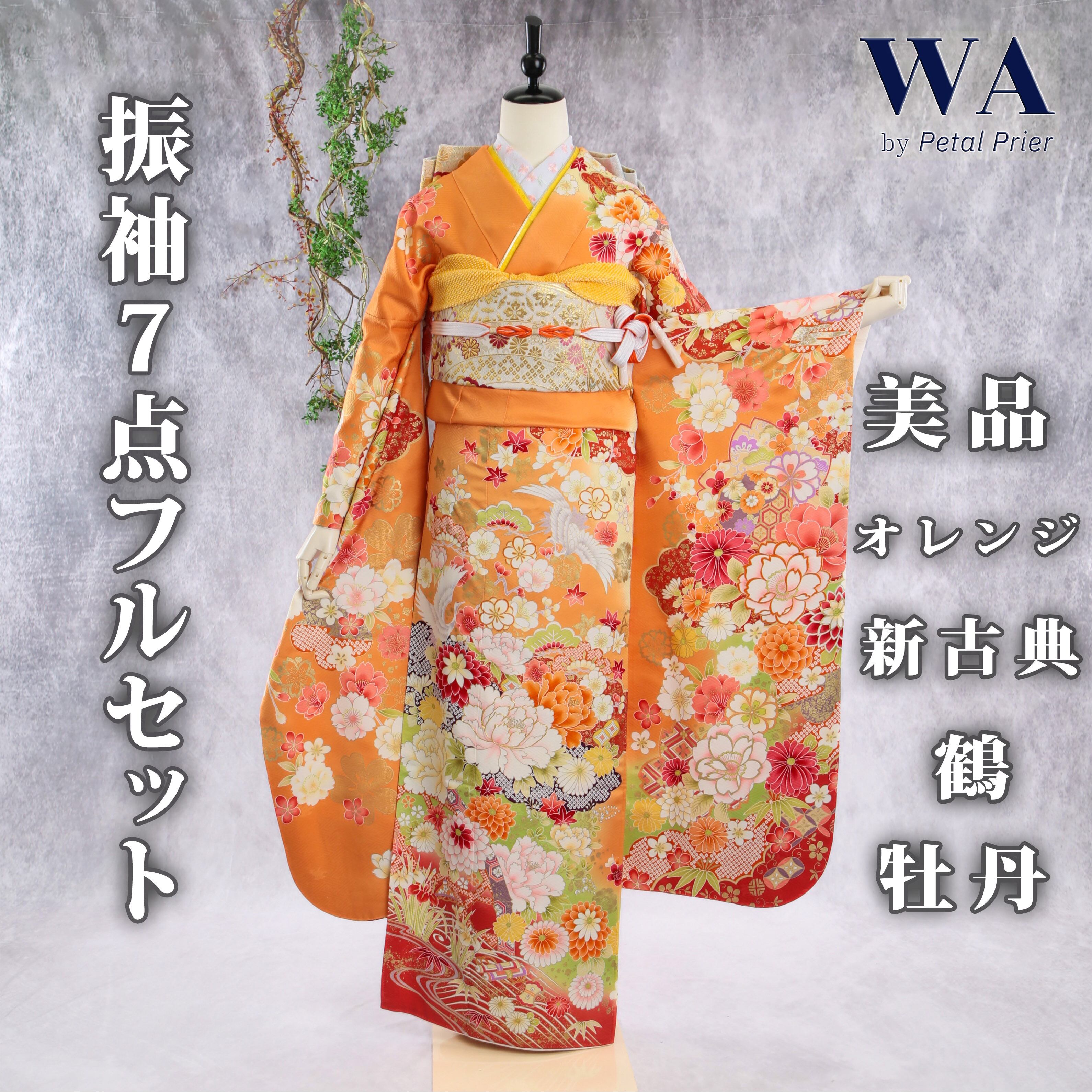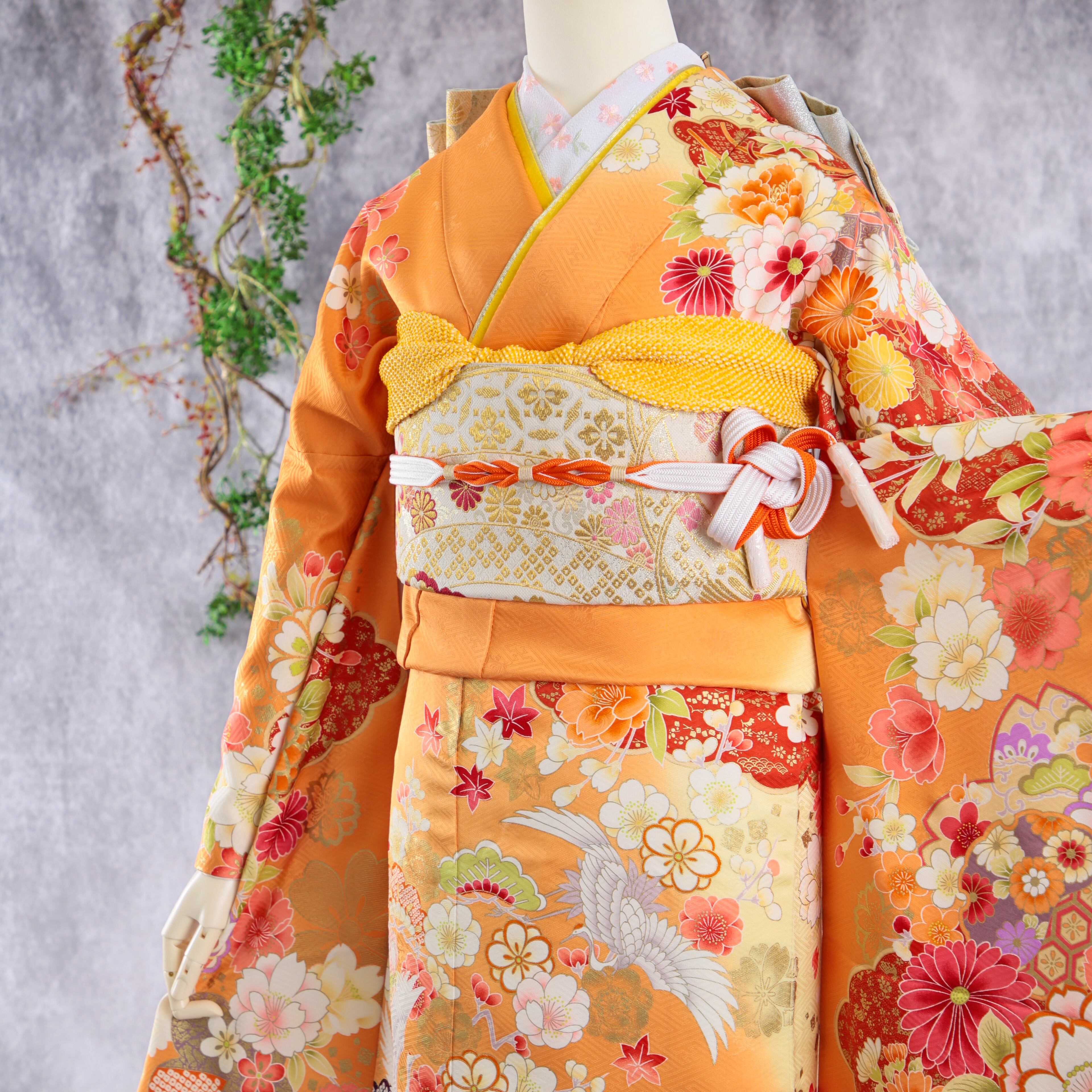 鮮やかなオレンジ地に鶴や牡丹が印象的な新古典振袖です。