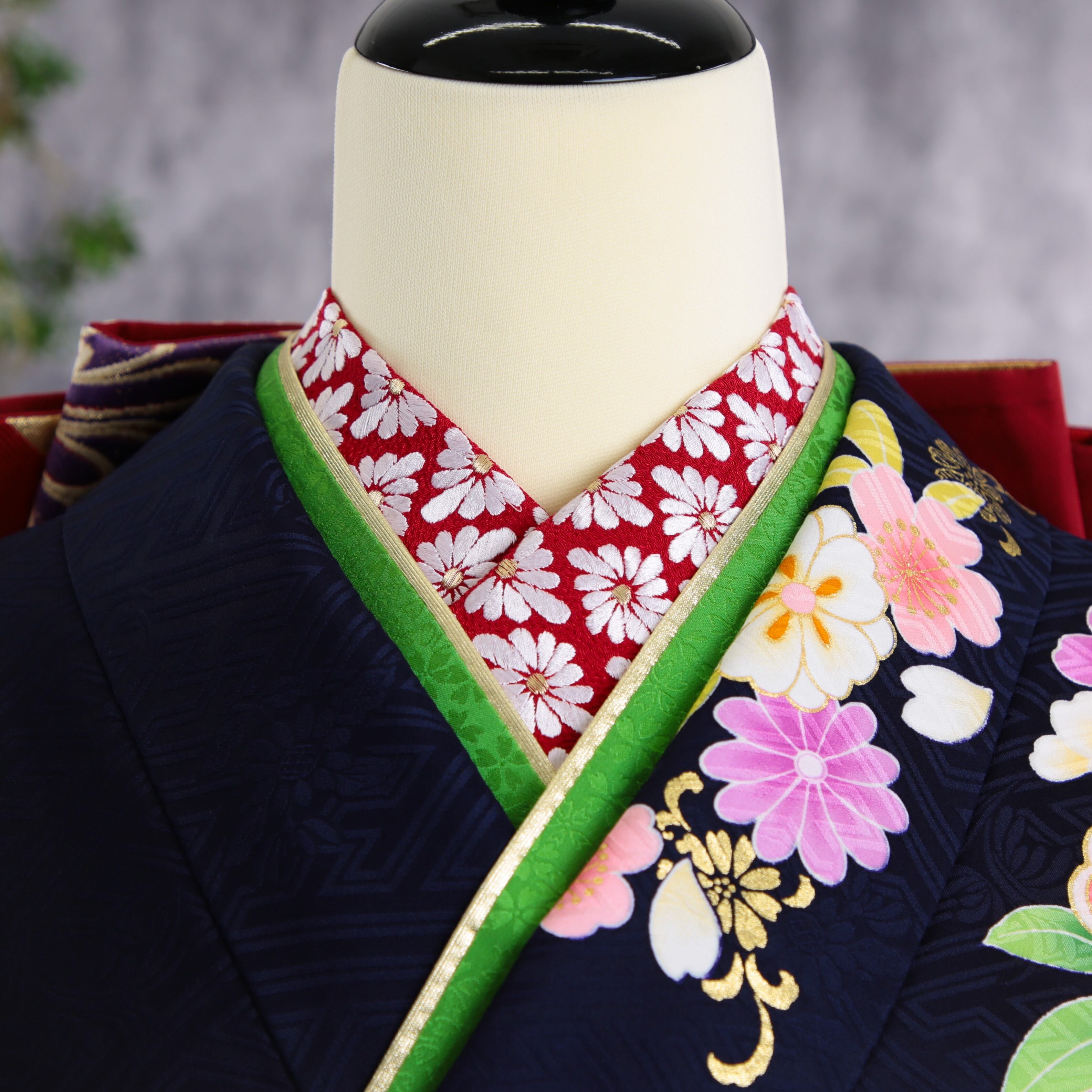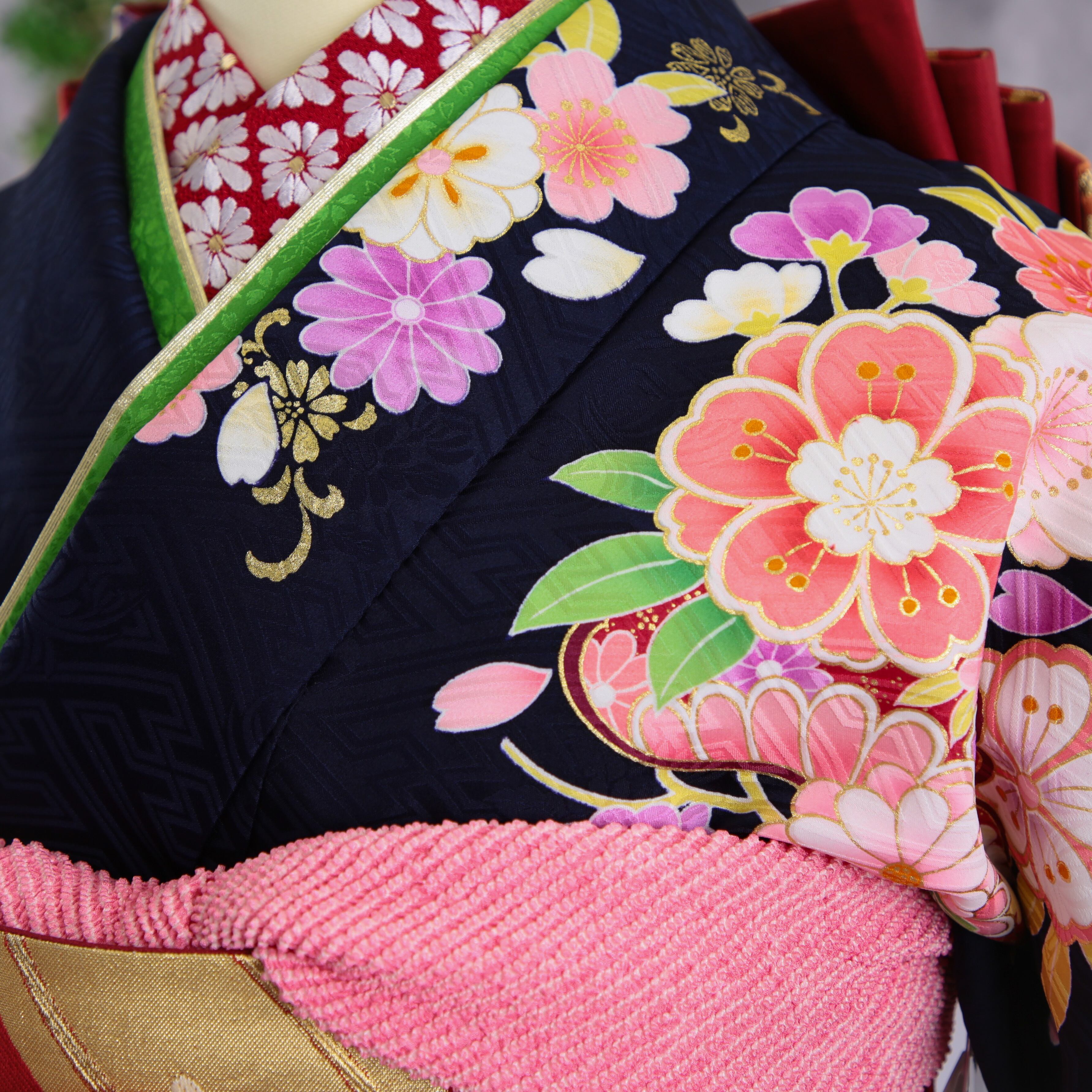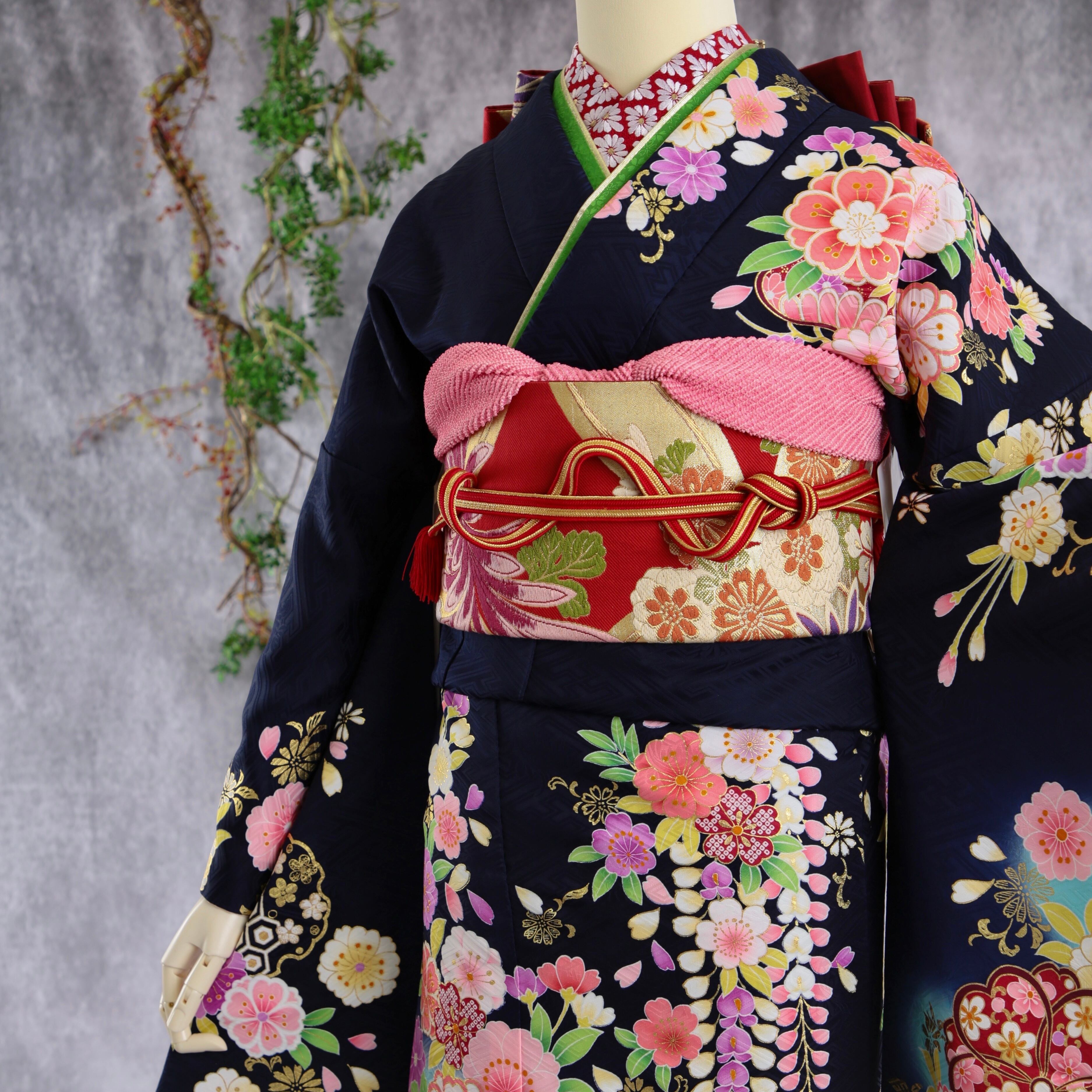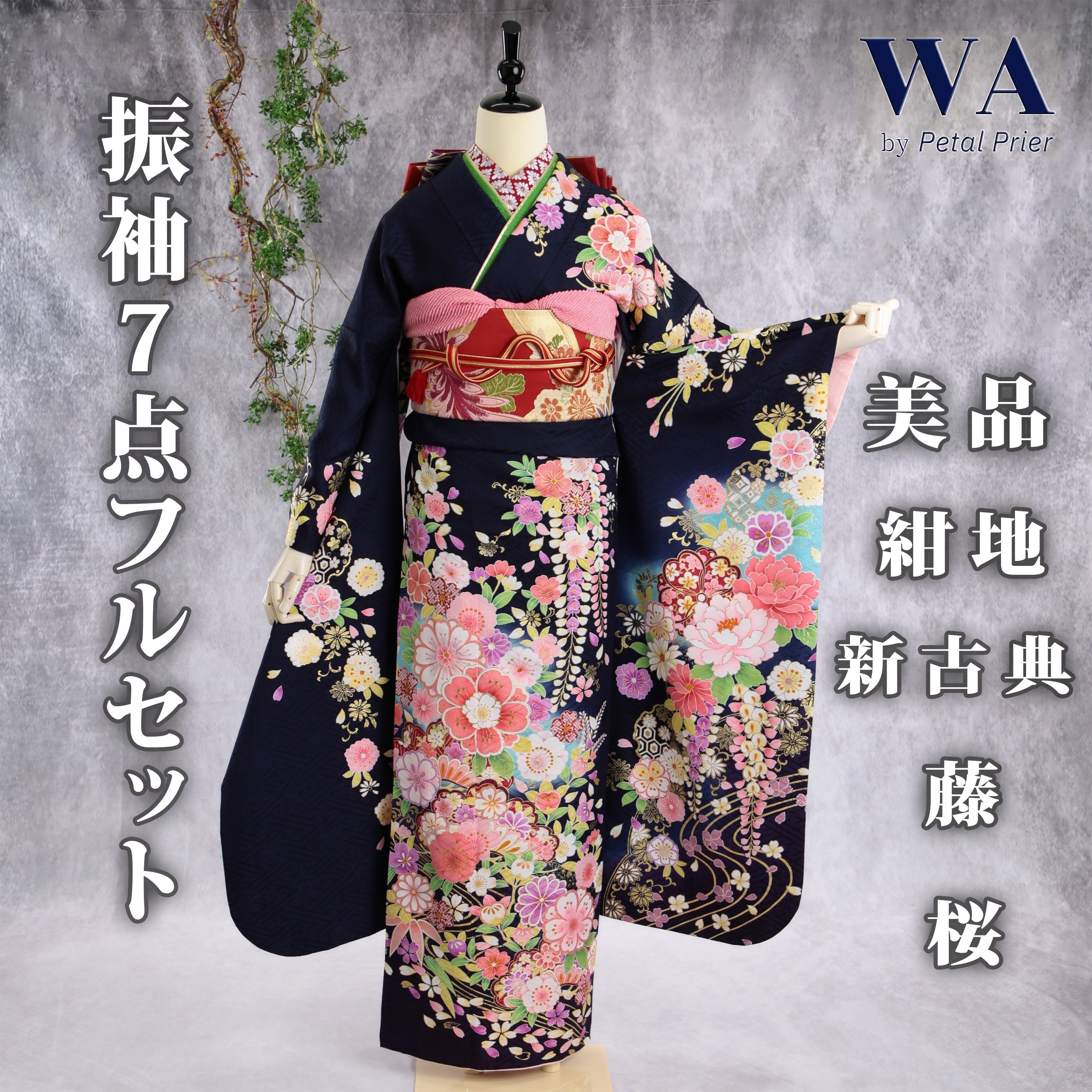 振袖フルセット 振袖セット 振袖 Lサイズ 紺×新古典 美品 成人式 着物 晴れ着 7点フルセット F-451