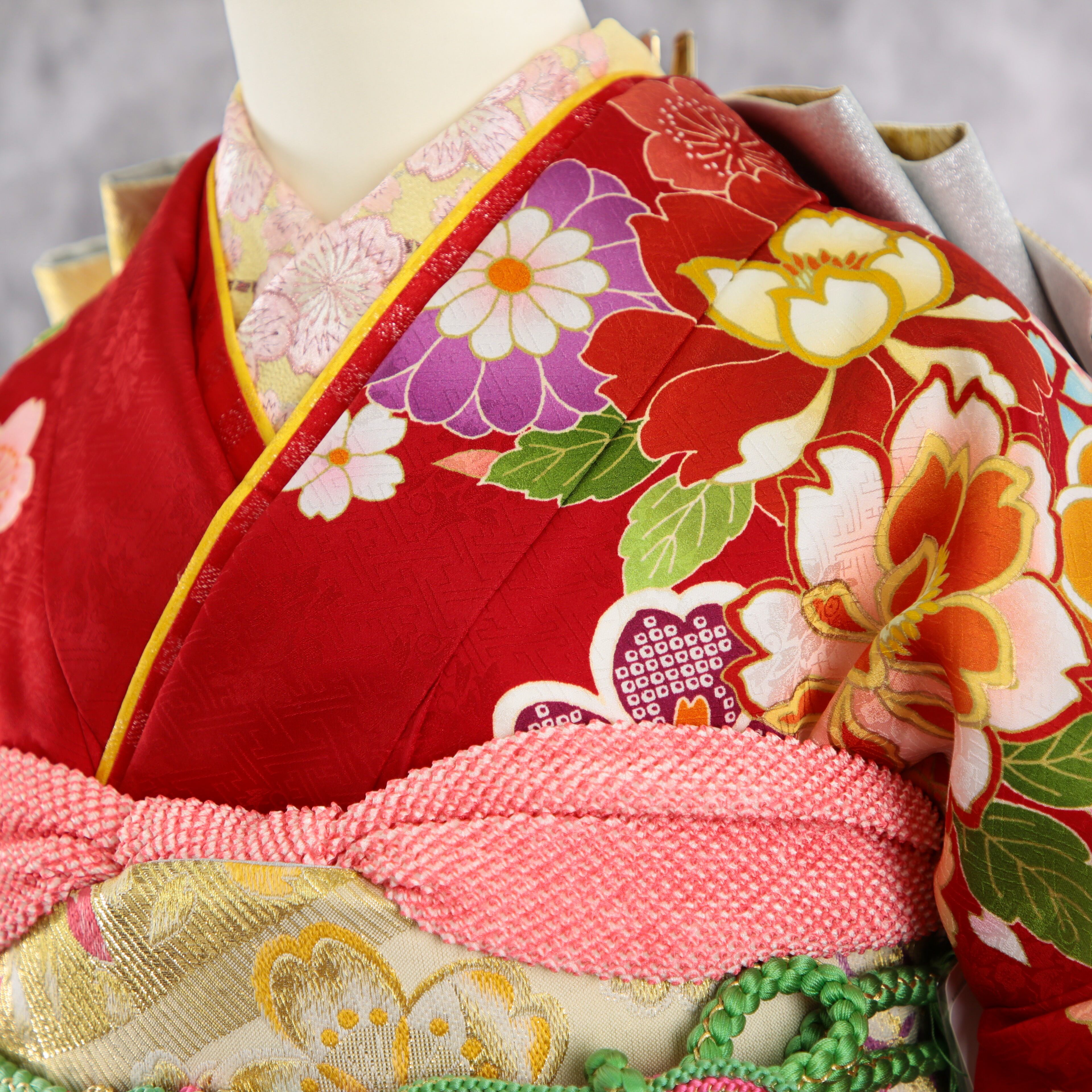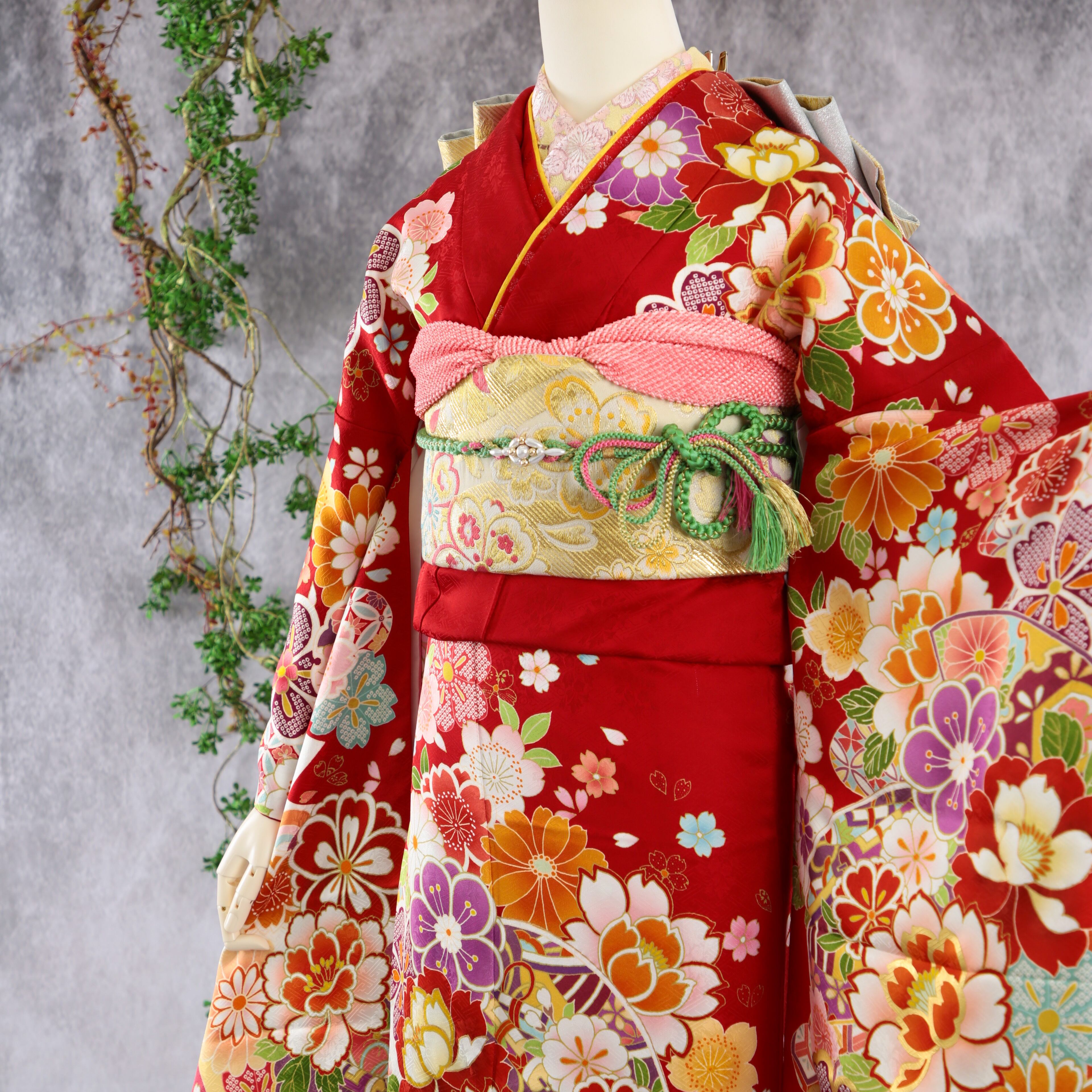 振袖フルセット 振袖セット 振袖 M〜Lサイズ 赤×新古典 美品 成人式 着物 晴れ着 7点フルセット F-453