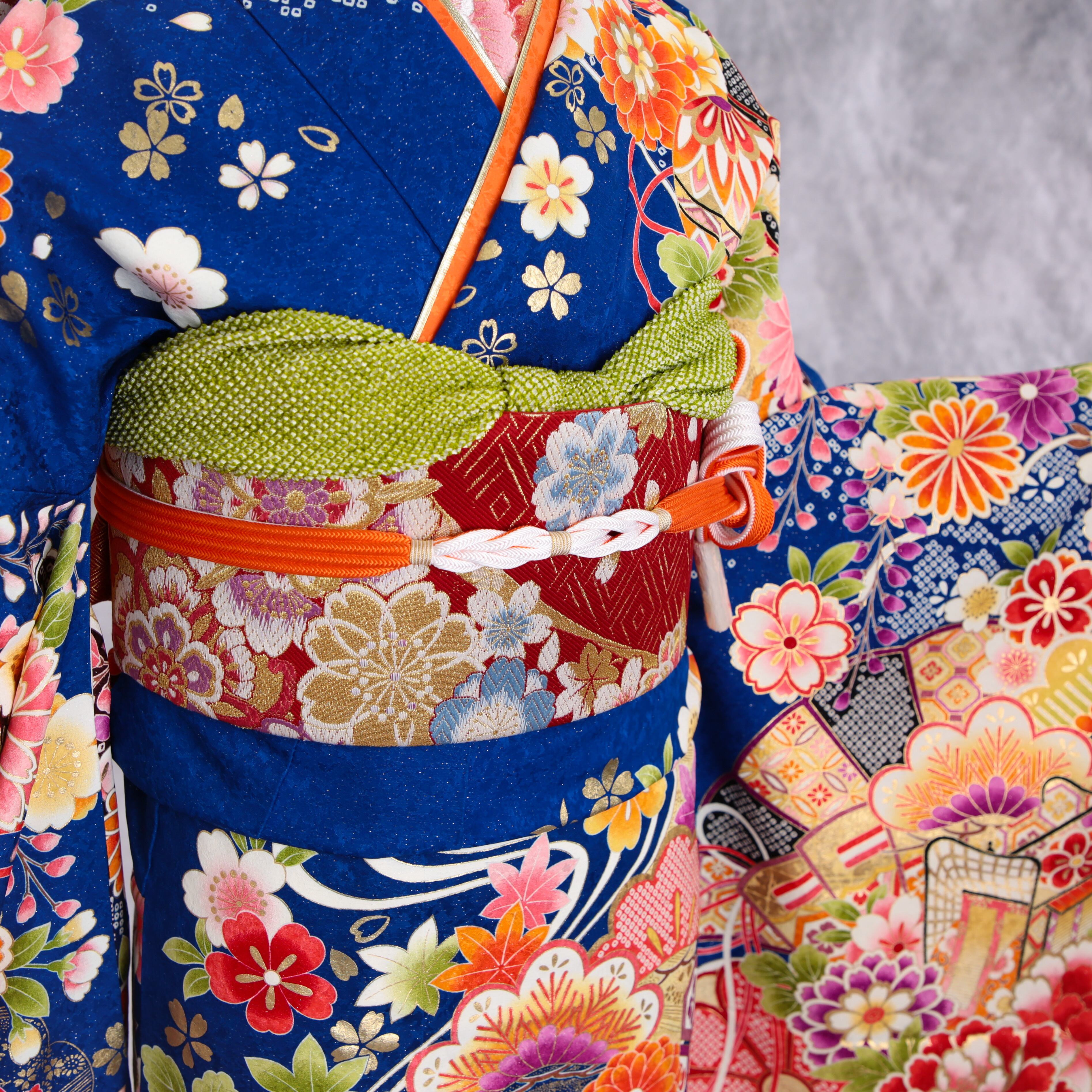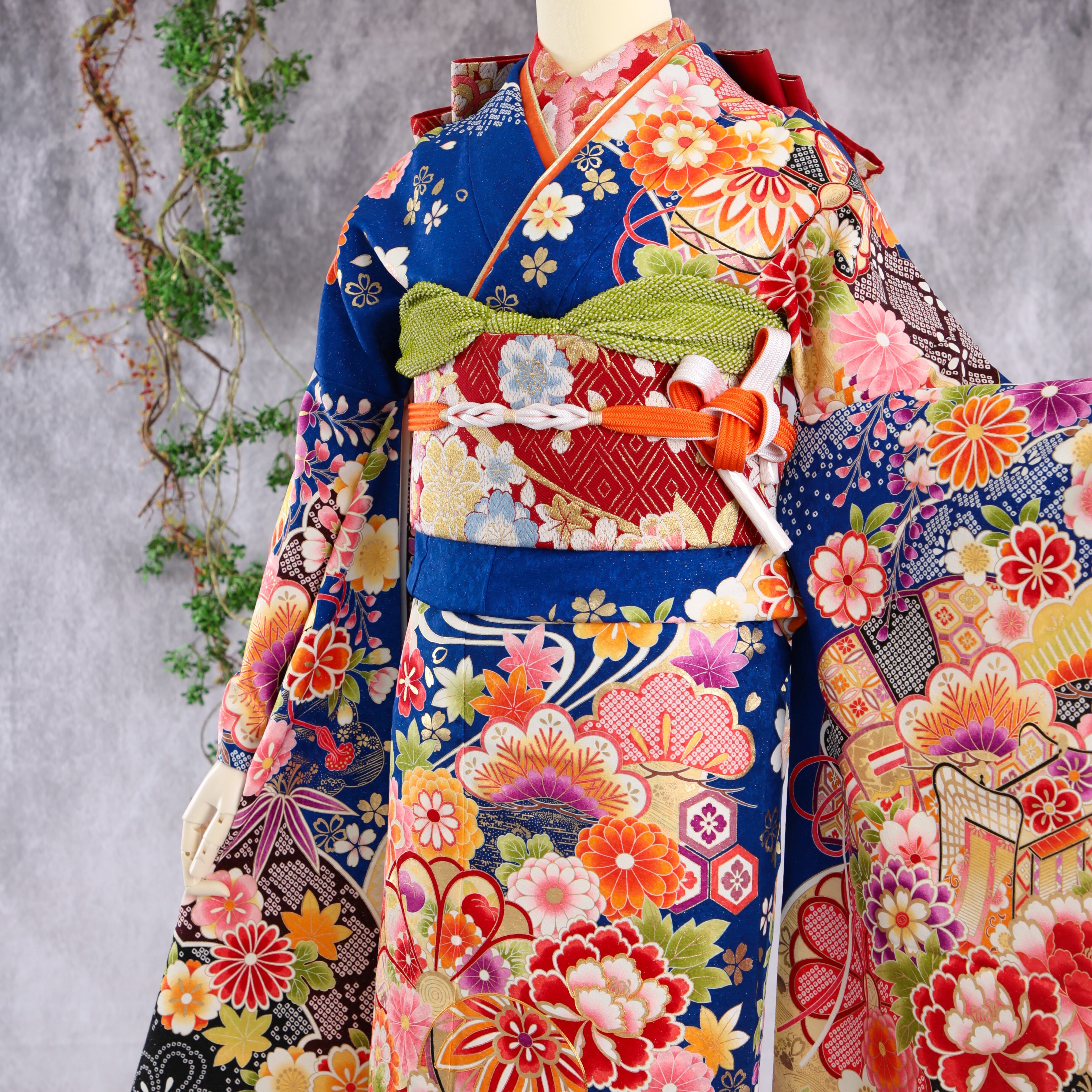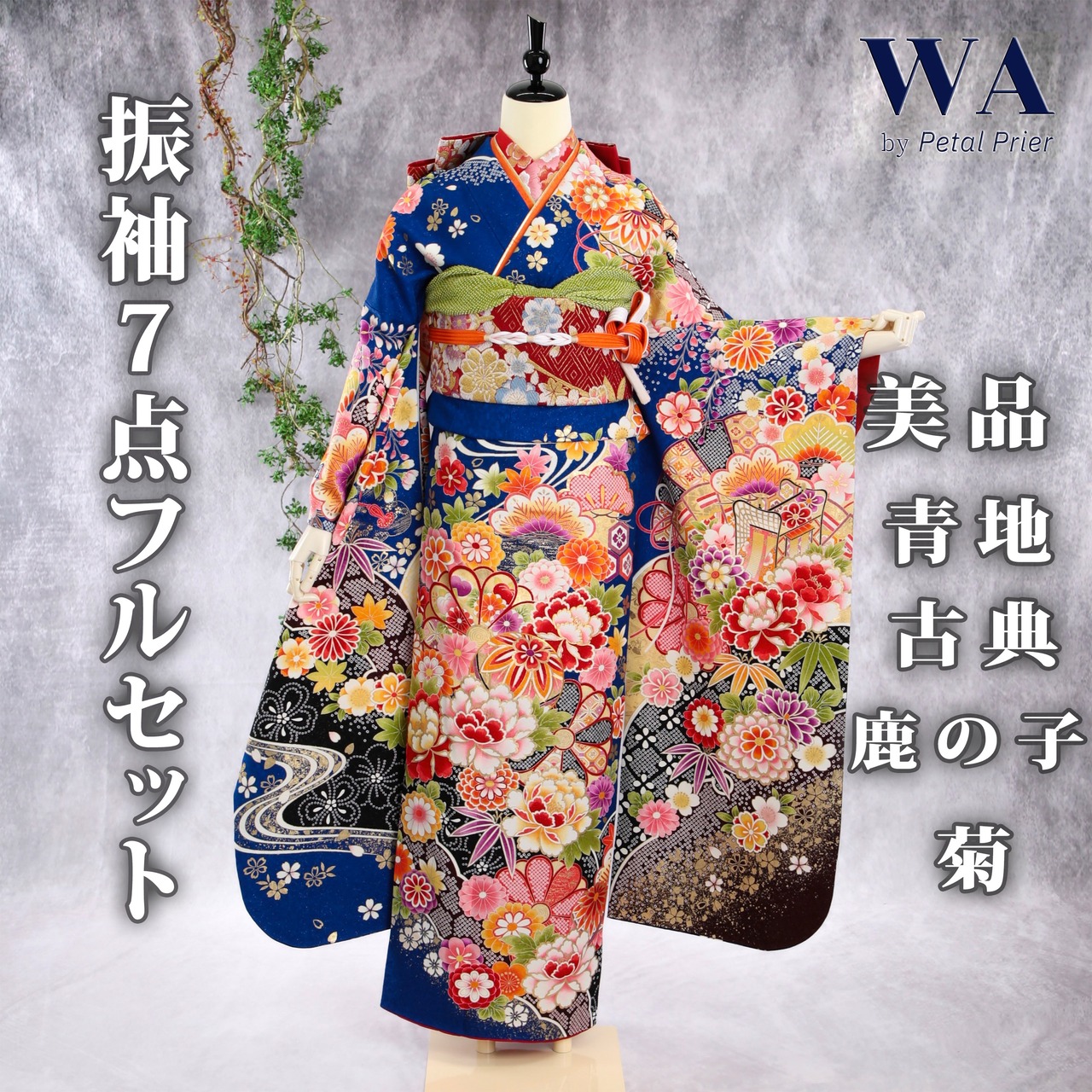 振袖フルセット 振袖セット 振袖 LLサイズ 青×新古典 美品 成人式 着物 晴れ着 7点フルセット F-458