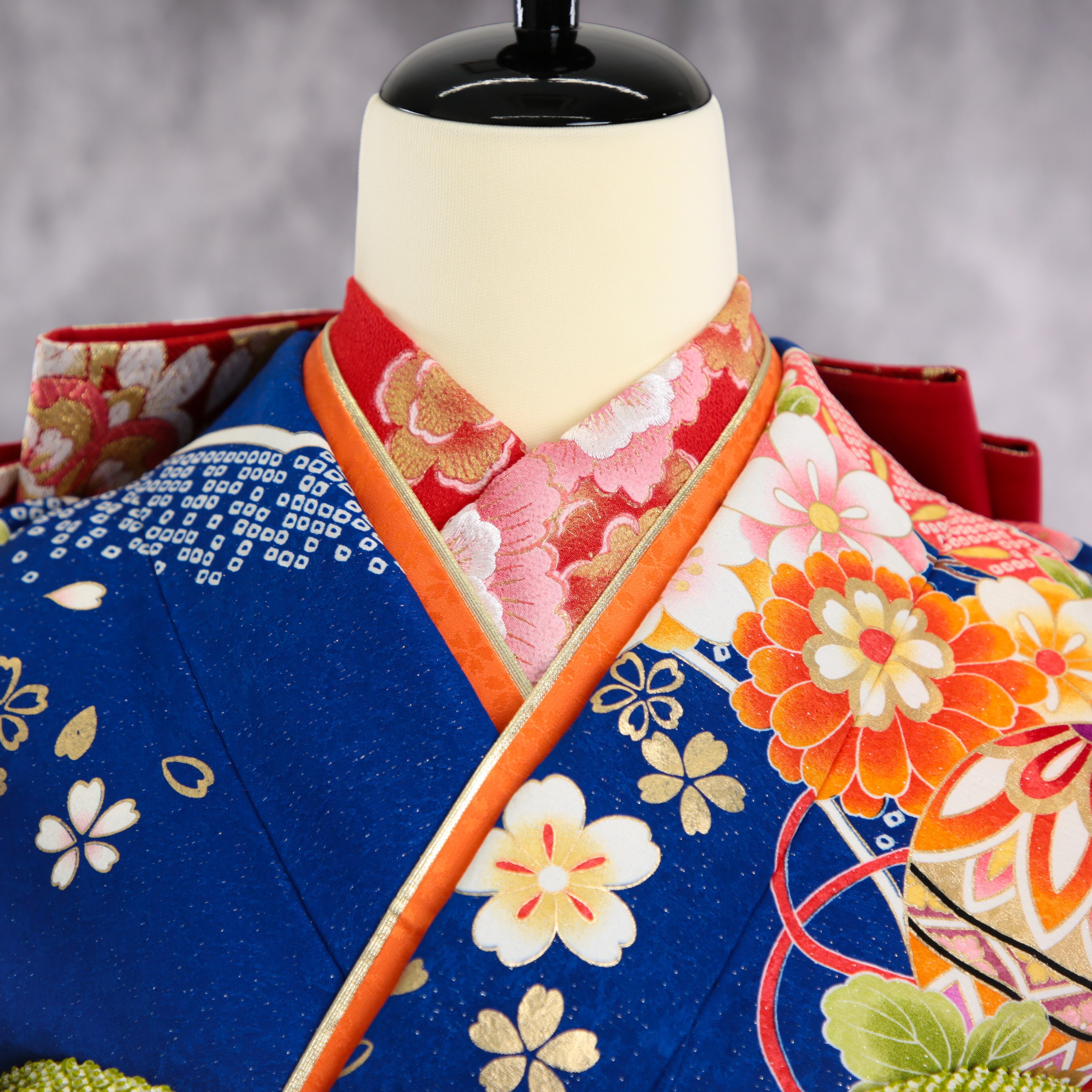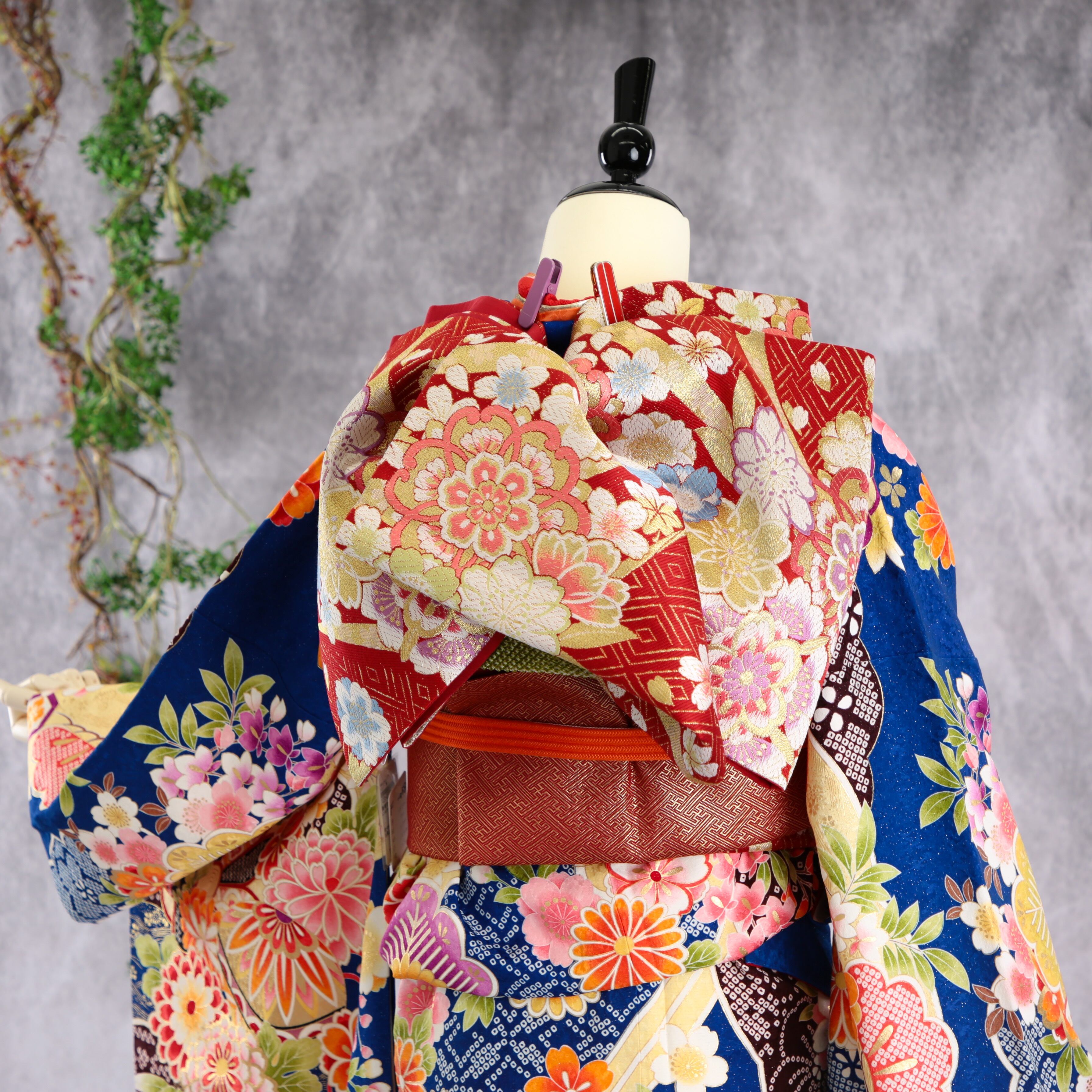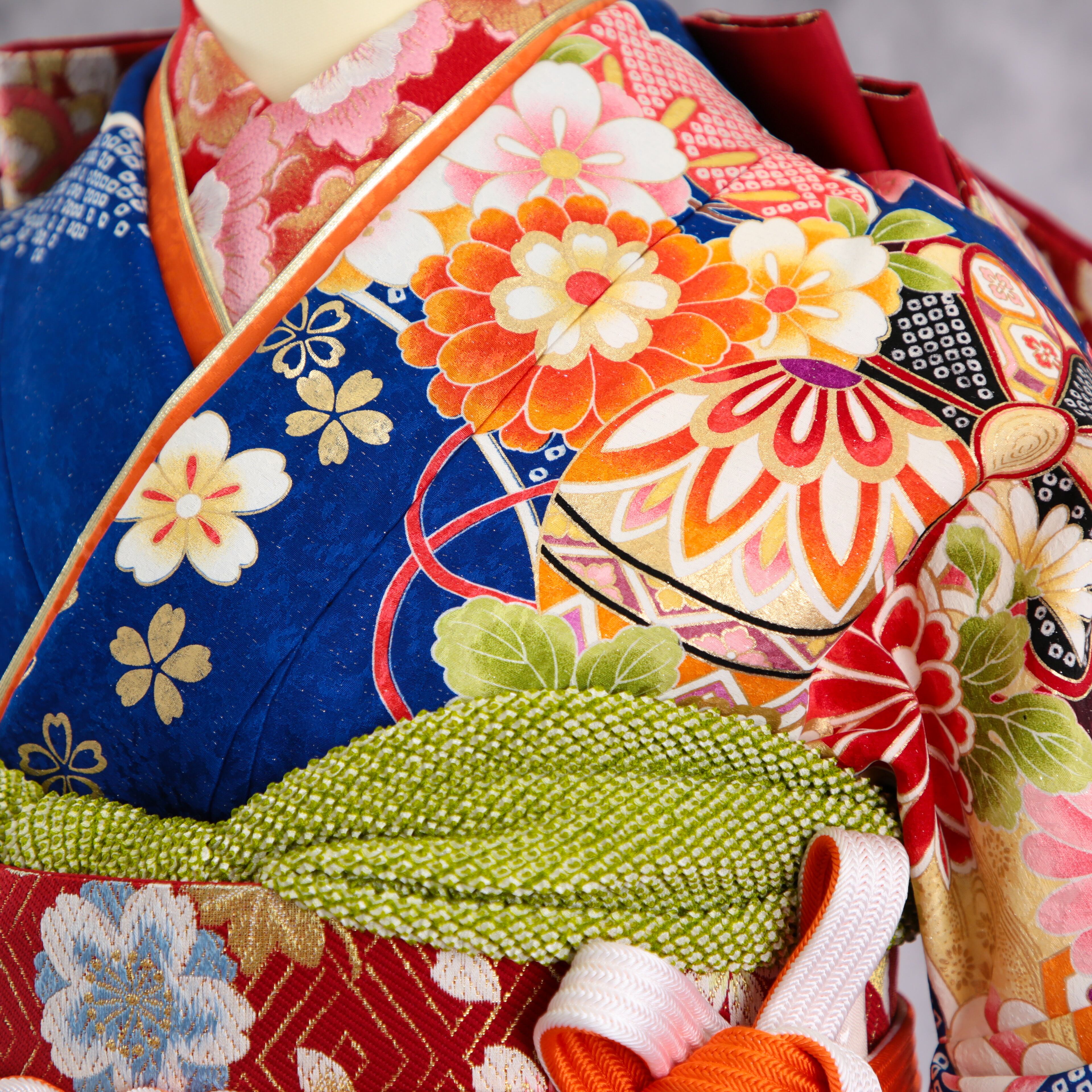 振袖フルセット 振袖セット 振袖 LLサイズ 青×新古典 美品 成人式 着物 晴れ着 7点フルセット F-458
