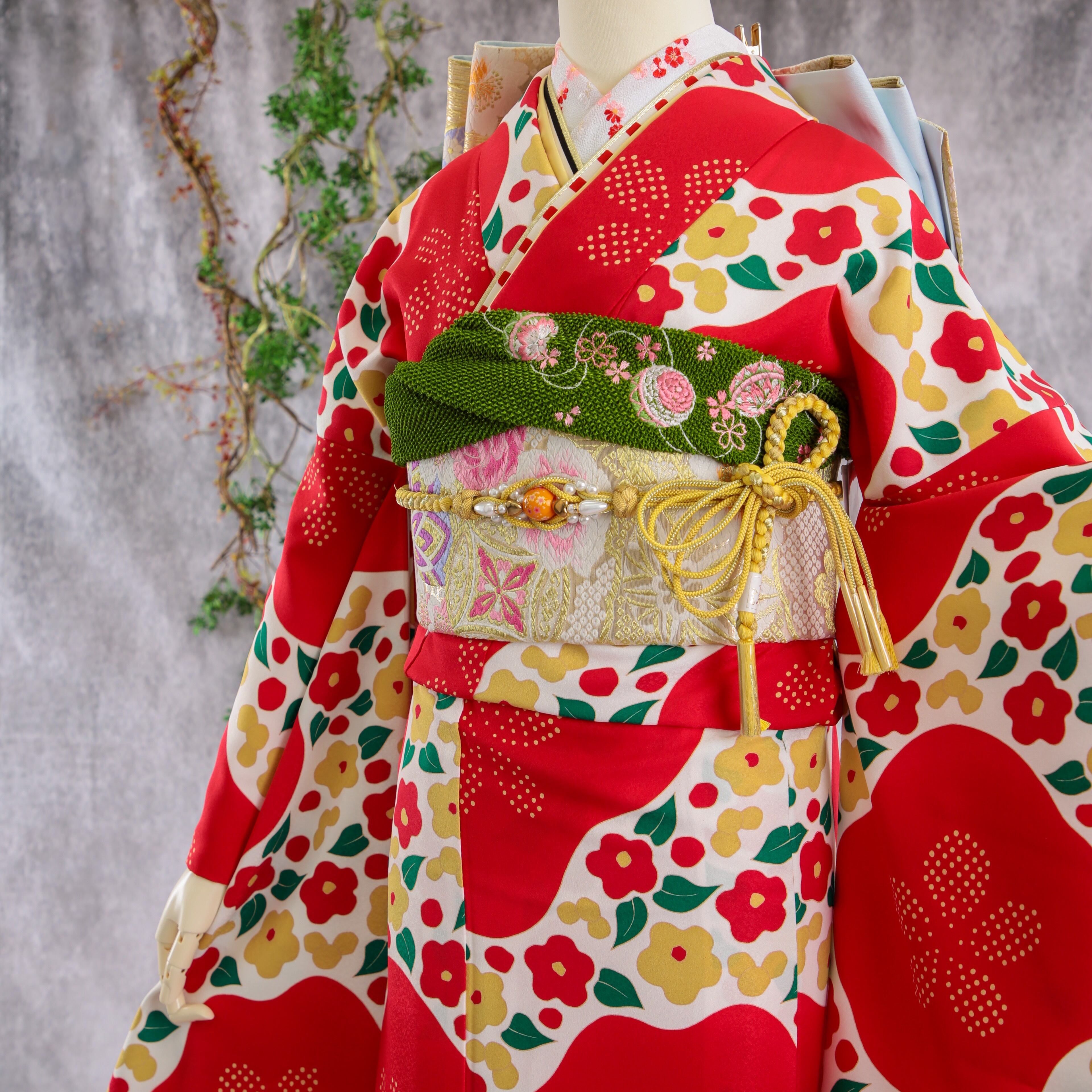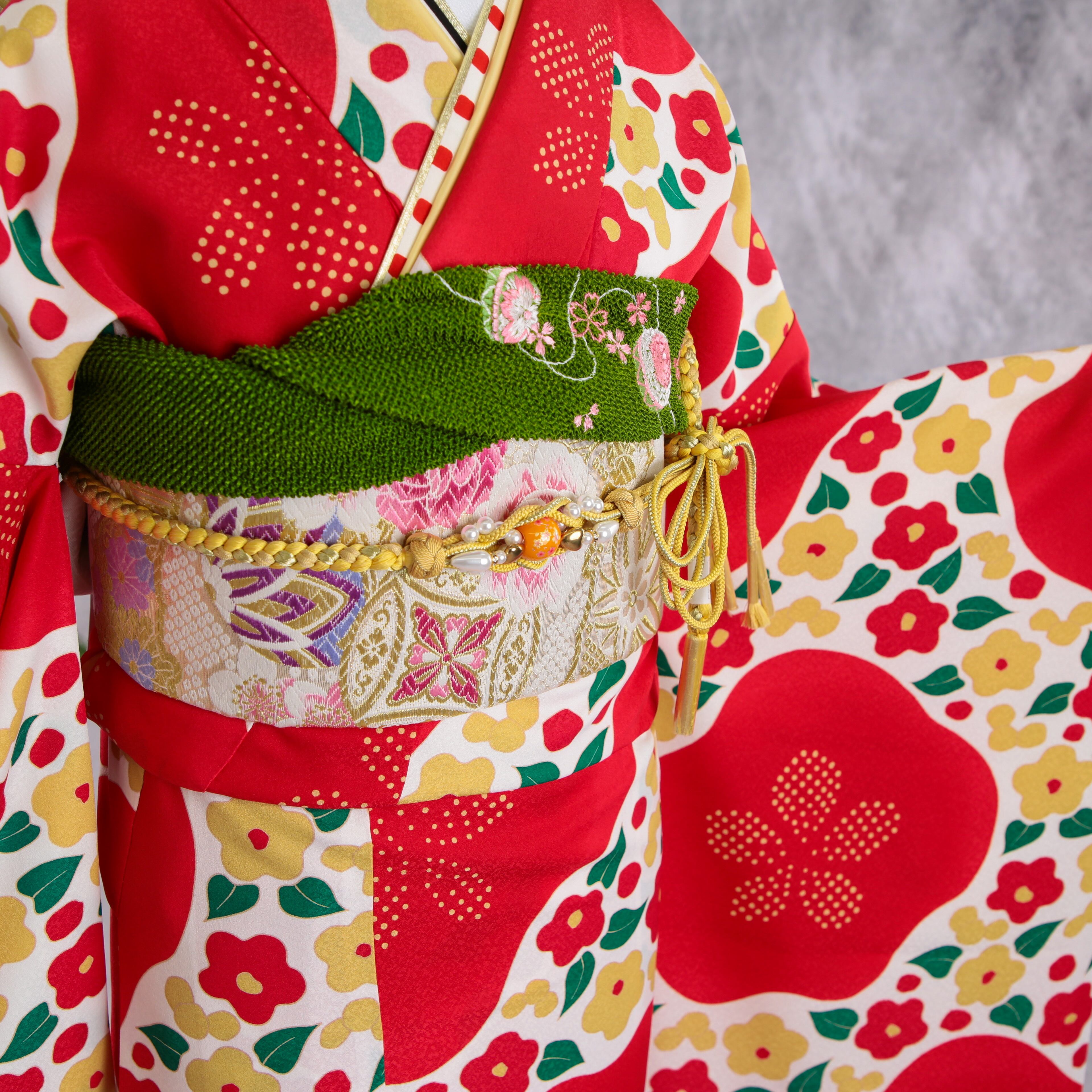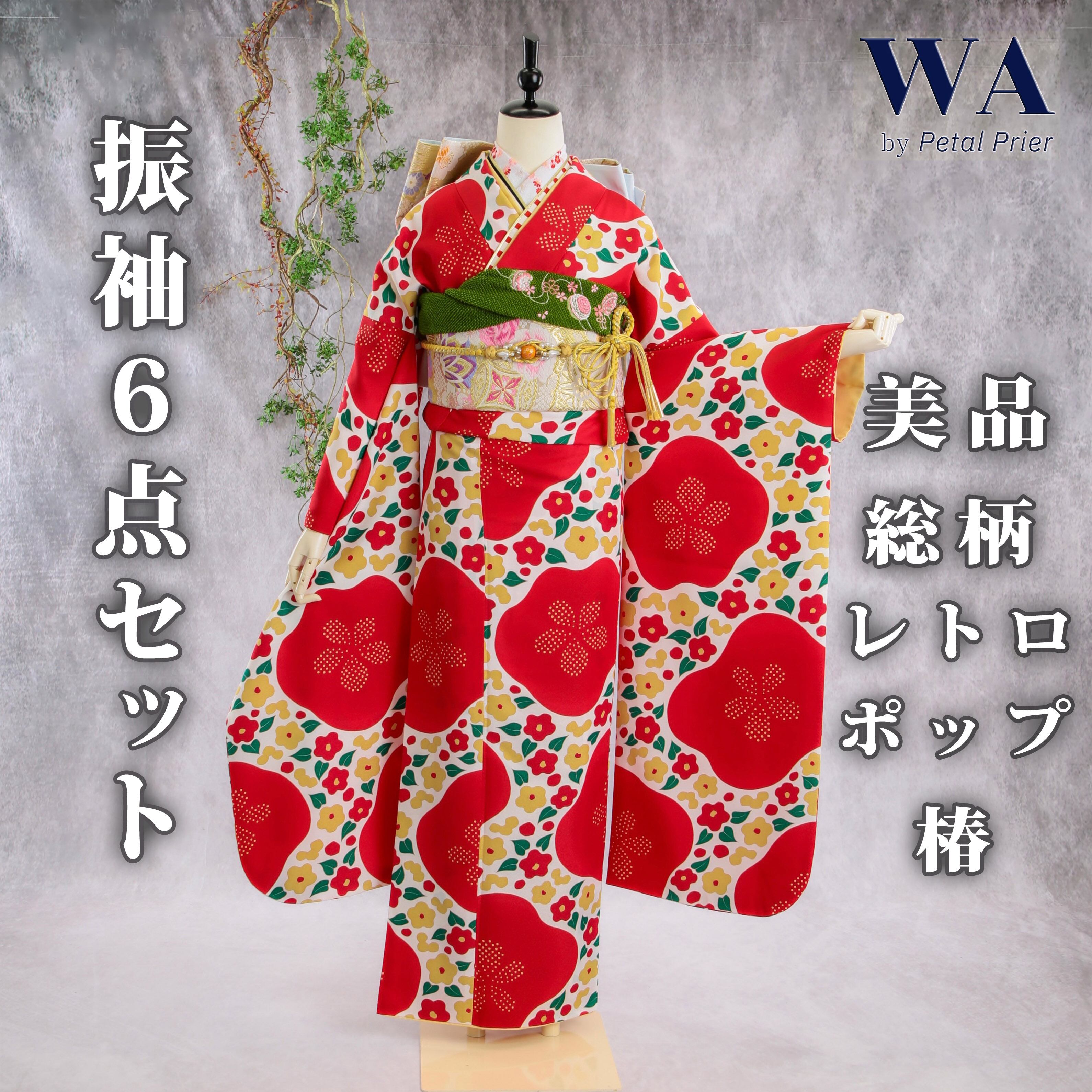 振袖フルセット 振袖セット 振袖 M〜Lサイズ 椿×レトロ 美品 成人式 着物 晴れ着 6点セット FN-399