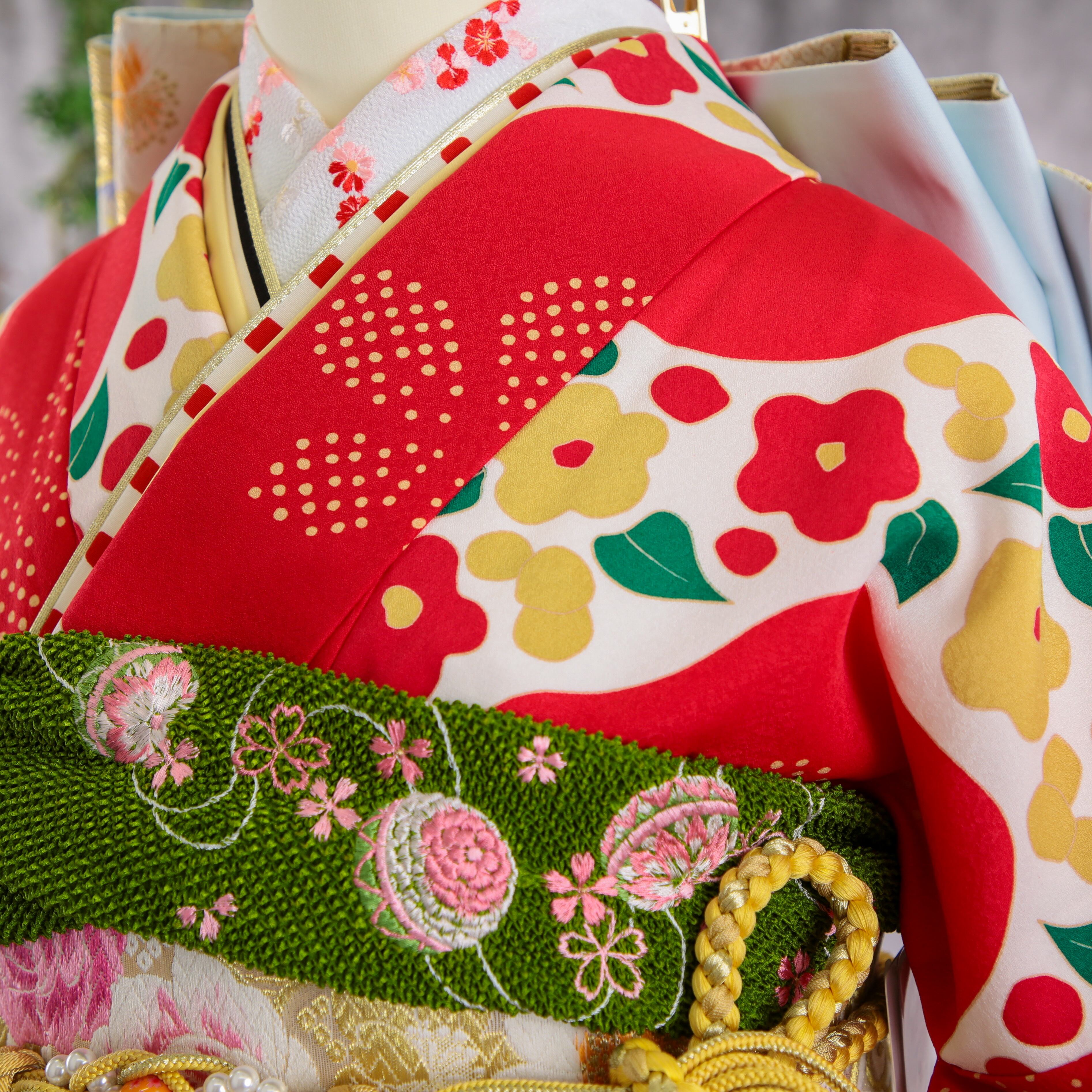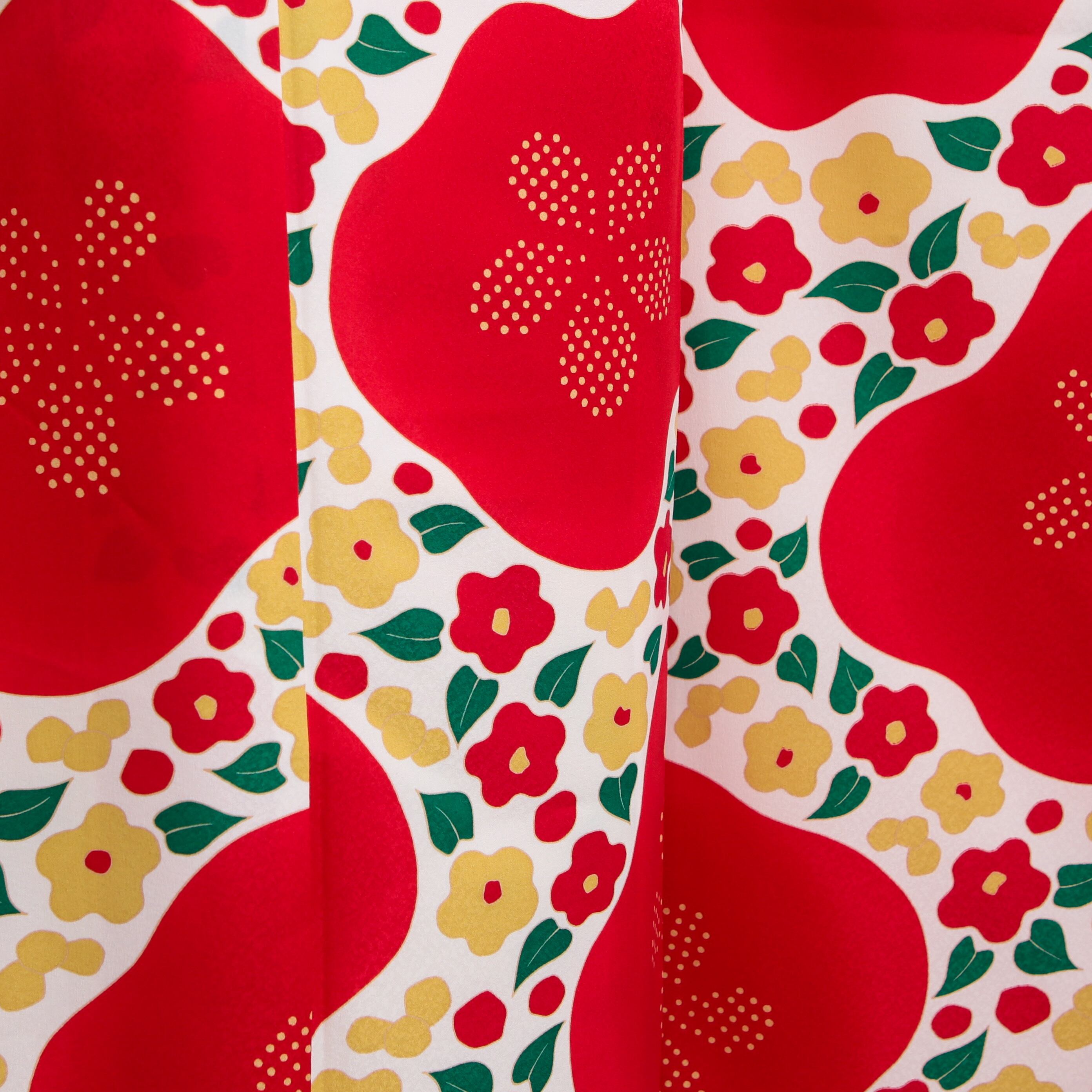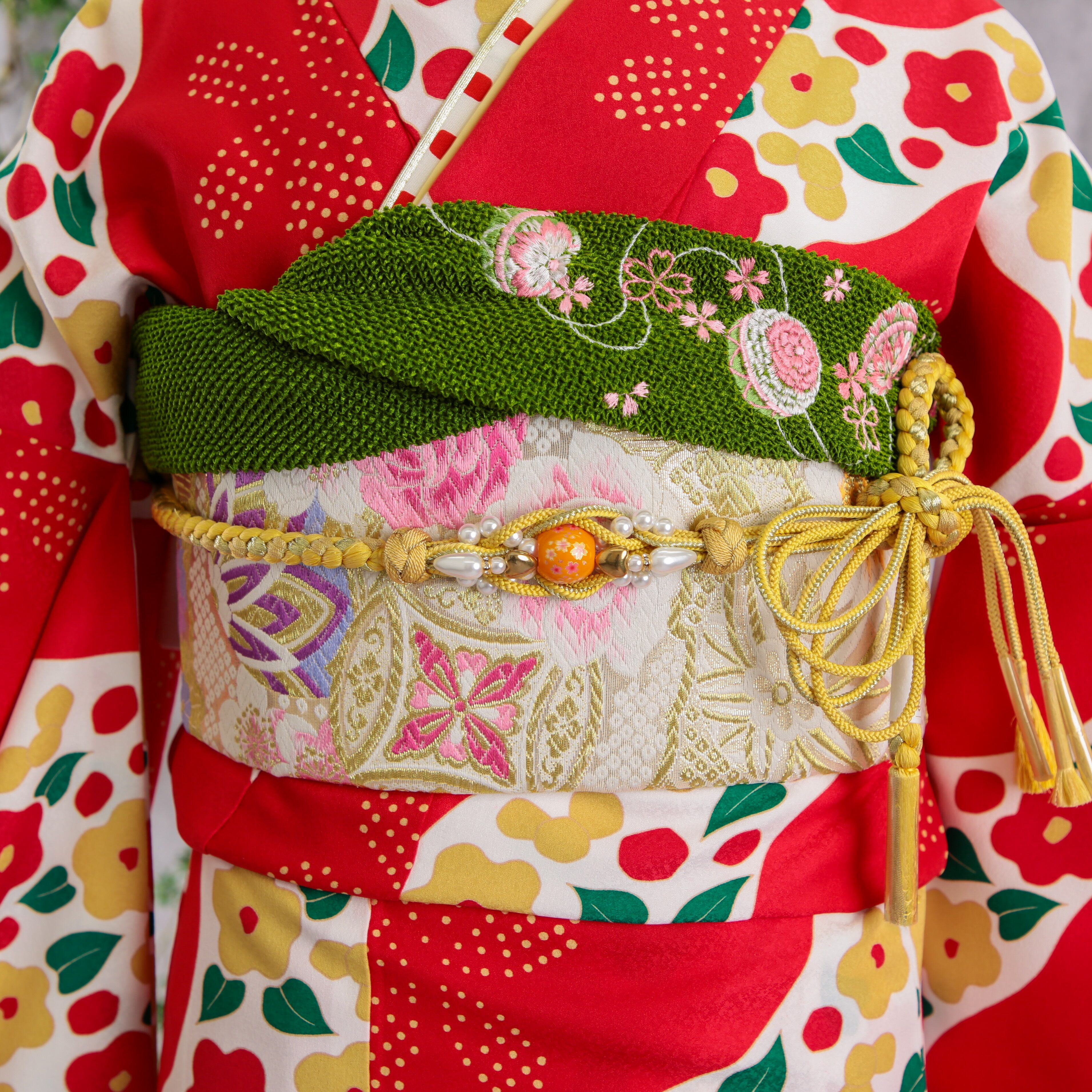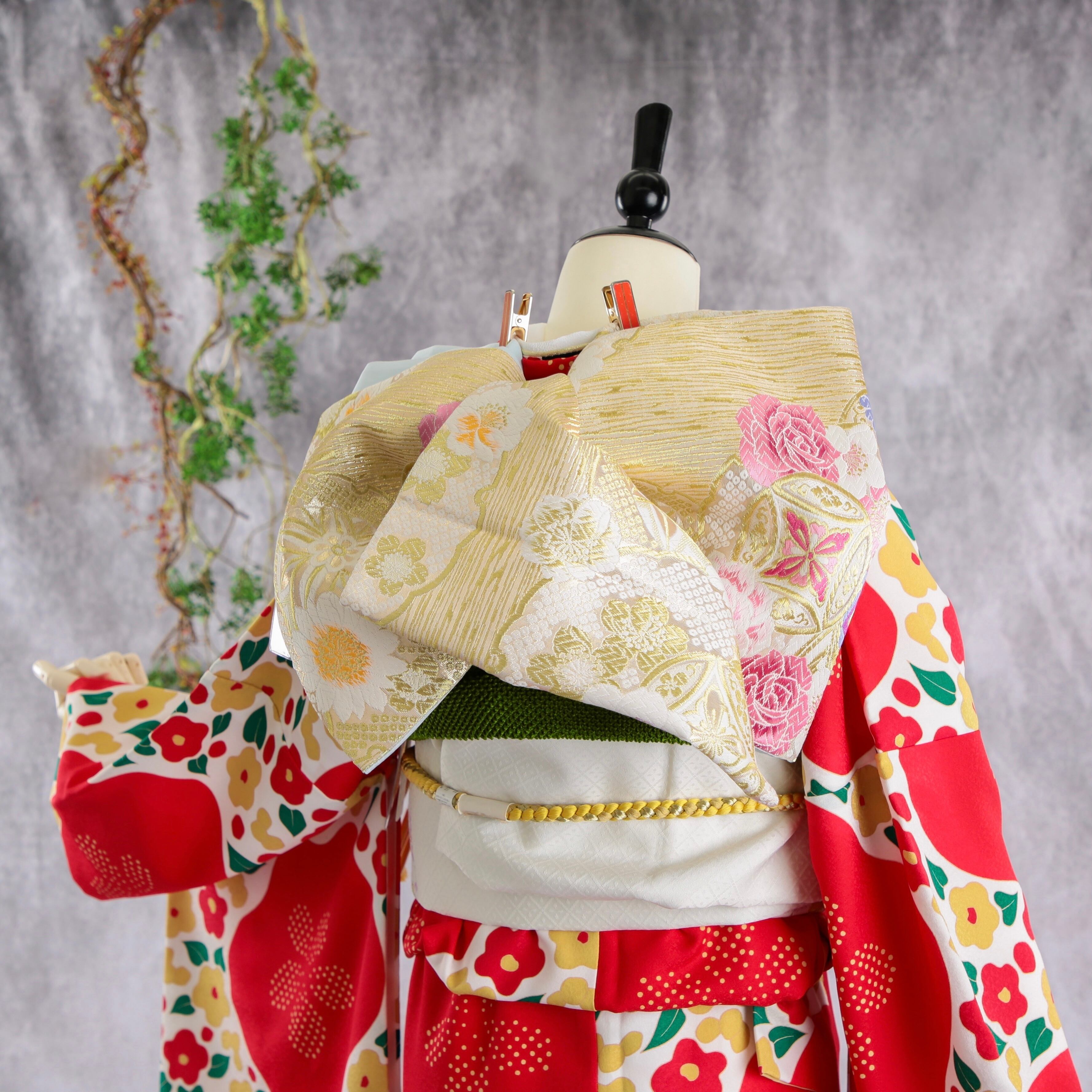振袖フルセット 振袖セット 振袖 M〜Lサイズ 椿×レトロ 美品 成人式 着物 晴れ着 6点セット FN-399