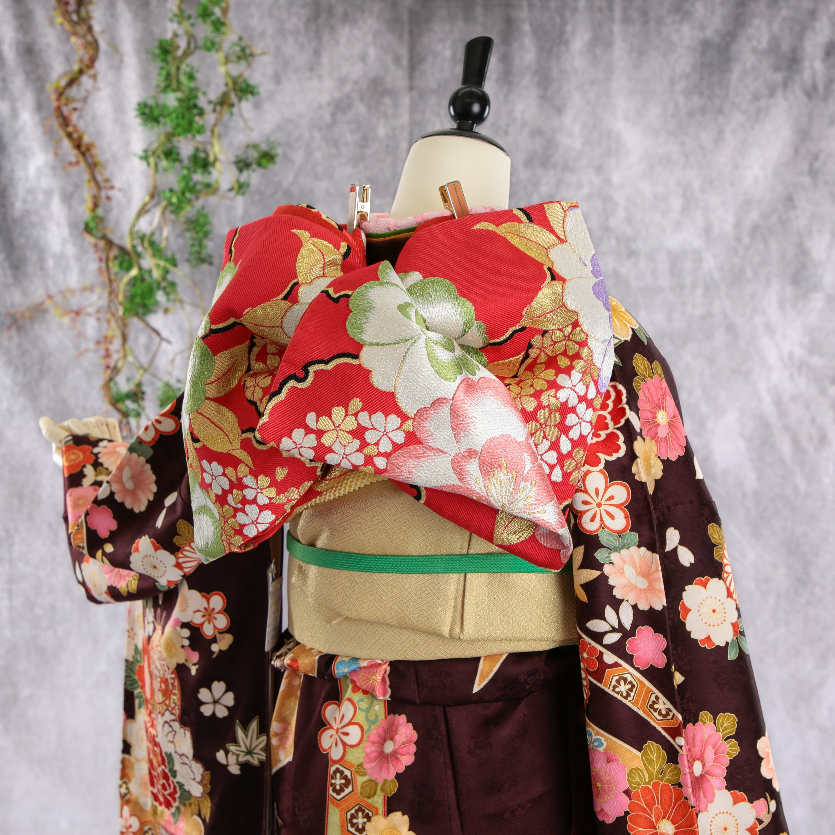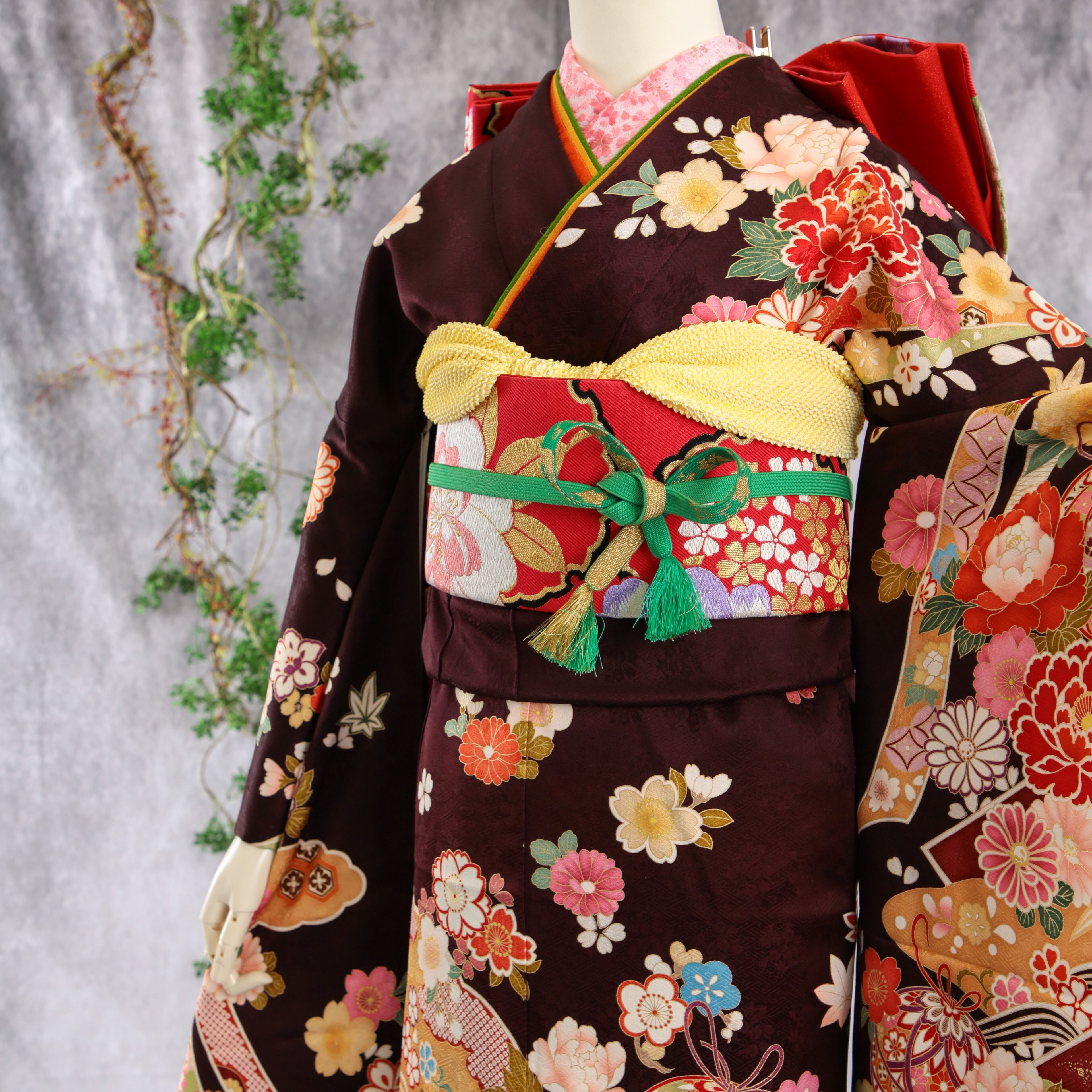 振袖フルセット 振袖セット 振袖 Mサイズ 茶×新古典 美品 成人式 着物 晴れ着 6点セット FN-409