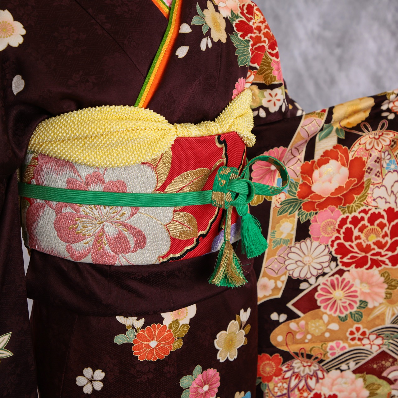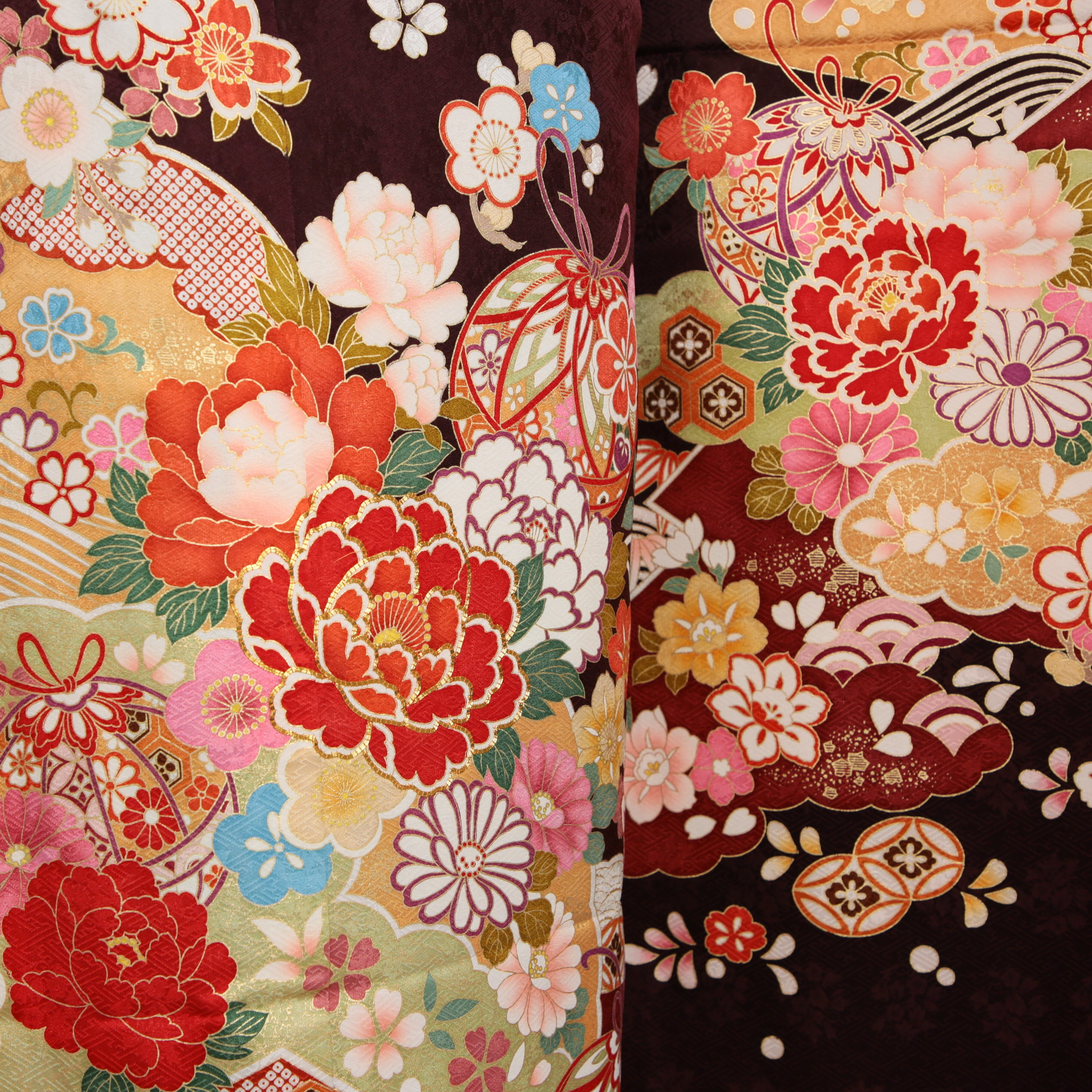 茶色地に熨斗や鞠が印象的な新古典振袖です。