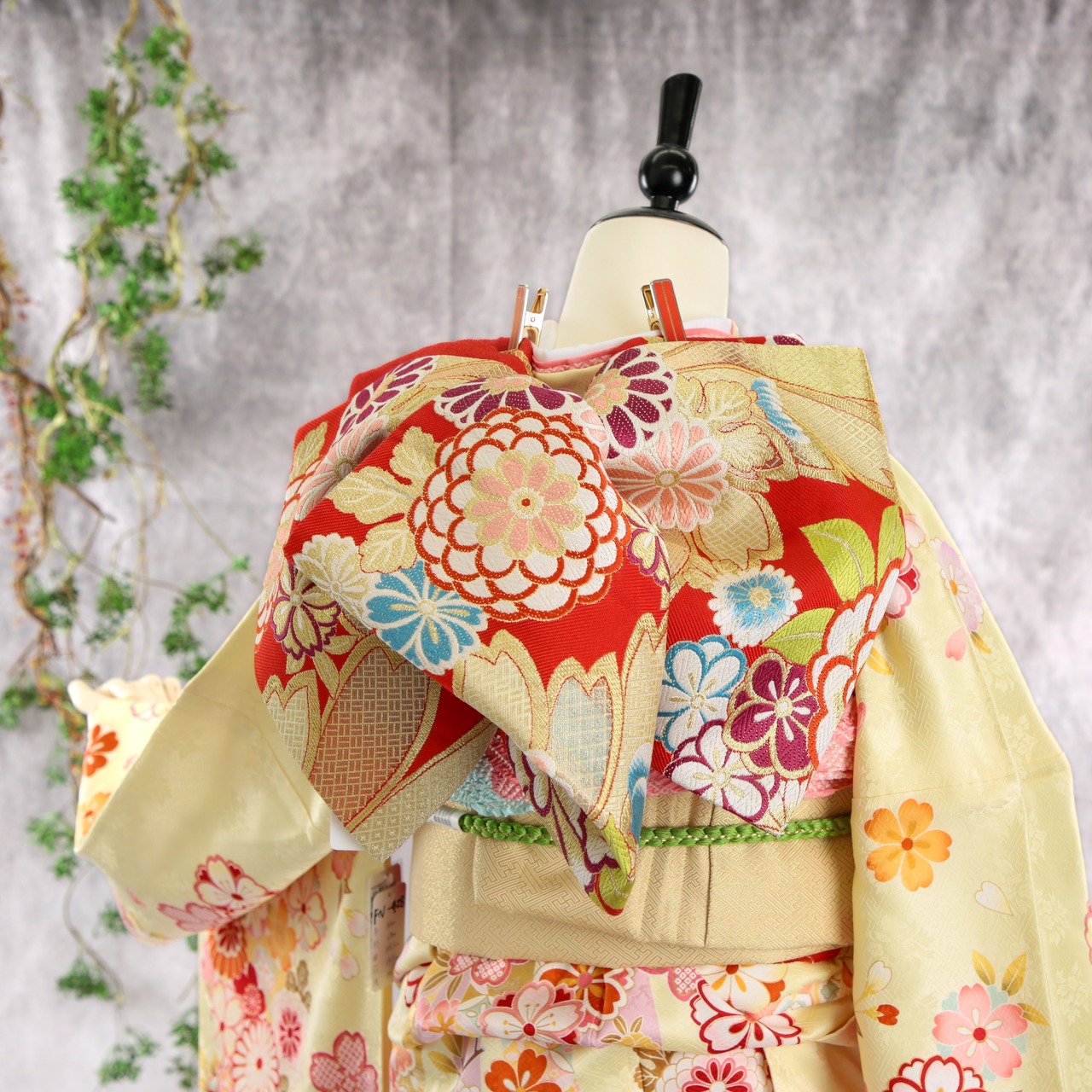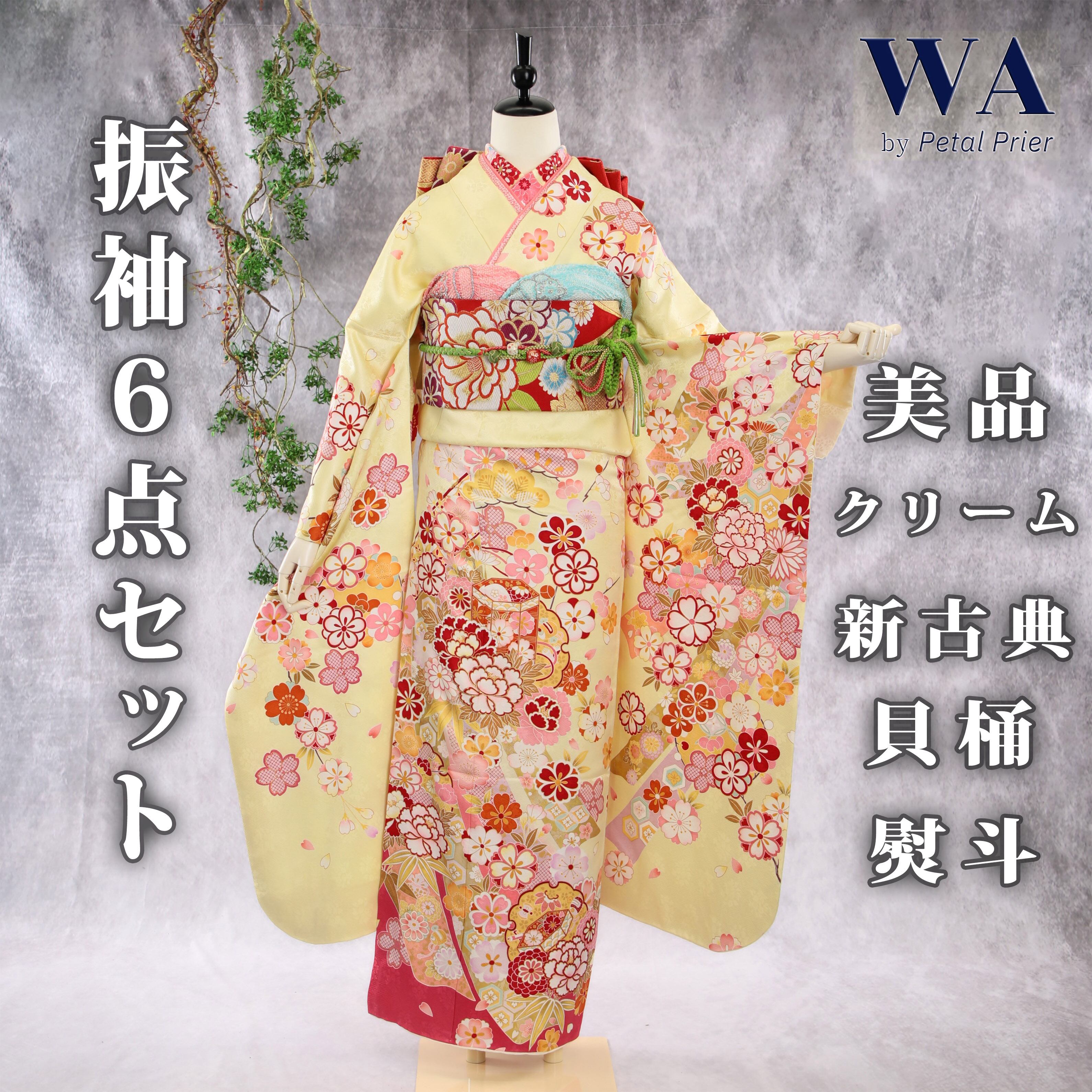 振袖フルセット 振袖セット 振袖 M〜Lサイズ クリーム×新古典 美品 成人式 着物 晴れ着 6点セット FN-428