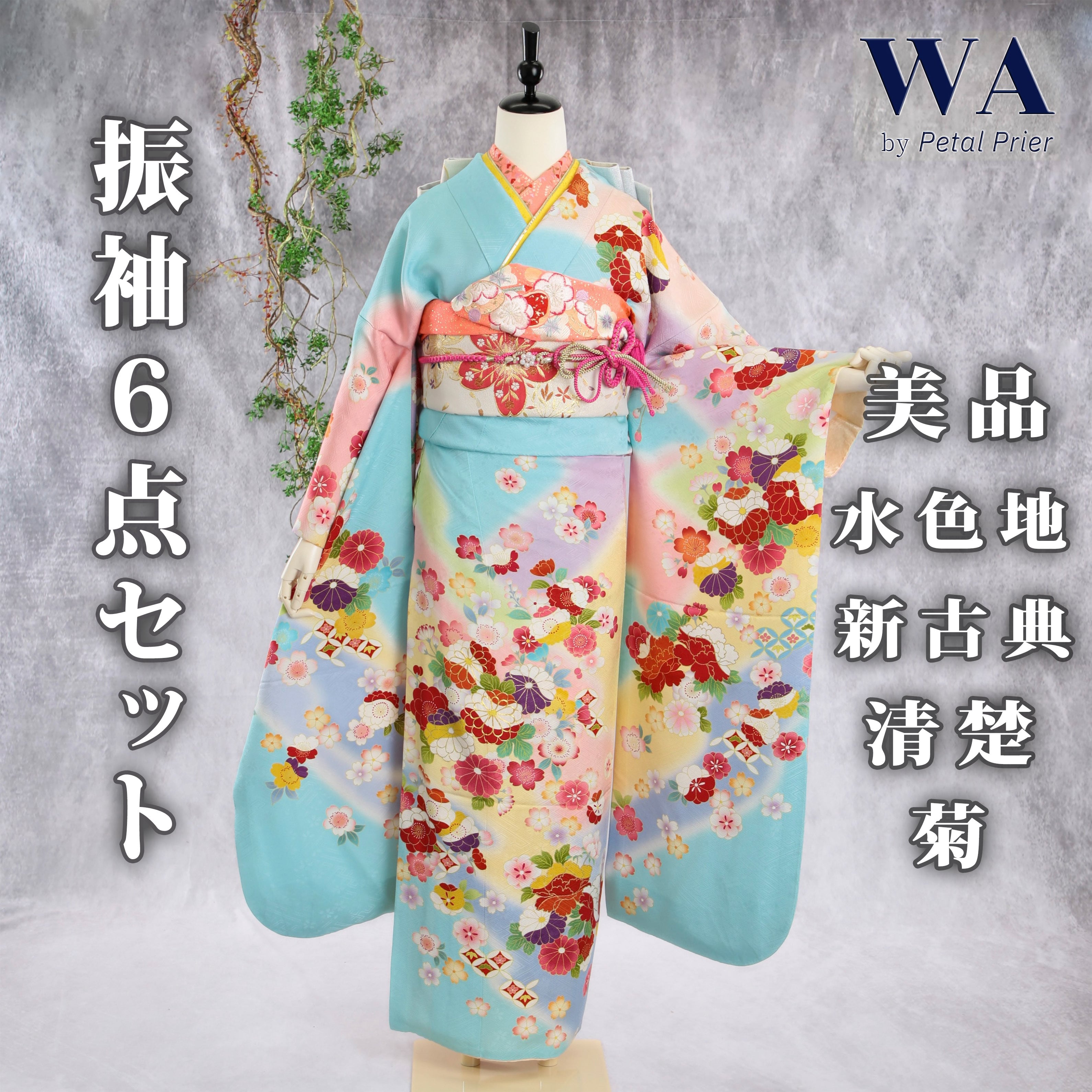 振袖フルセット 振袖セット 振袖 Mサイズ 水色×新古典 美品 成人式 着物 晴れ着 6点セット FN-442