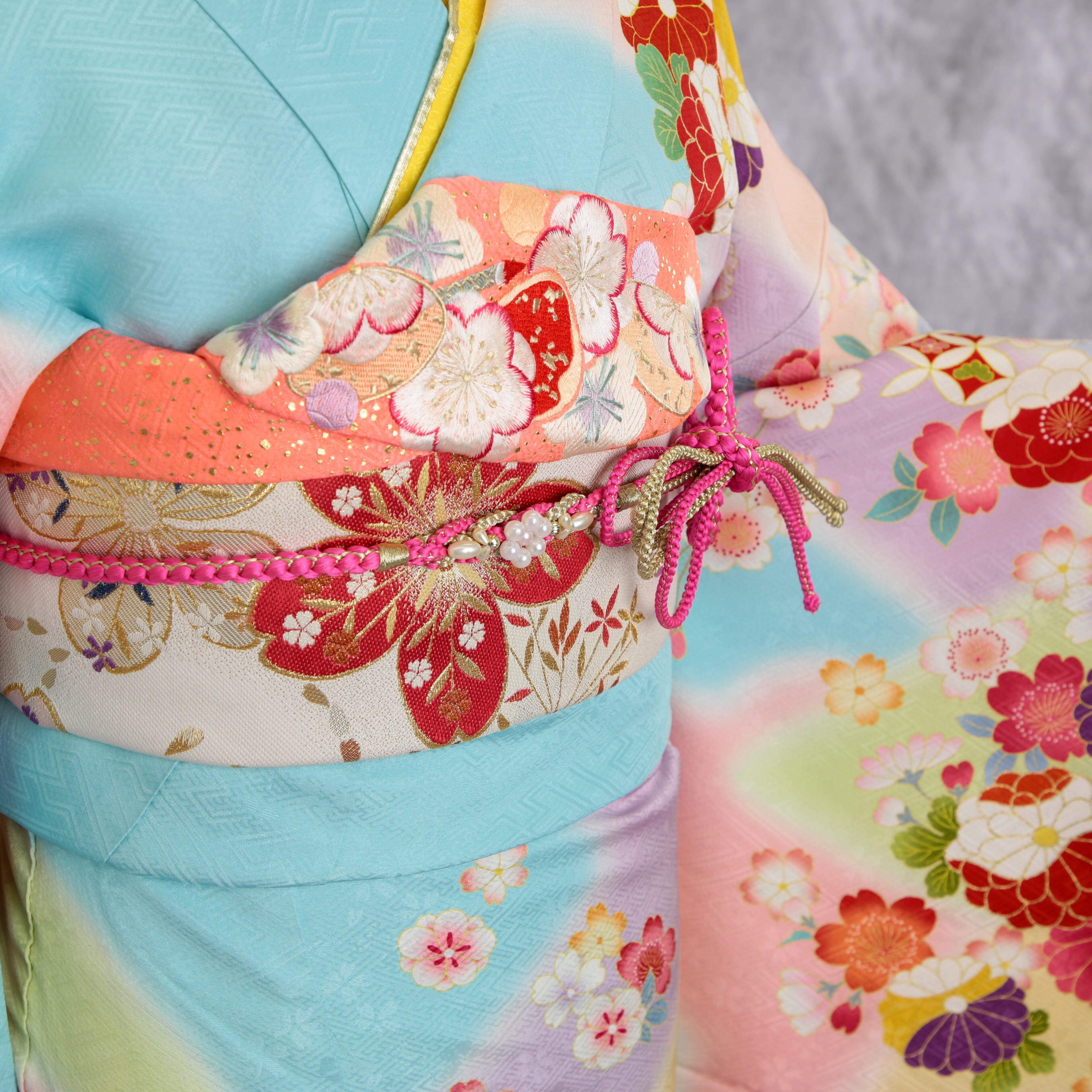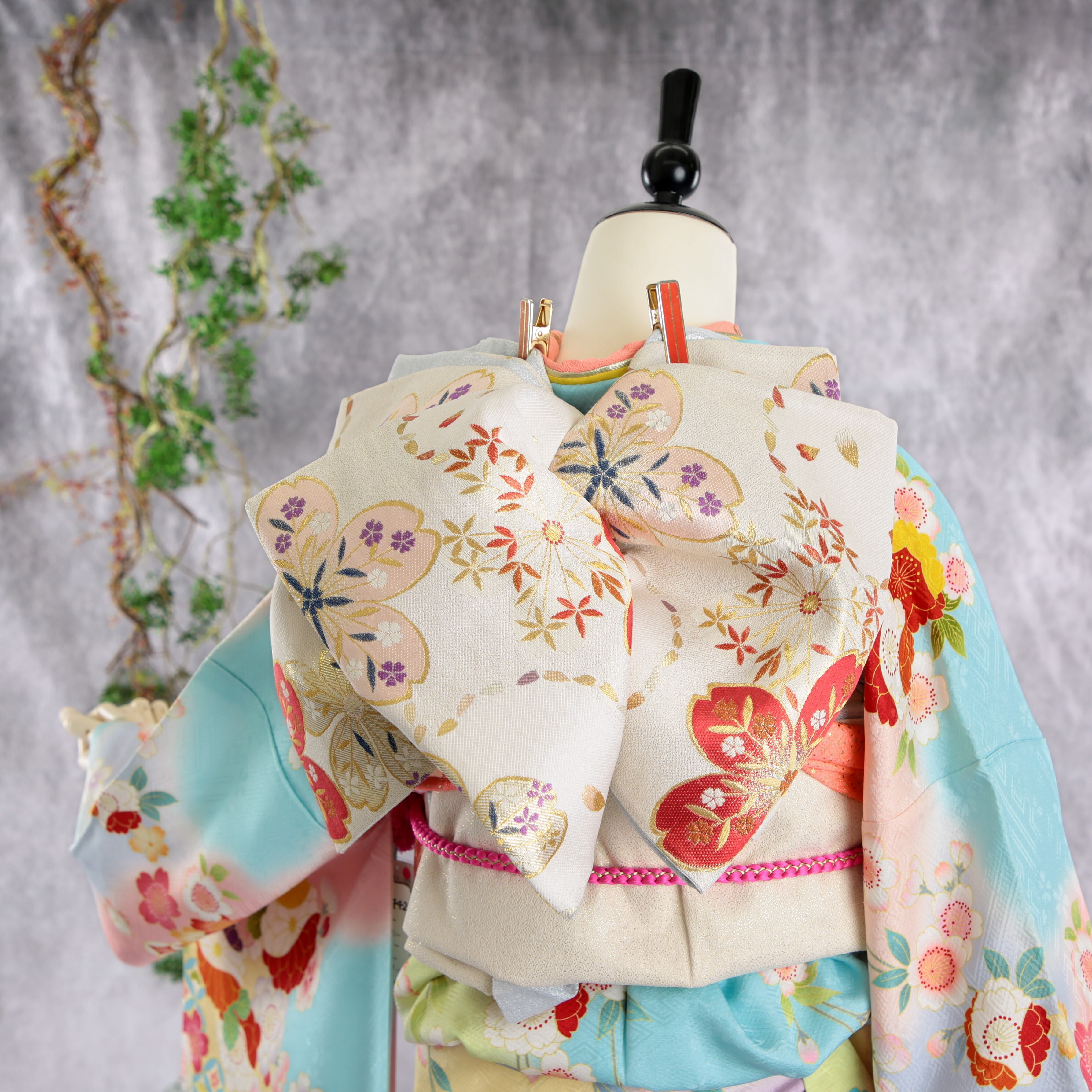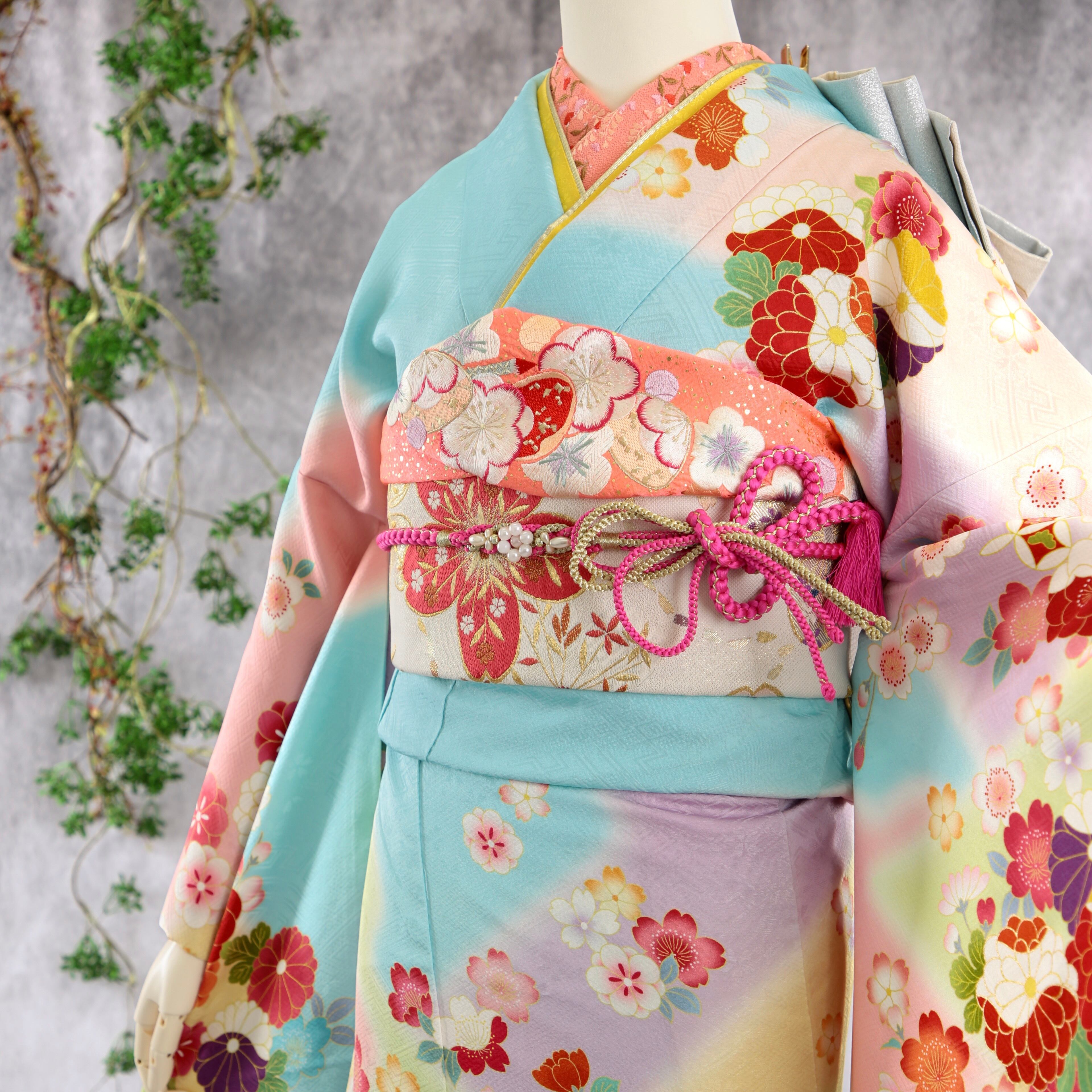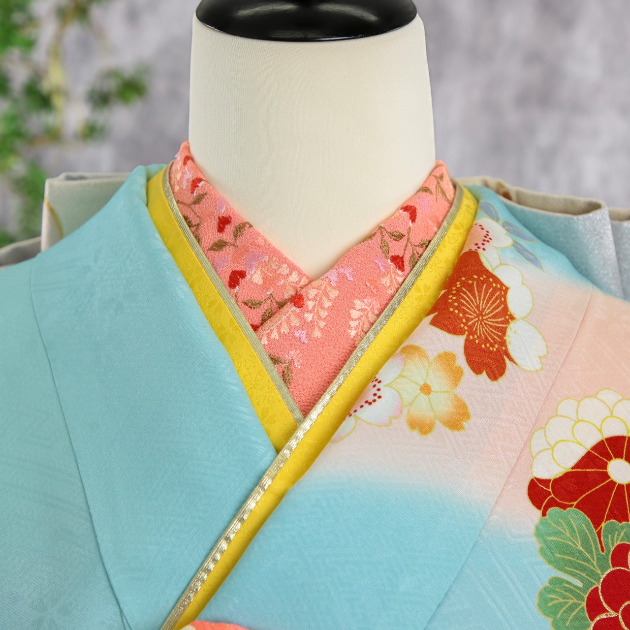 すっきりとした爽やかな水色地に菊や桜が印象的な振袖です。