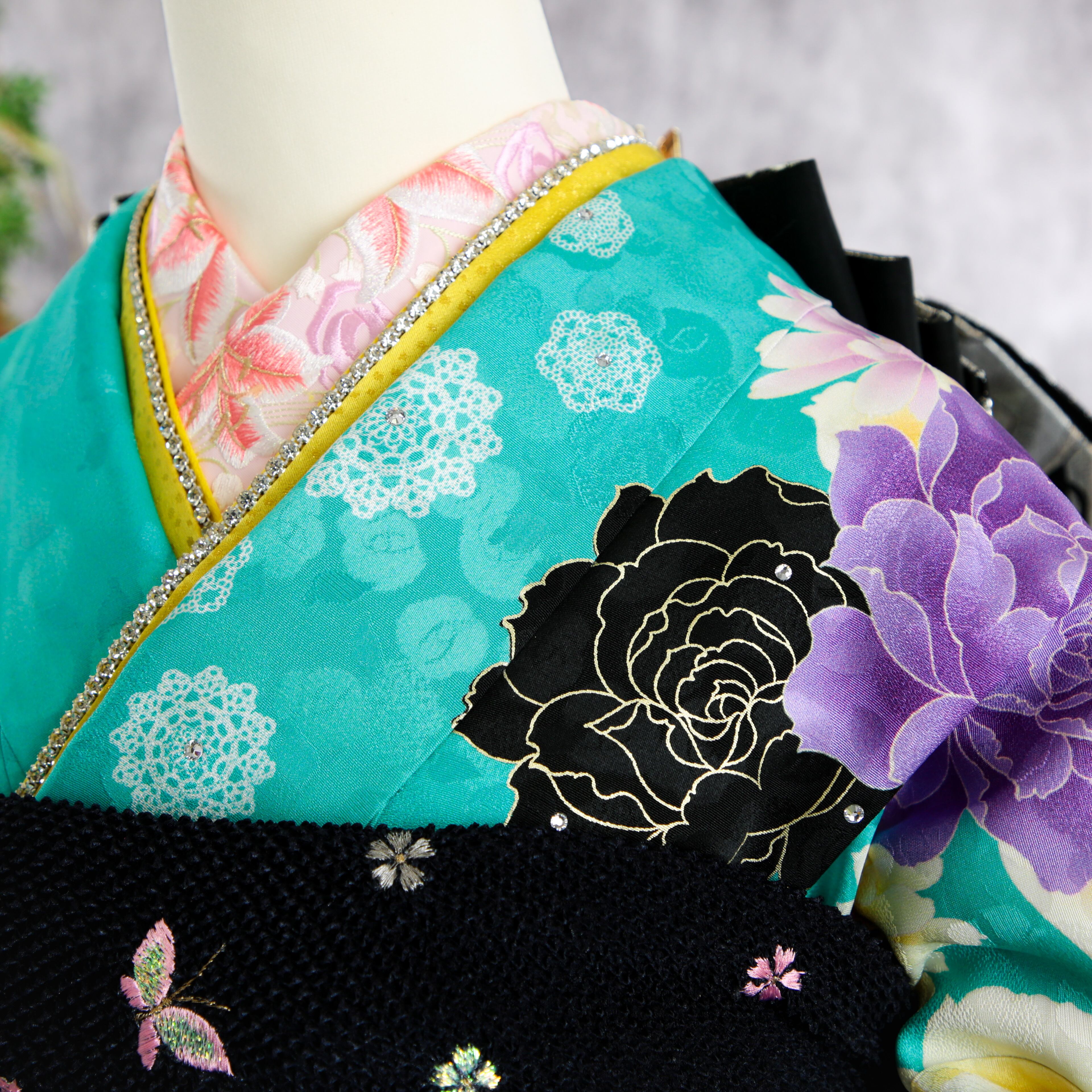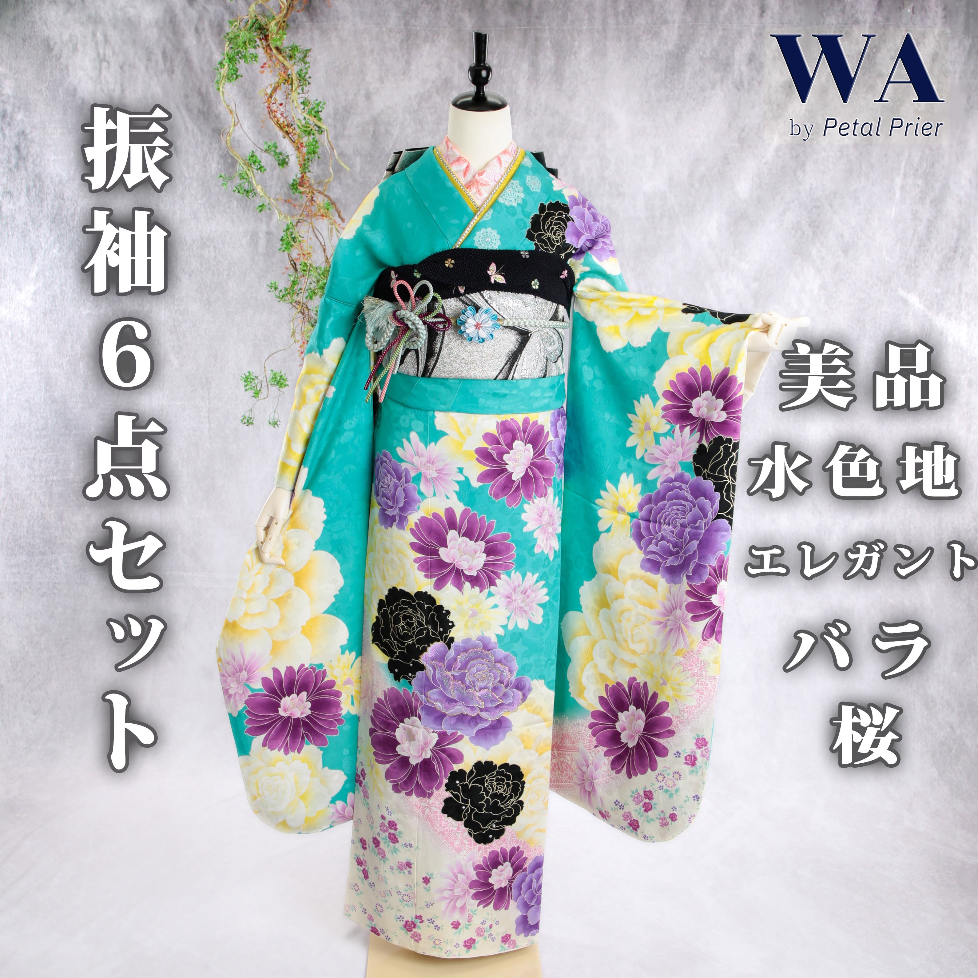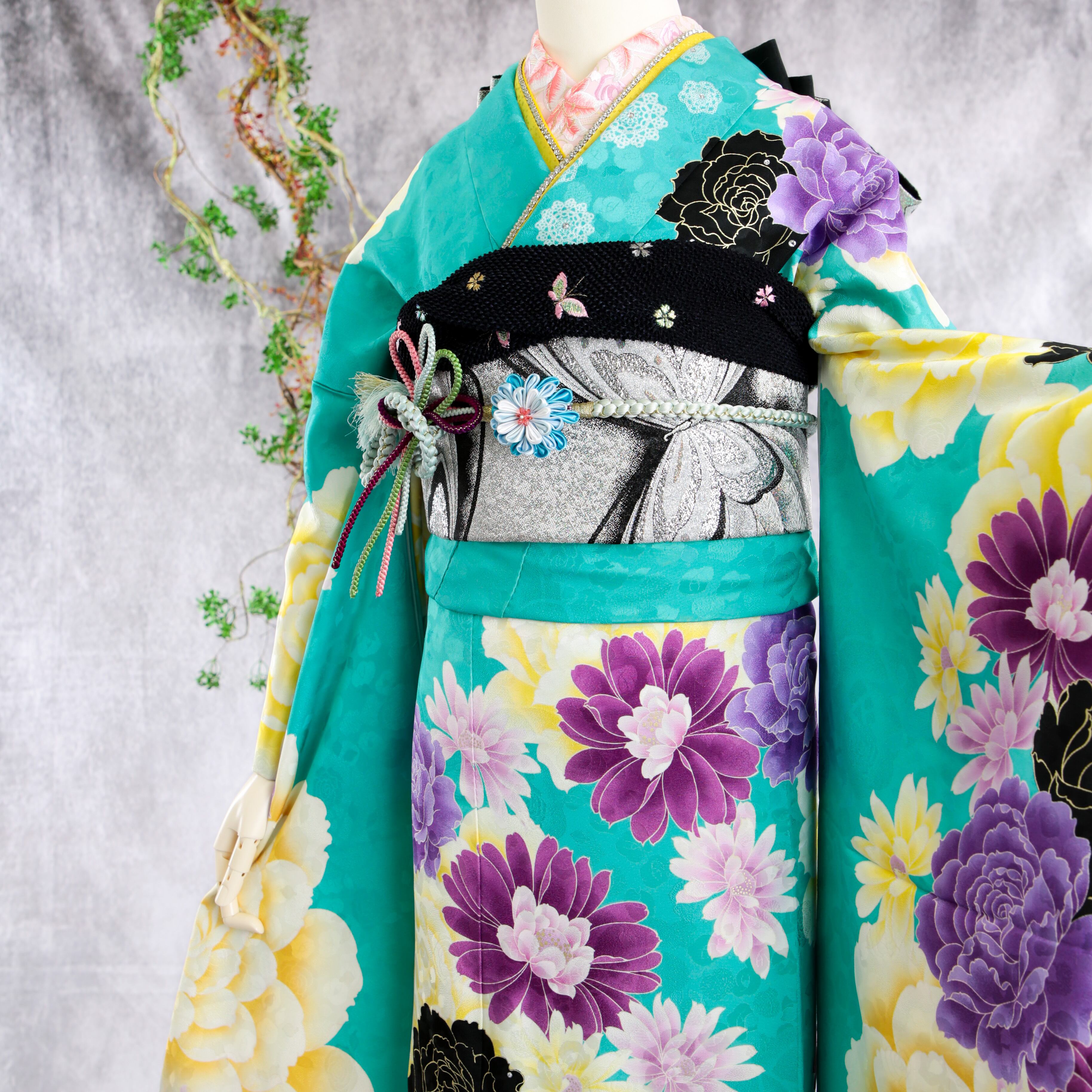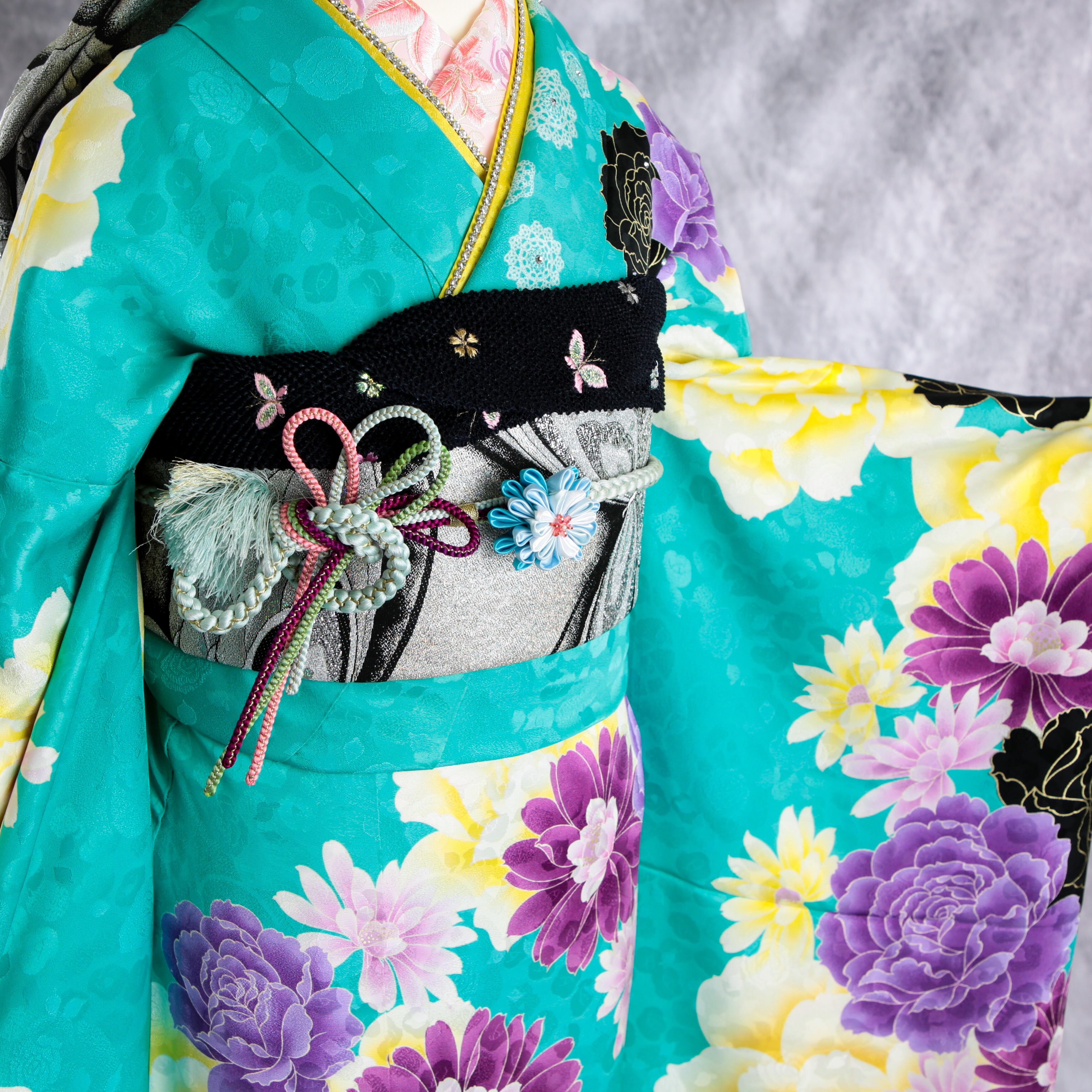 爽やかな水色地に薔薇や桜が華やかな振袖です。