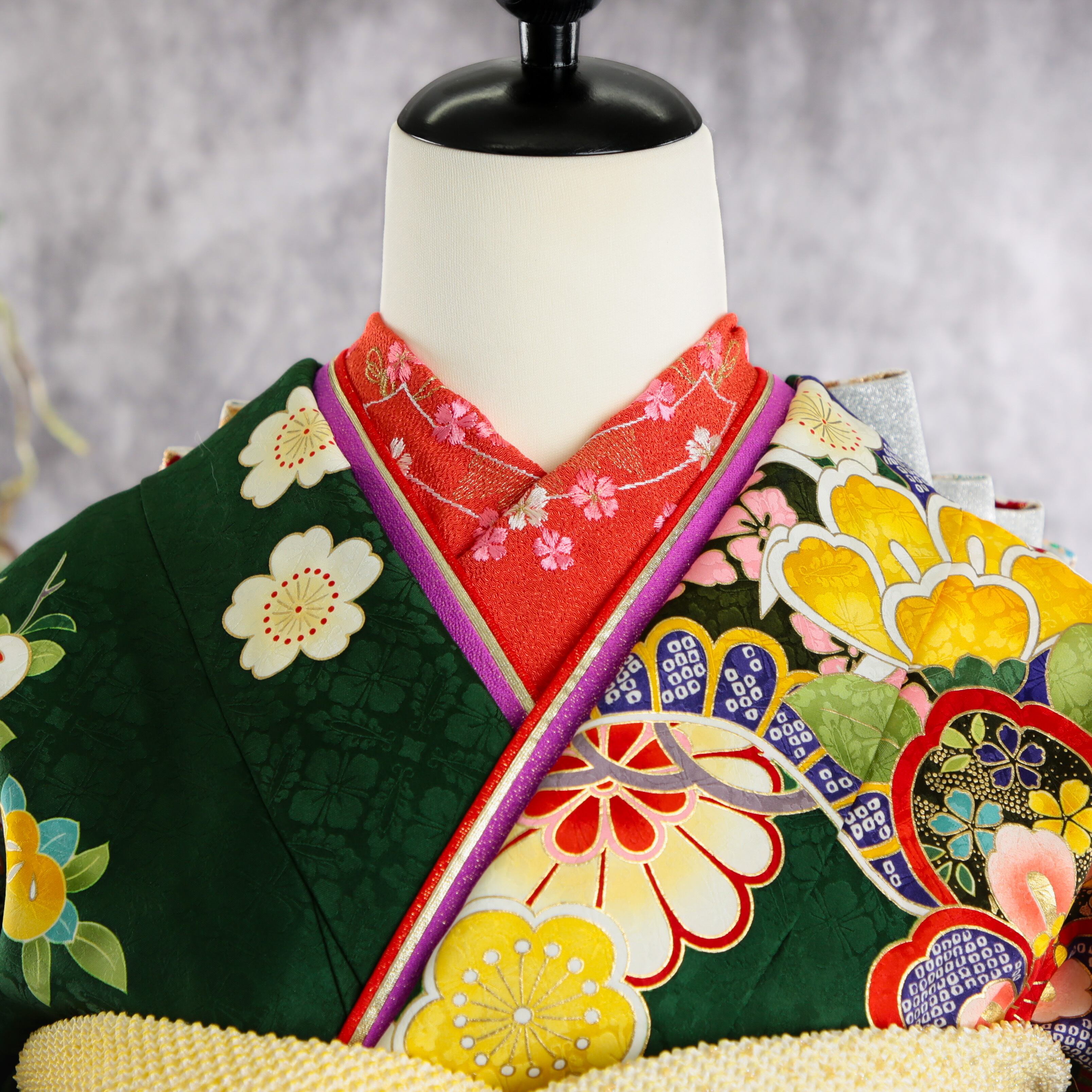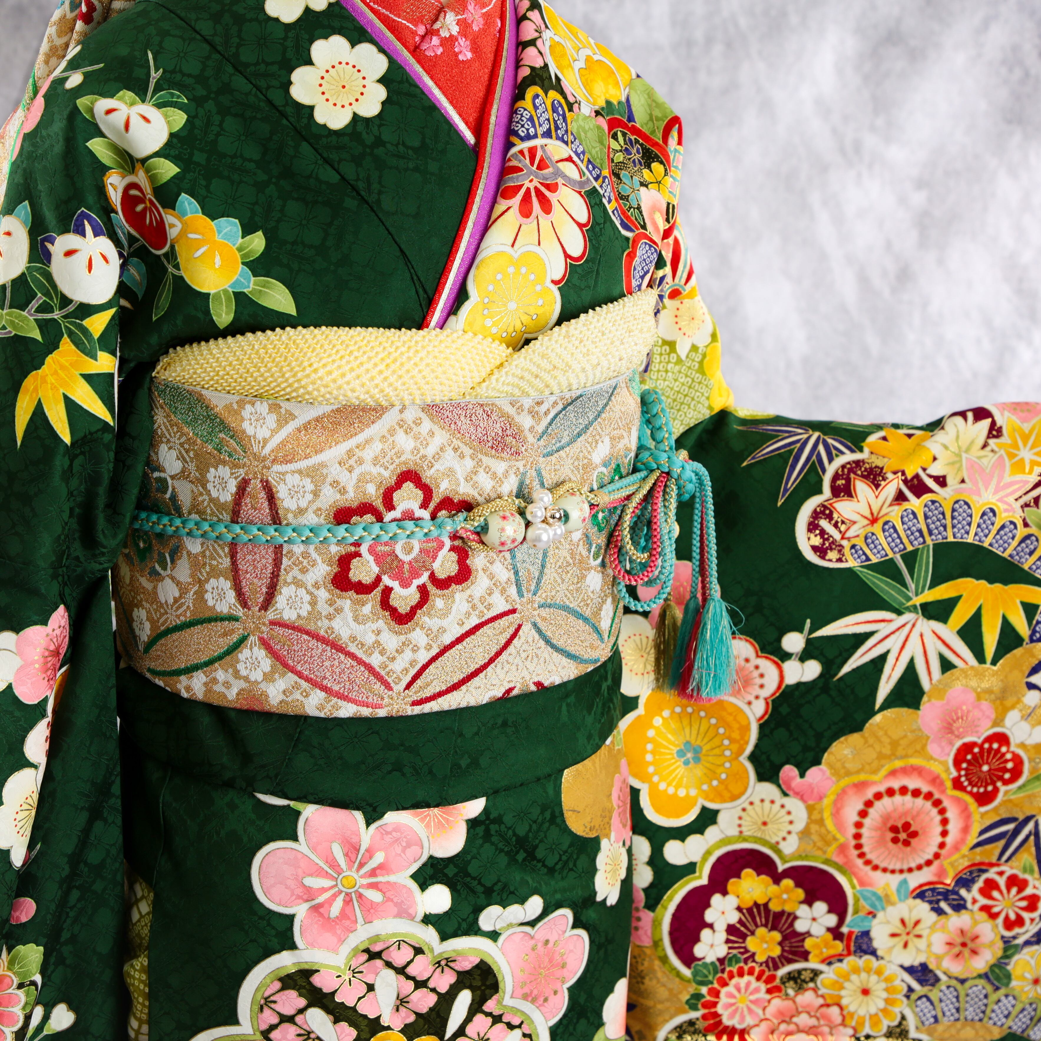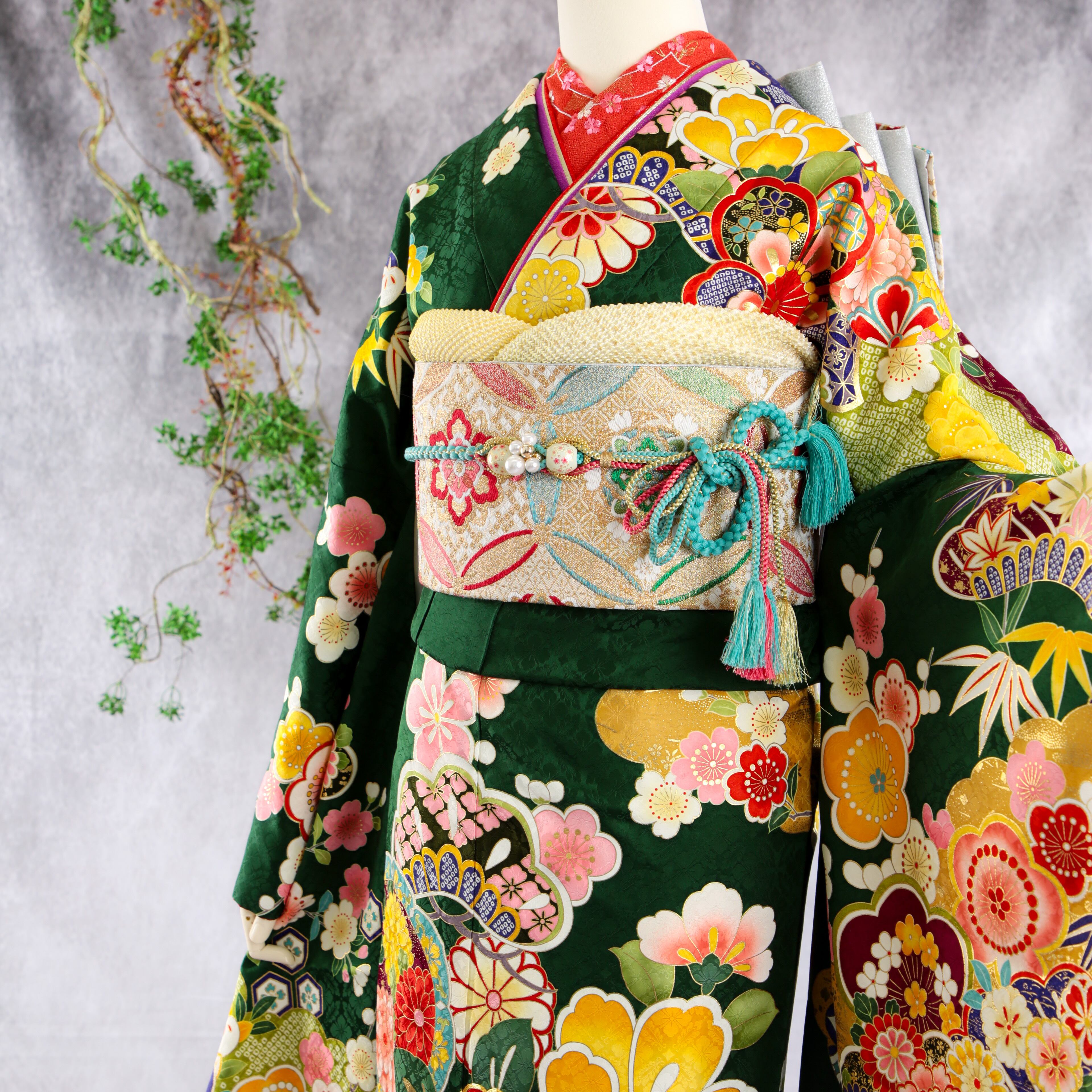 緑地に松竹梅や桜が華やかな古典振袖です。