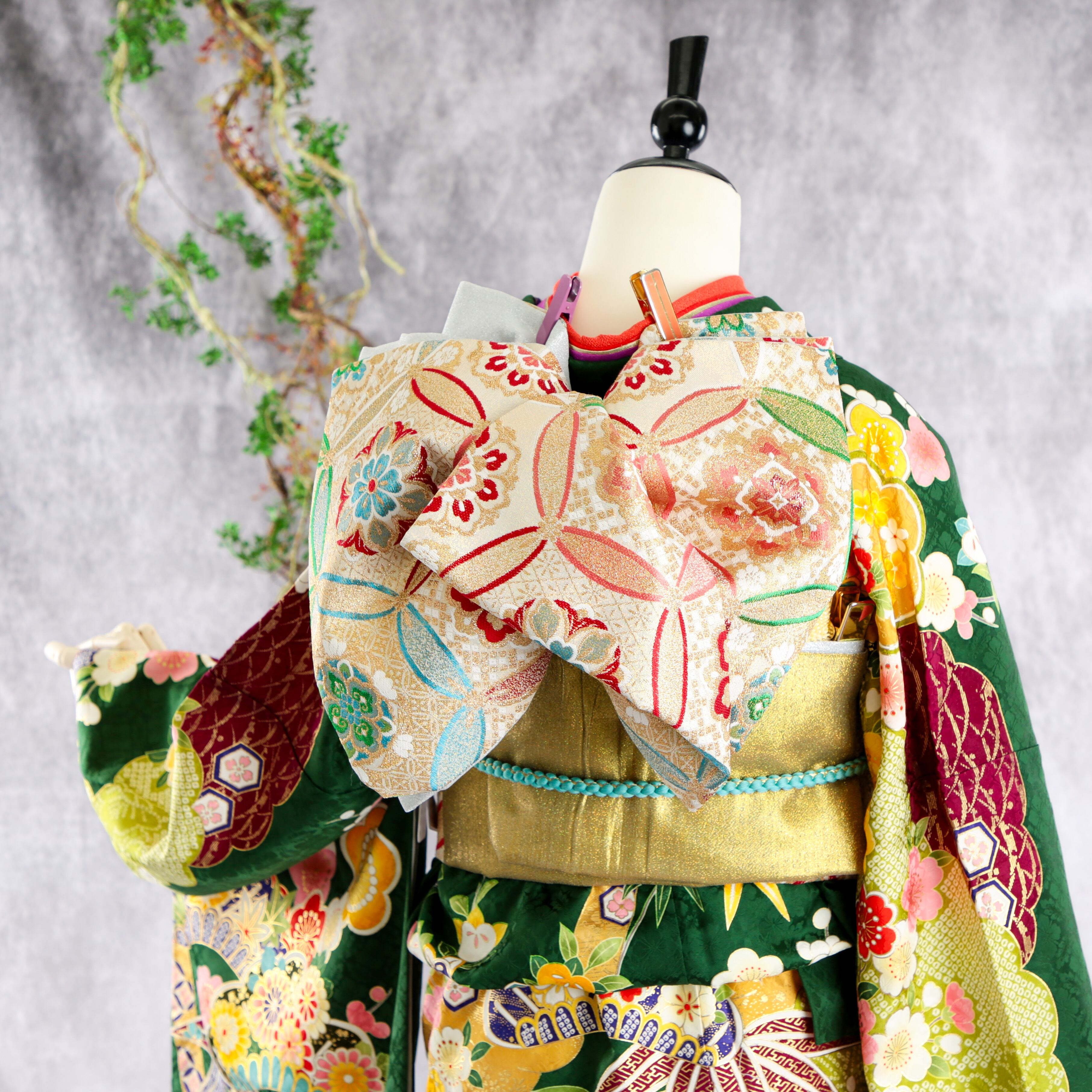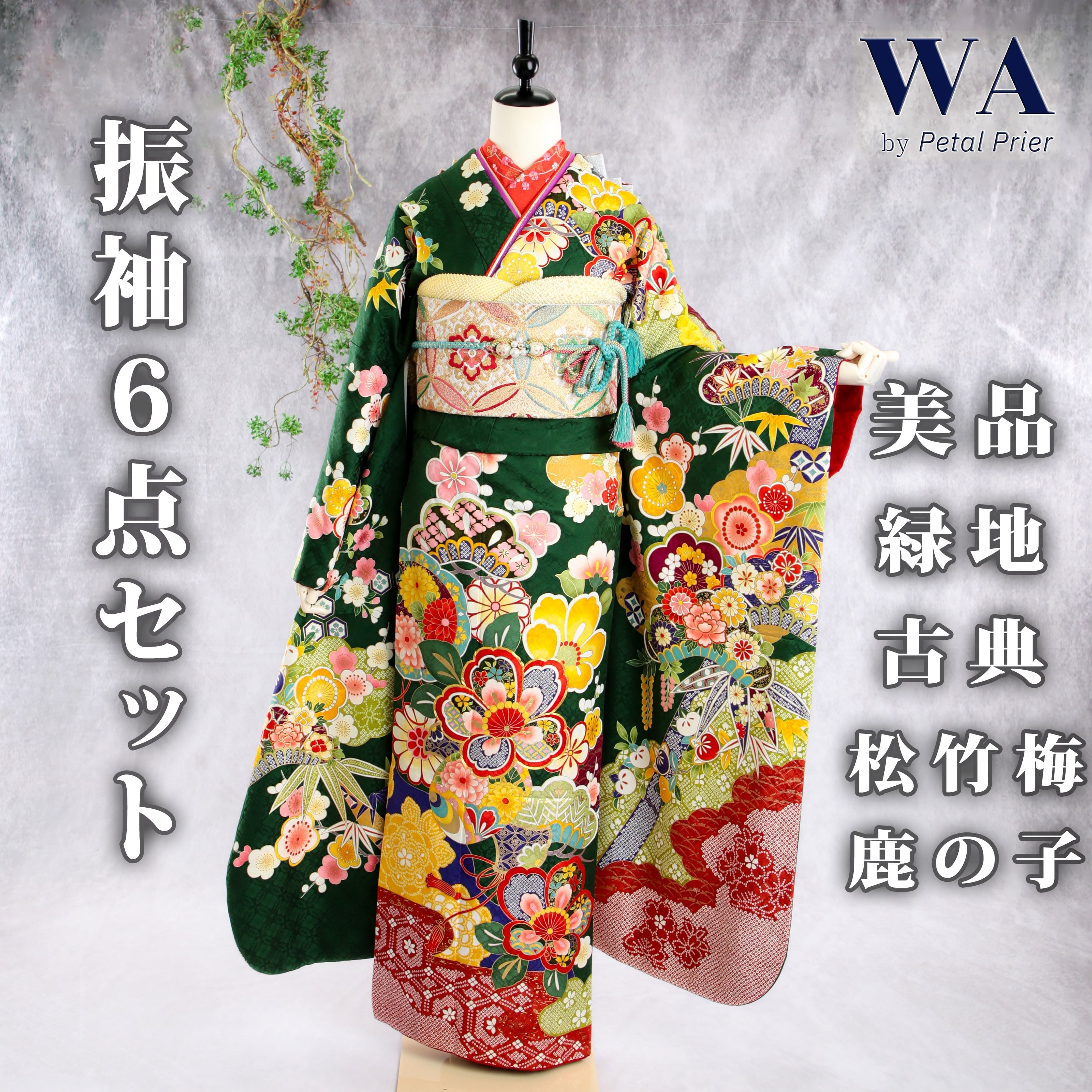 振袖フルセット 振袖セット 振袖 LLサイズ 緑×古典 美品 成人式 着物 晴れ着 6点セット FN-501