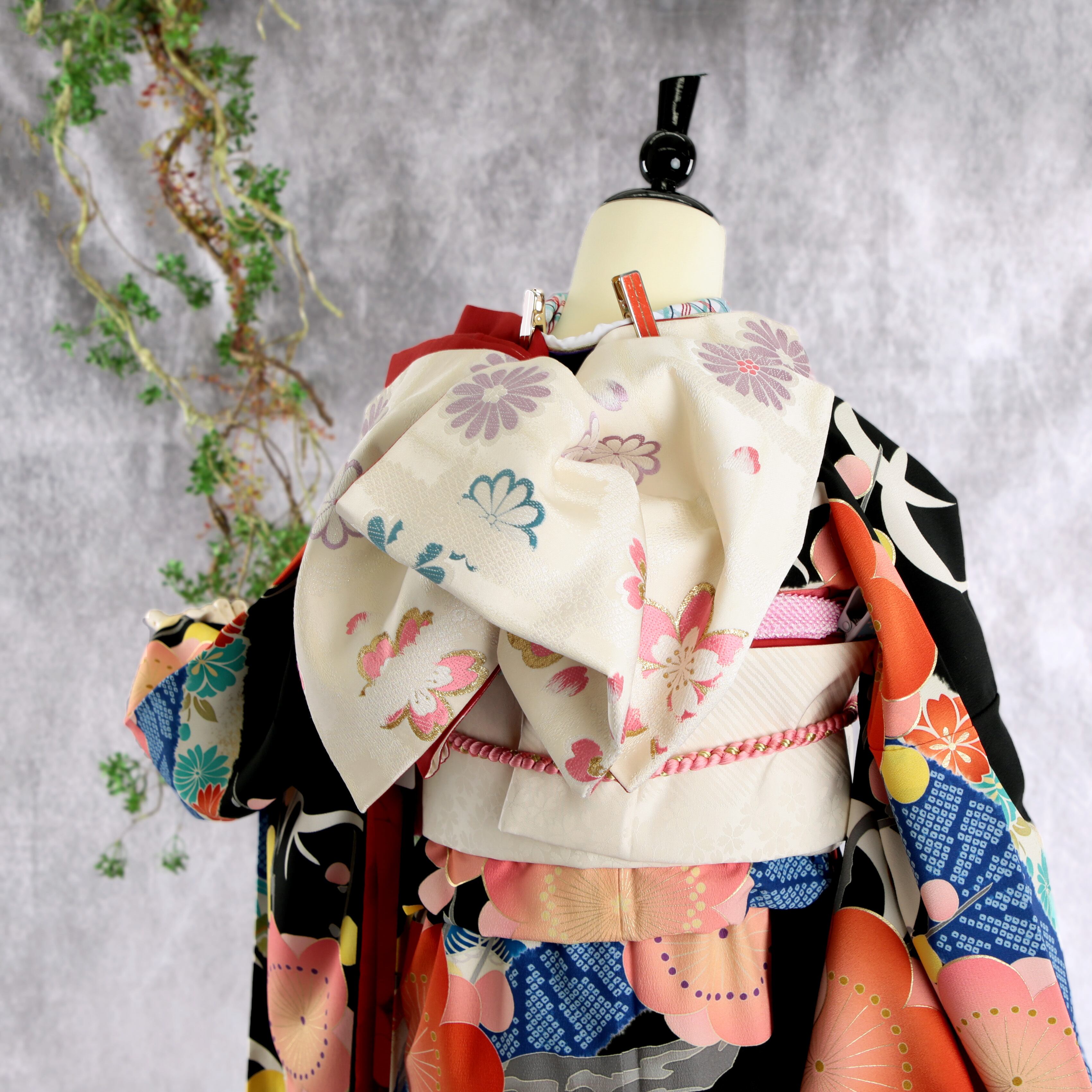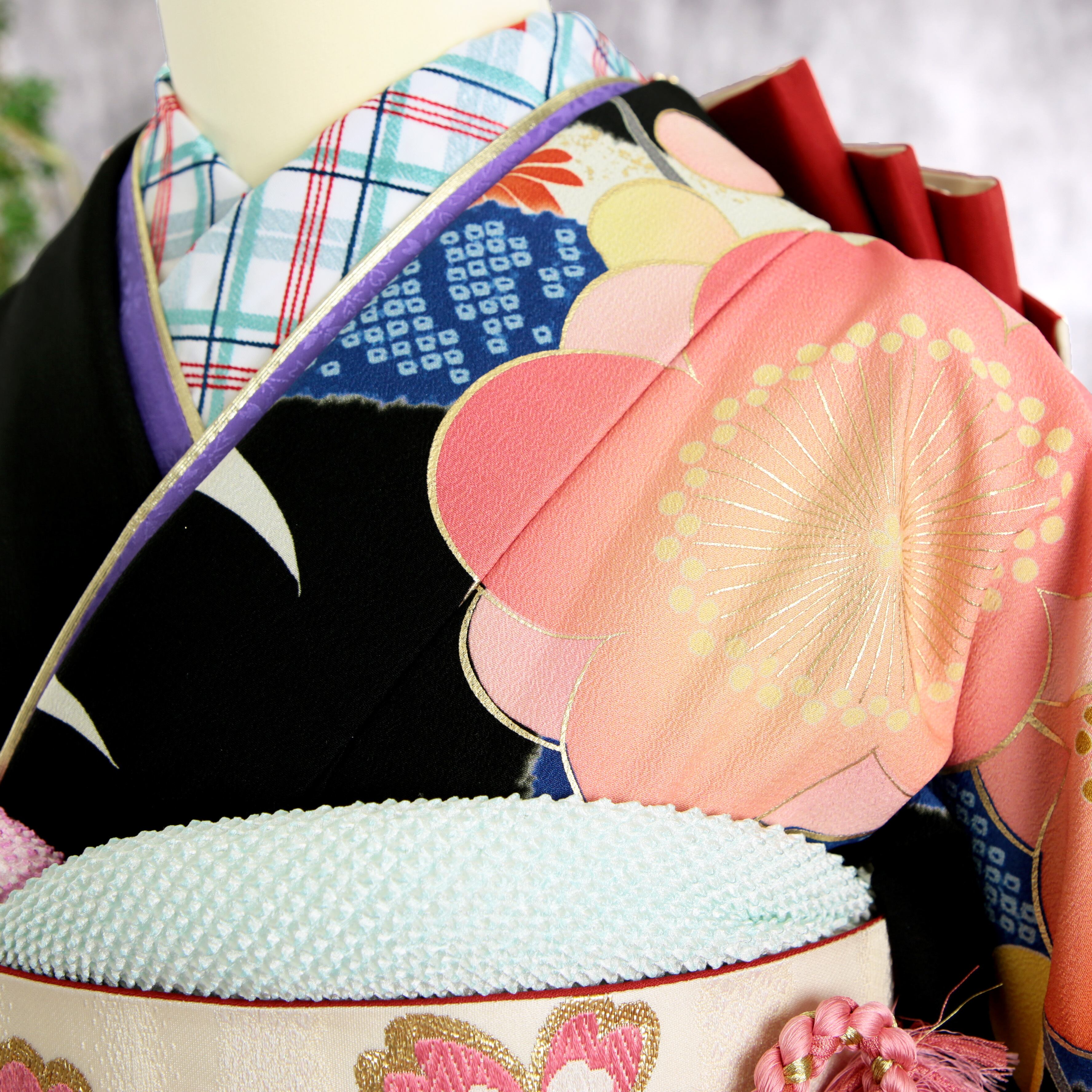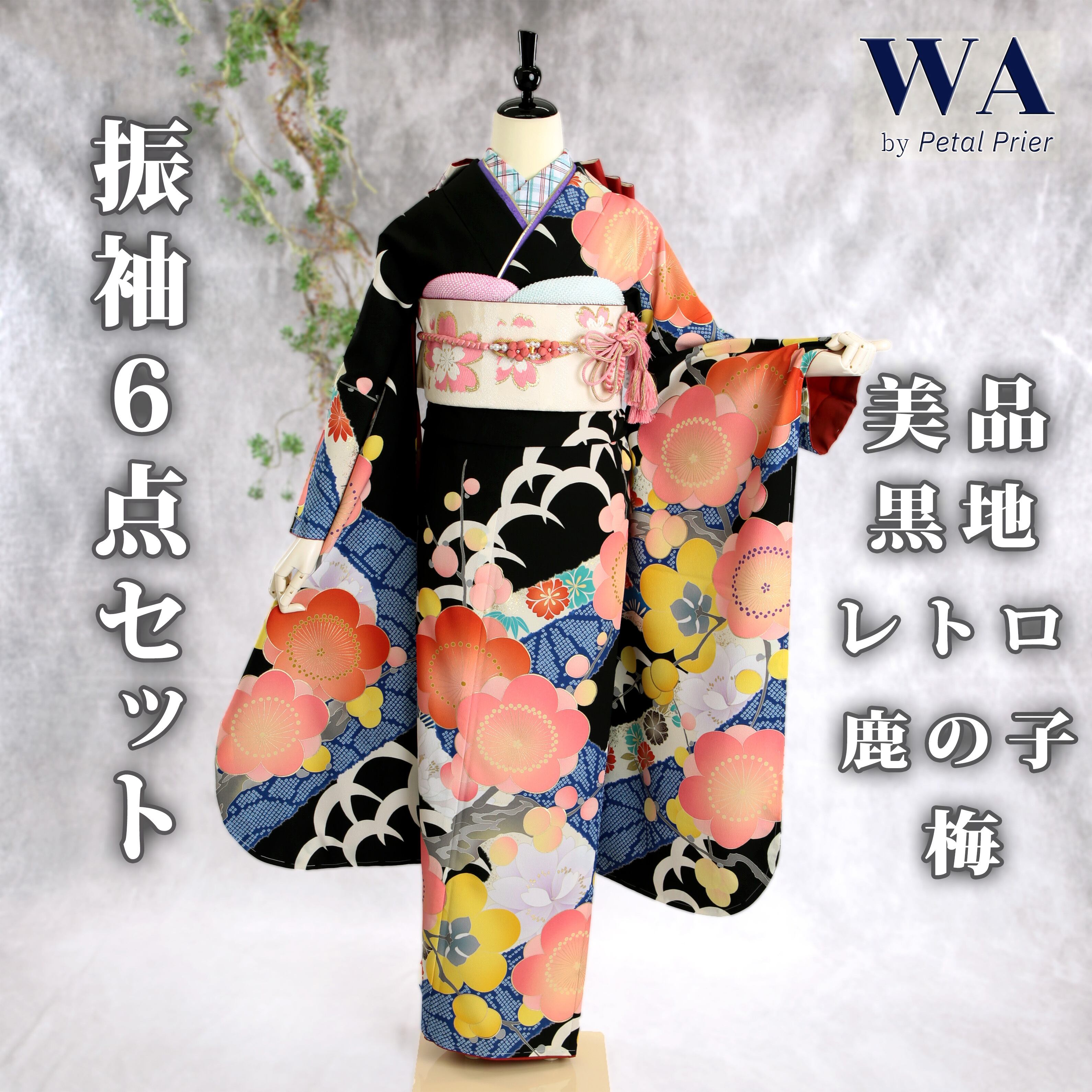 黒地に可愛らしい梅や鹿の子が映えるレトロ振袖です。