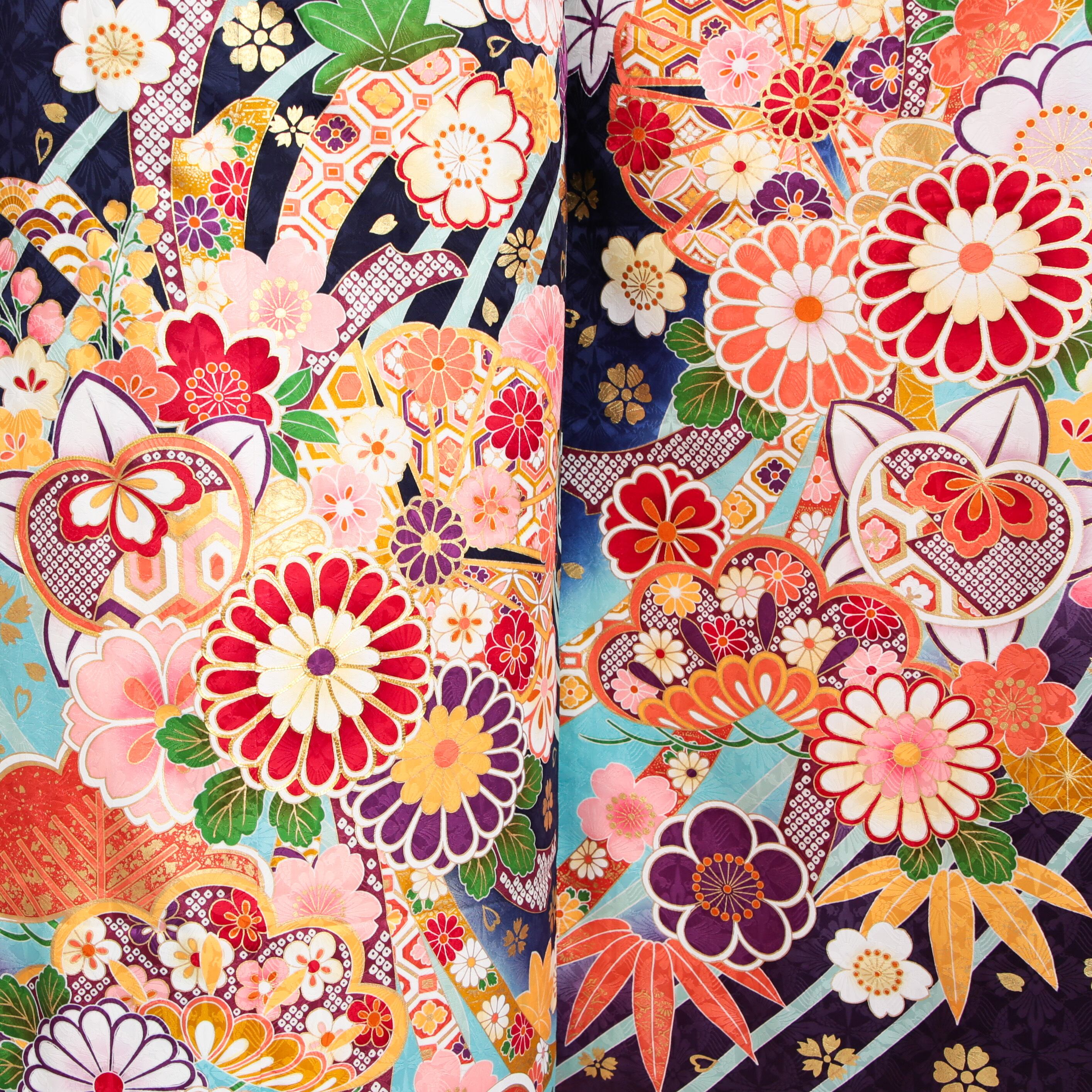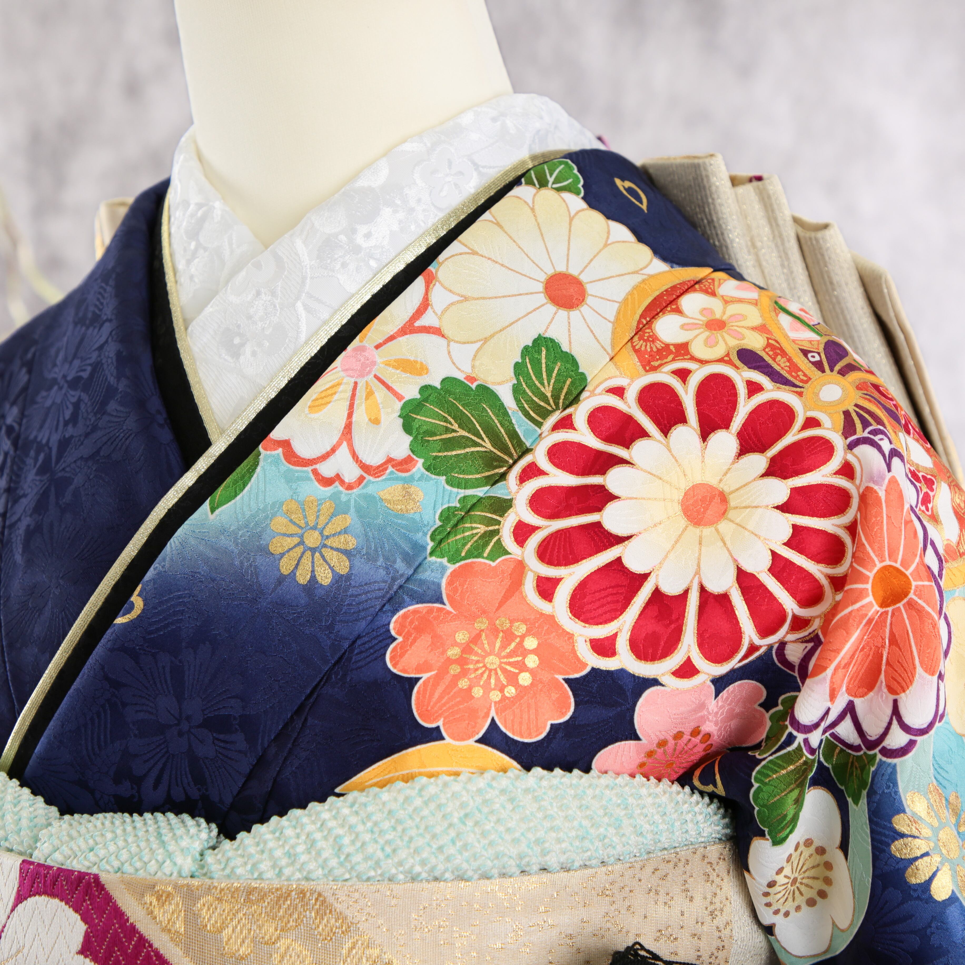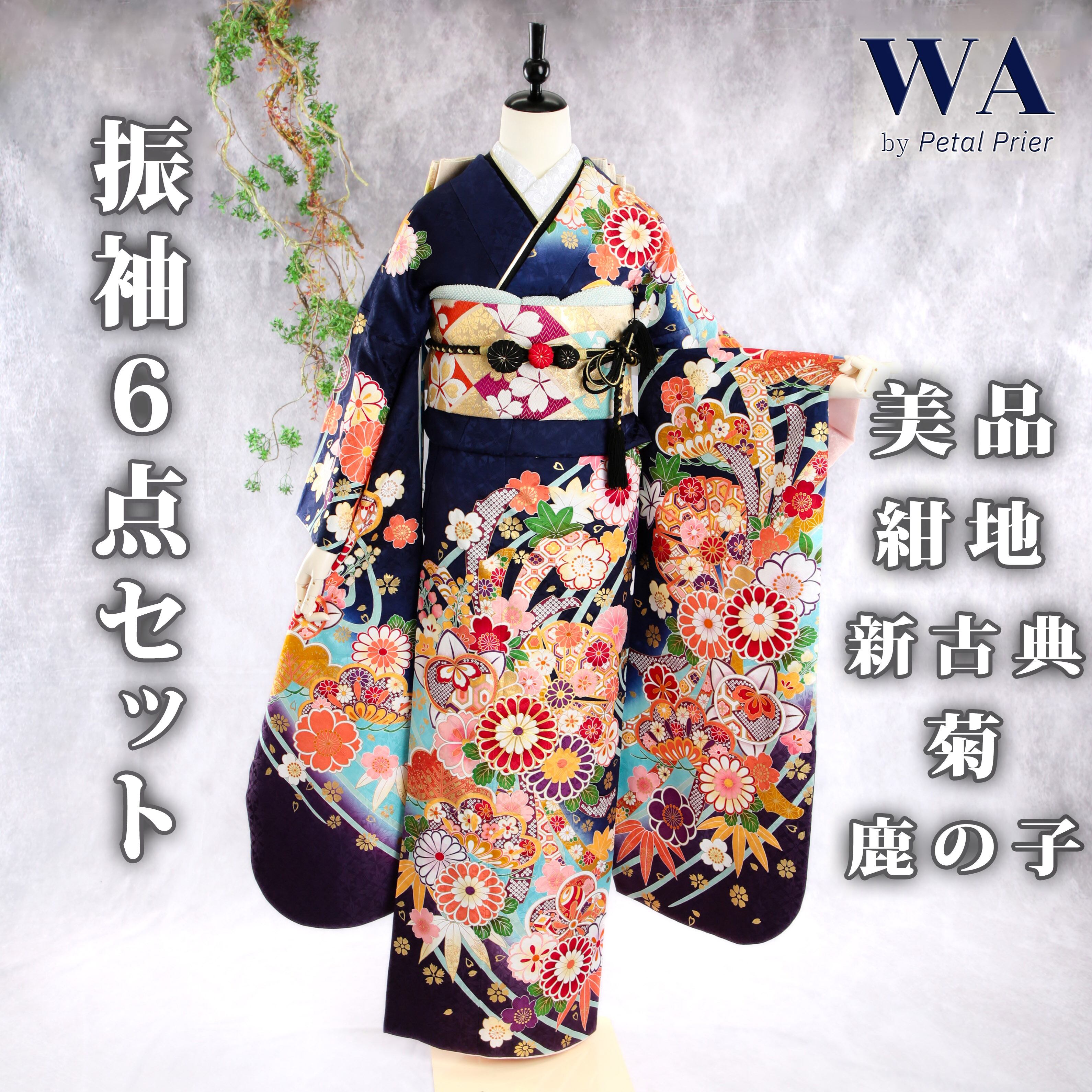 紺地に菊や鹿の子が印象的な新古典振袖です。