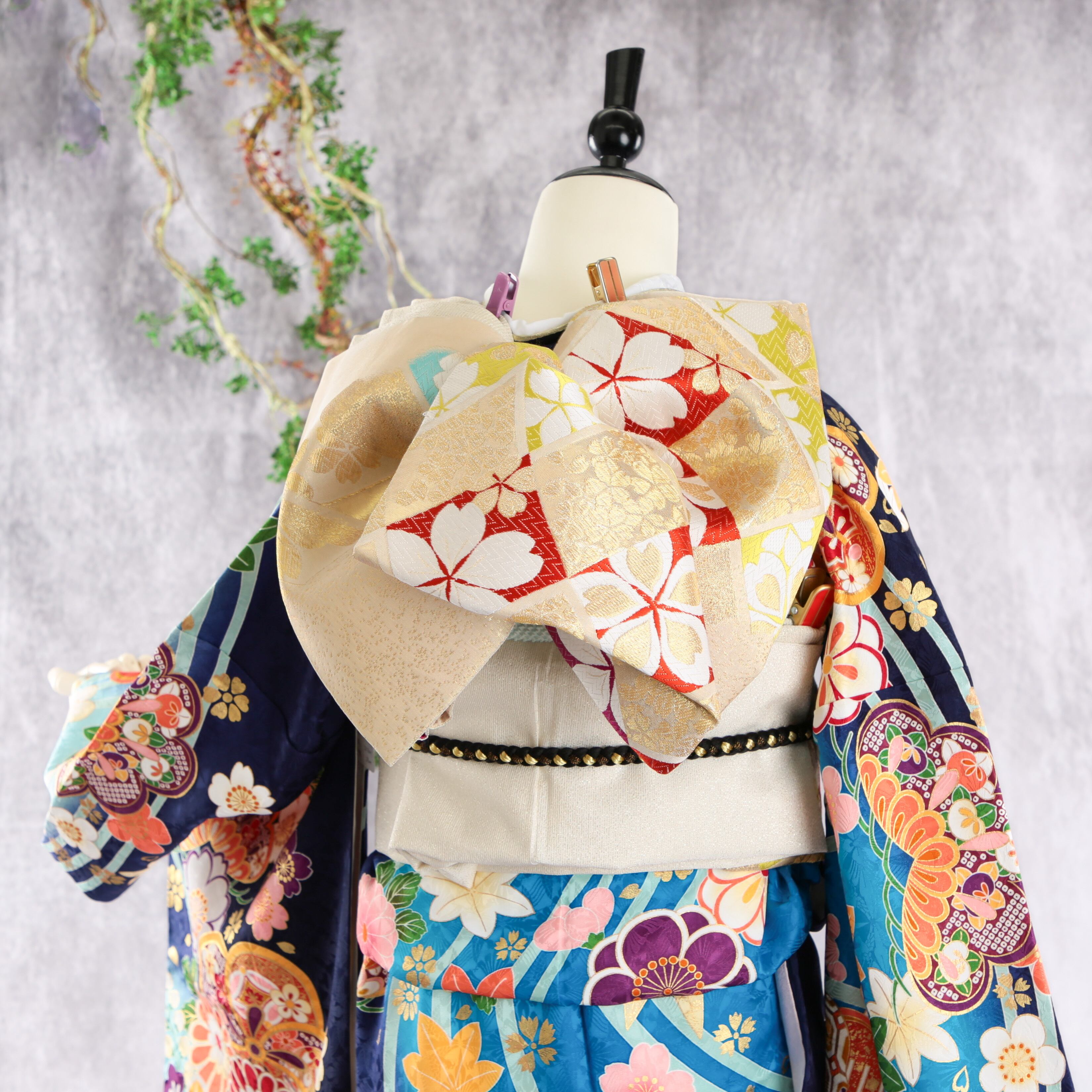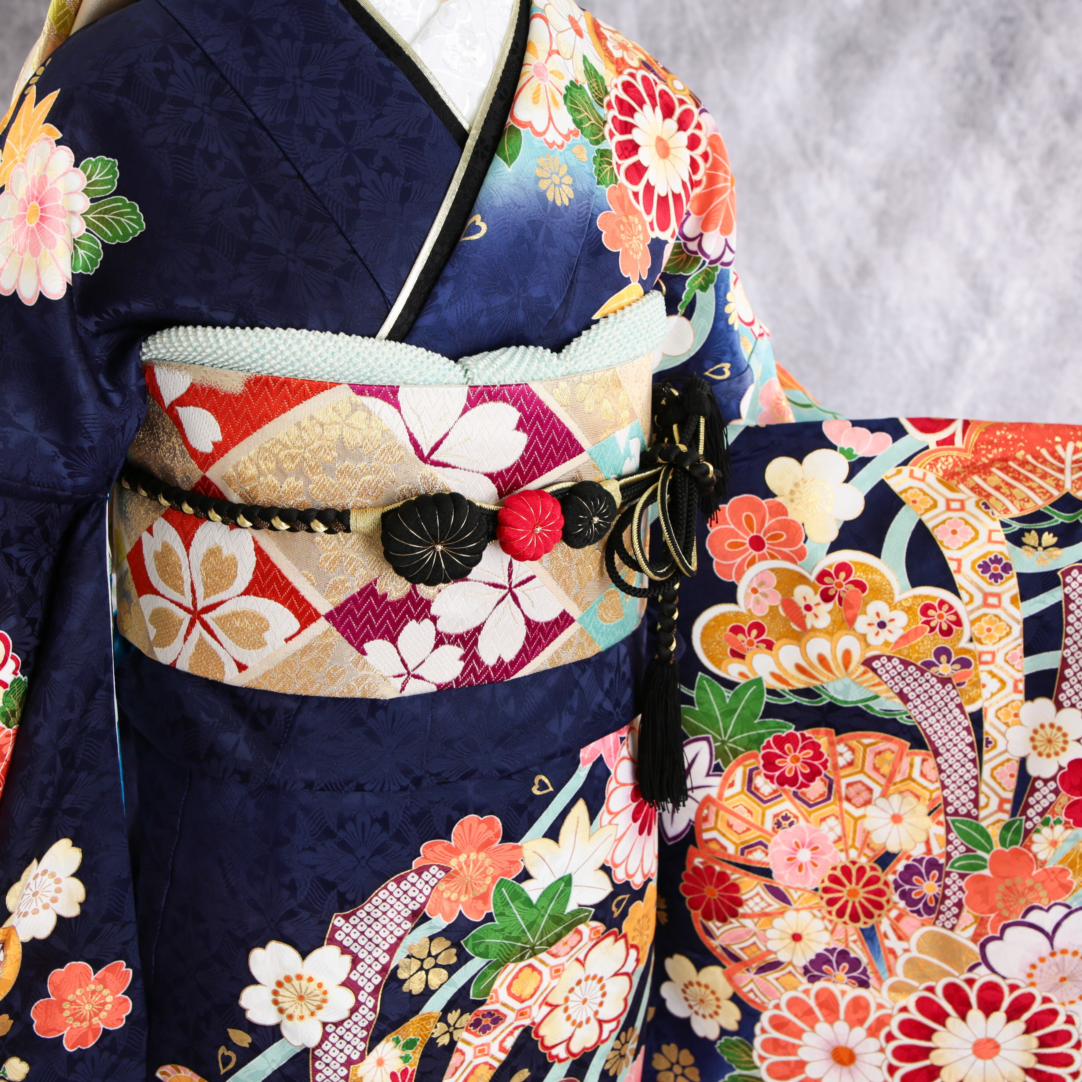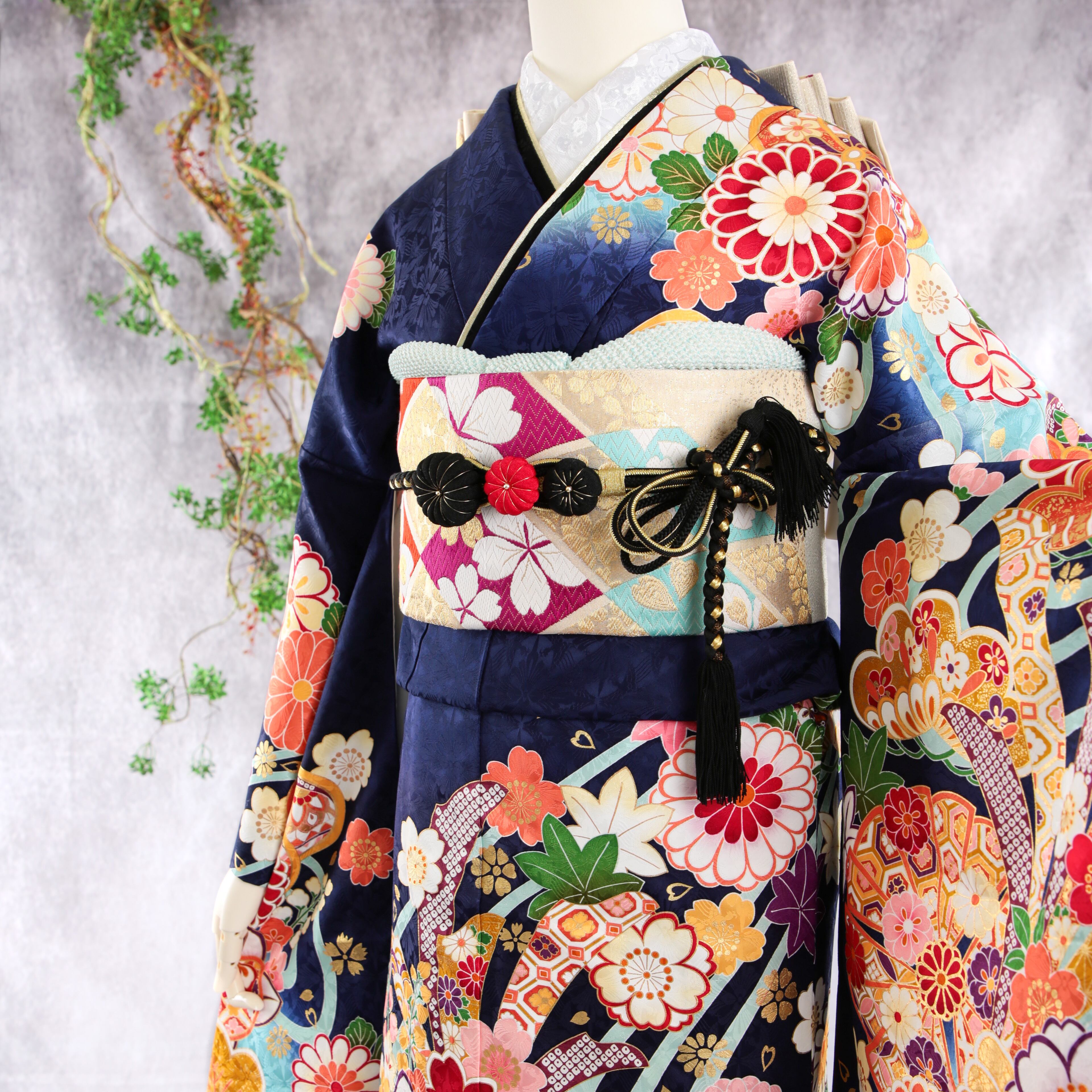 振袖フルセット 振袖セット 振袖 S〜Mサイズ 紺×新古典 美品 成人式 着物 晴れ着 6点セット FN-506