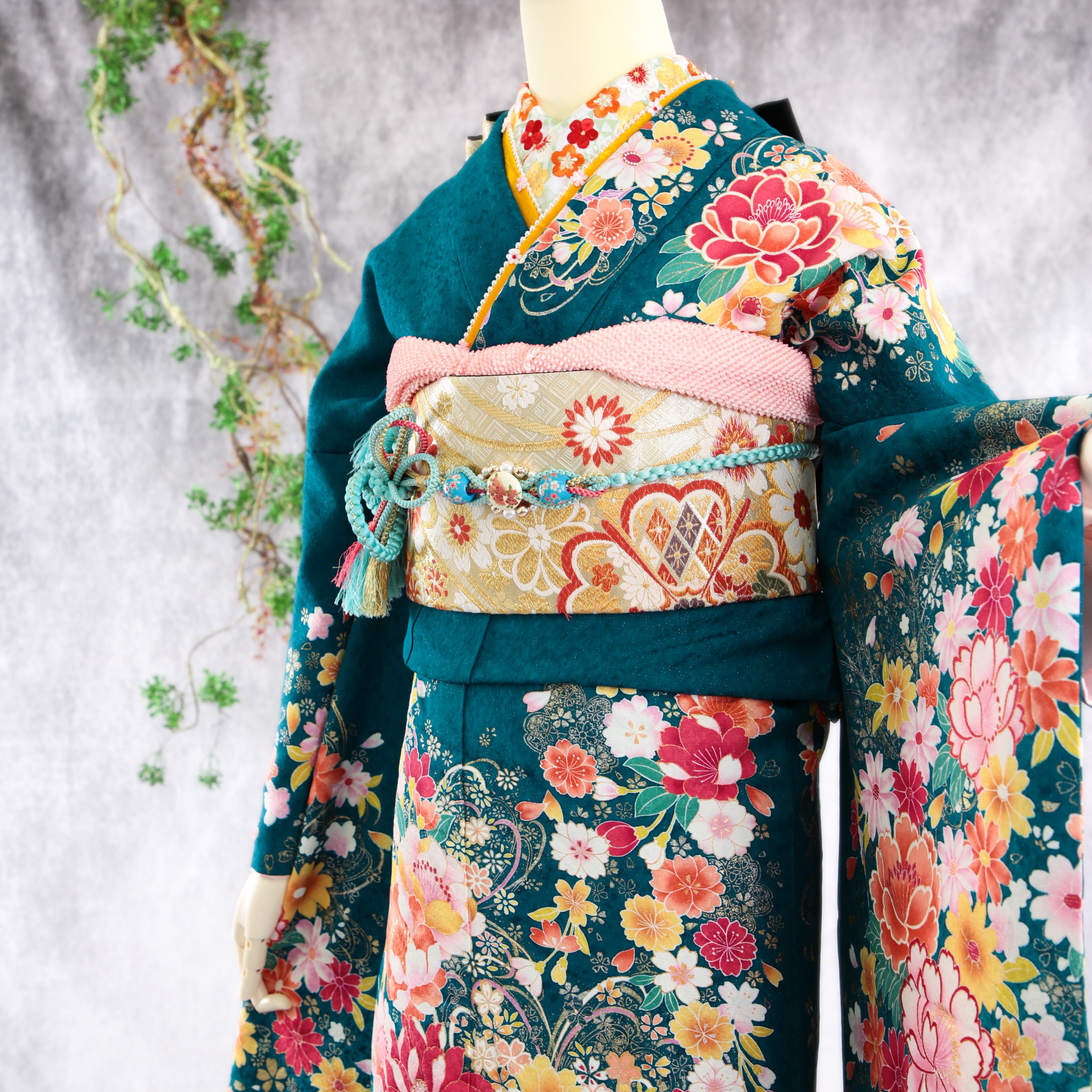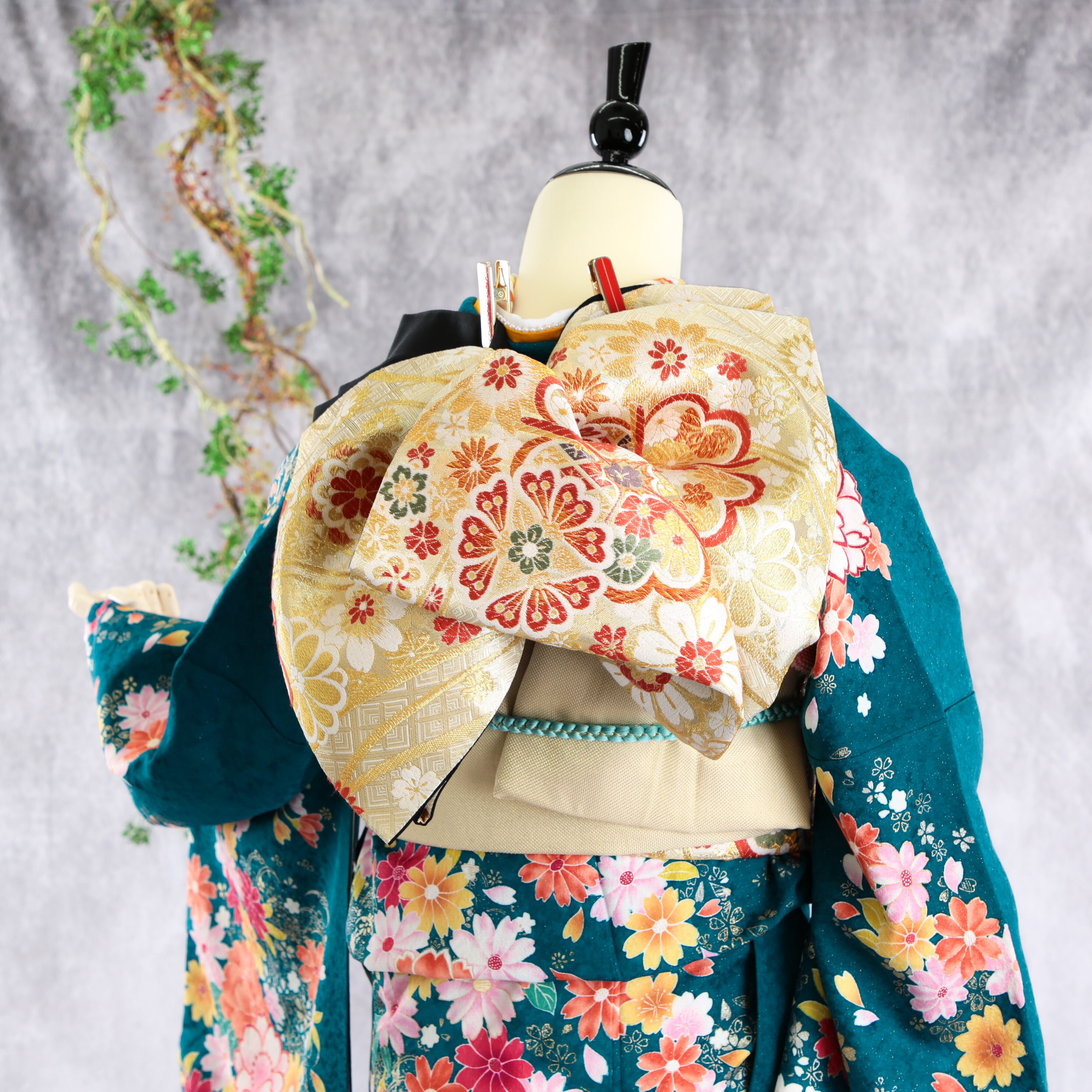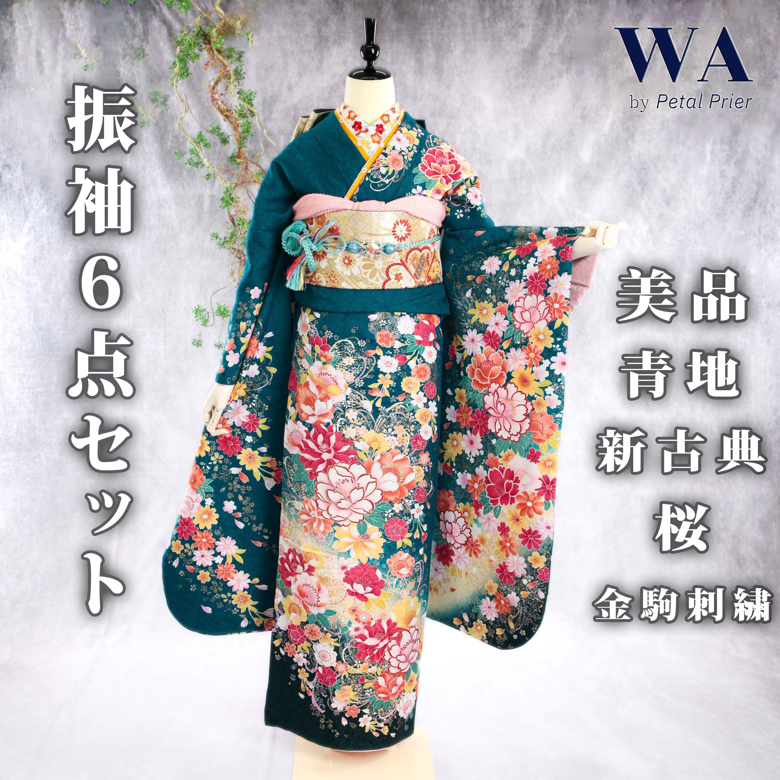 振袖フルセット 振袖セット 振袖 S〜Mサイズ 青緑×新古典 美品 成人式 着物 晴れ着 6点セット FN-511