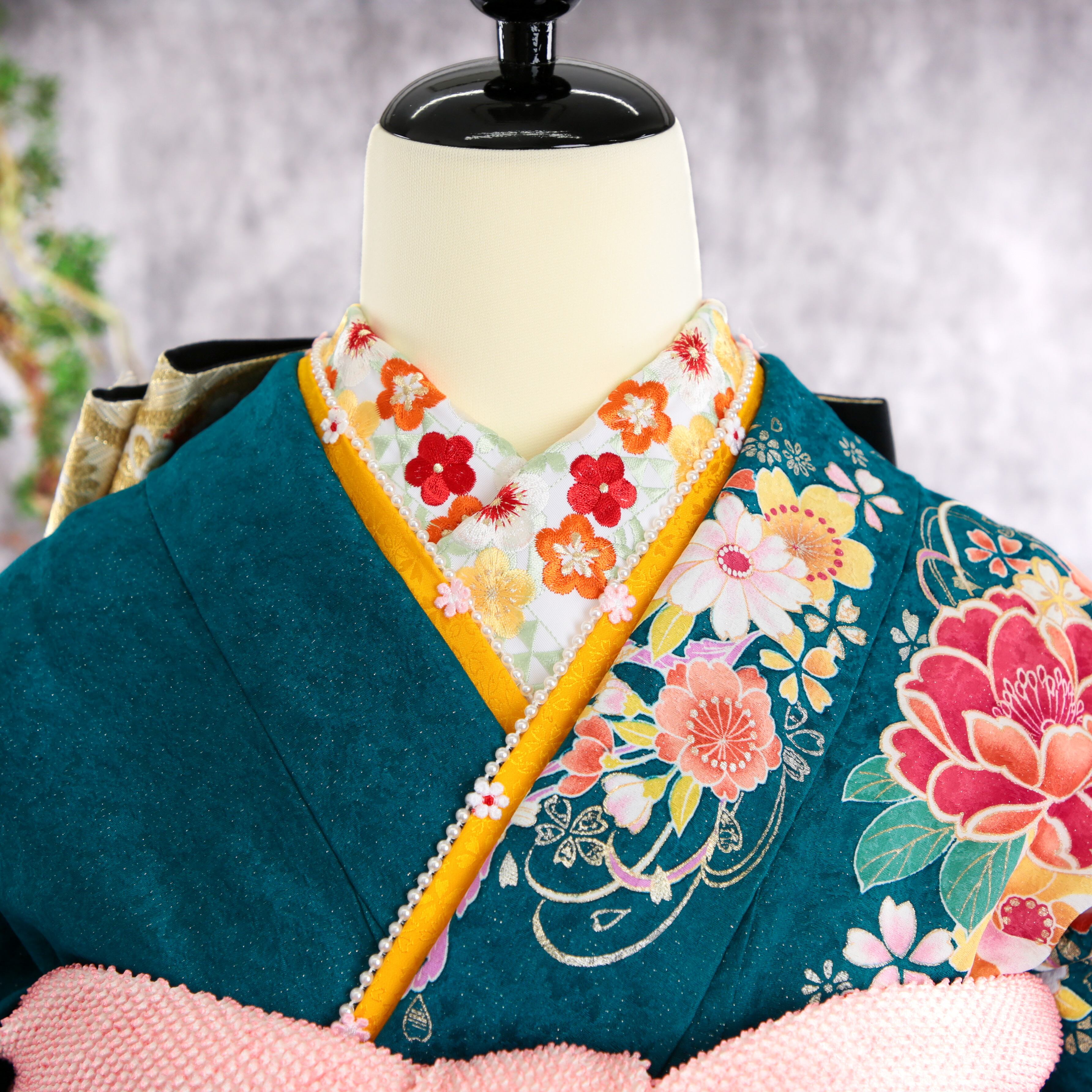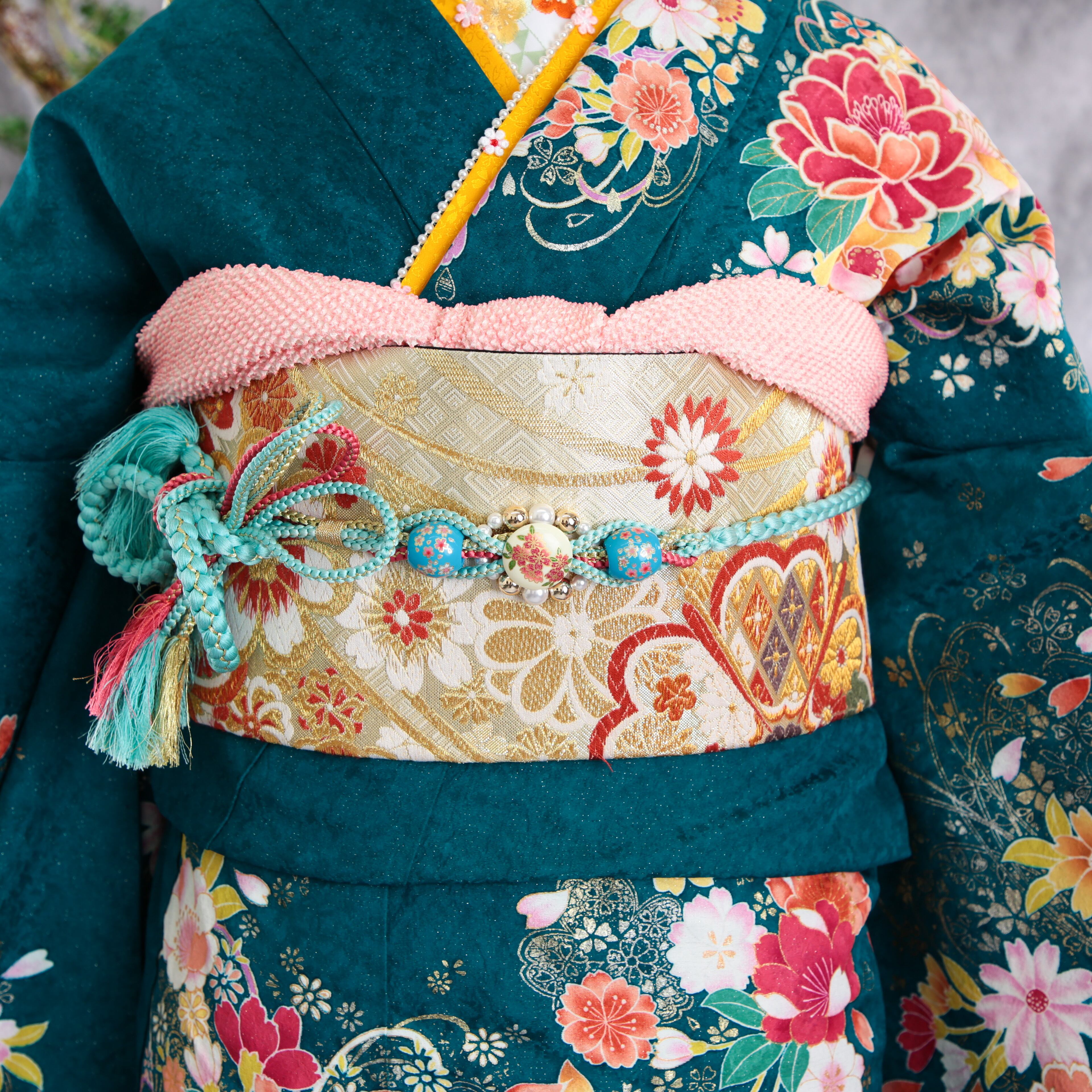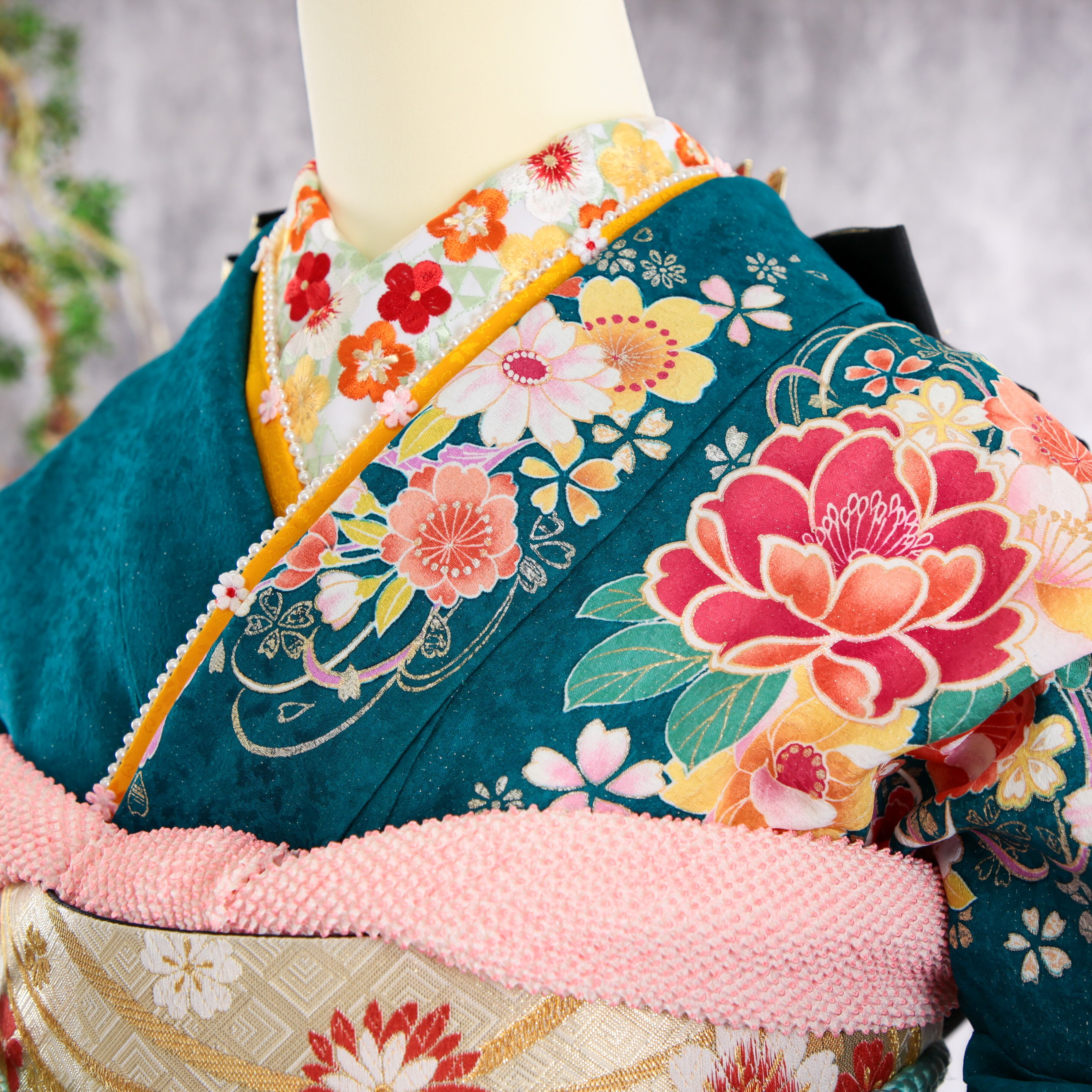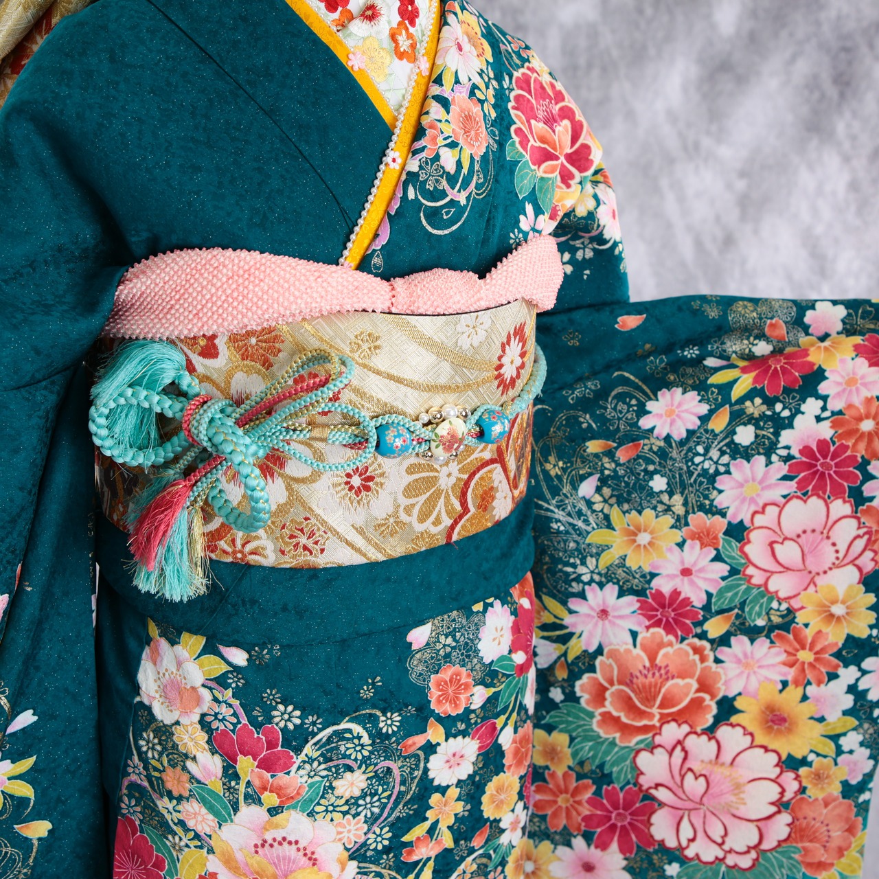 振袖フルセット 振袖セット 振袖 S〜Mサイズ 青緑×新古典 美品 成人式 着物 晴れ着 6点セット FN-511