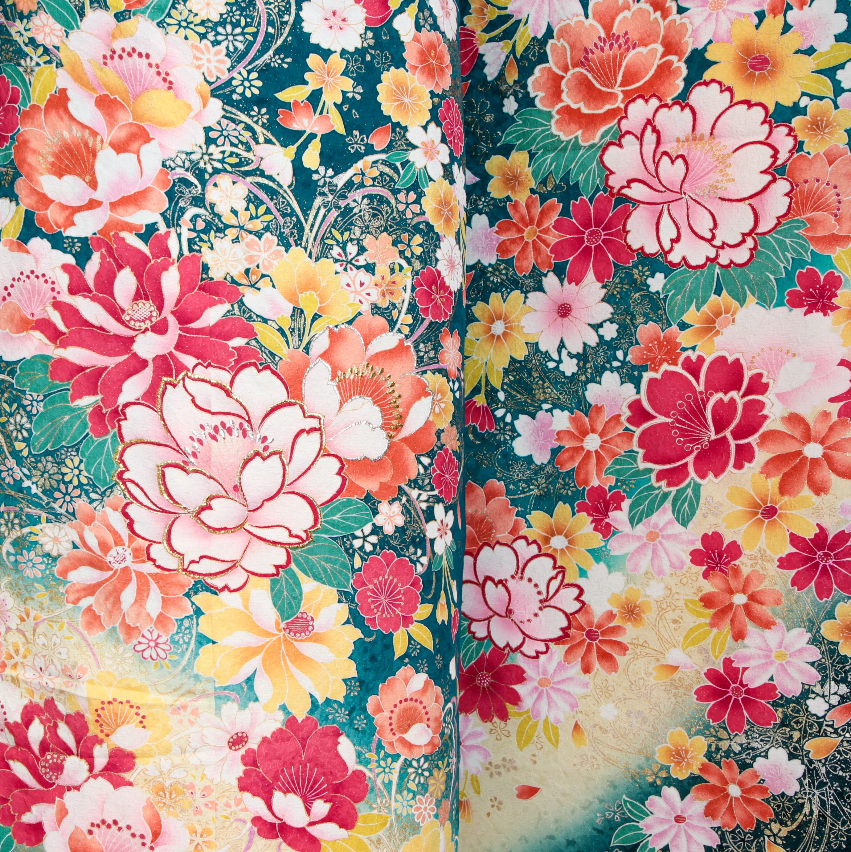 ラメ感ある青緑地に桜や金駒刺繍が華やかな新古典振袖です。