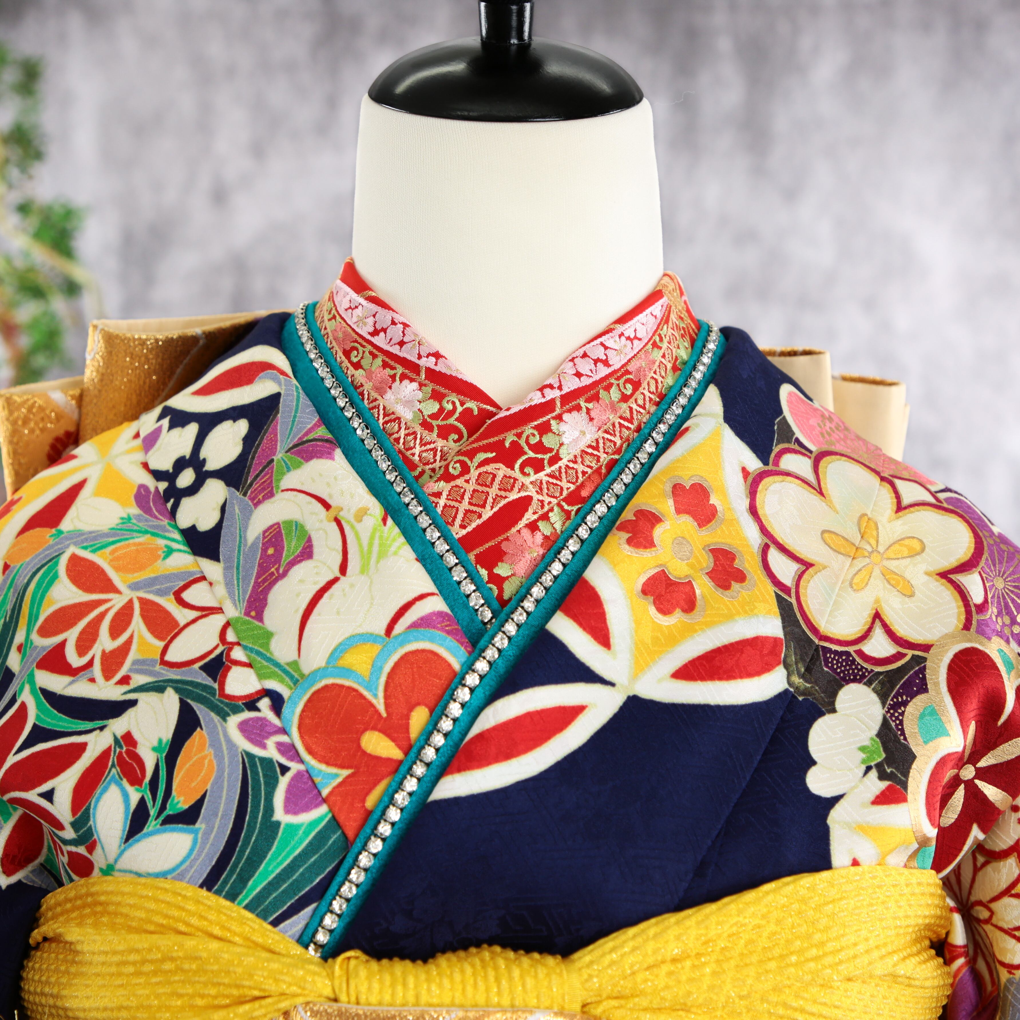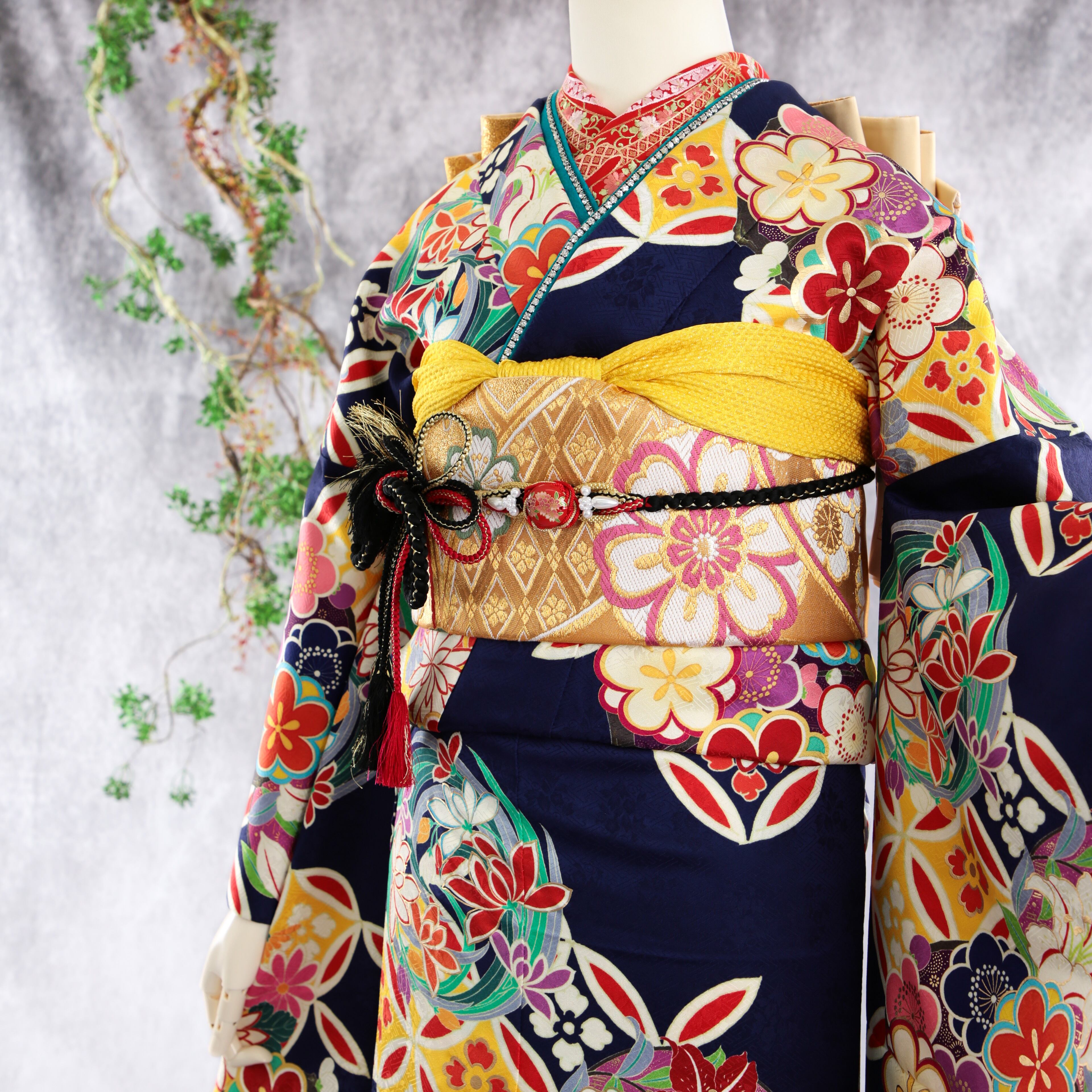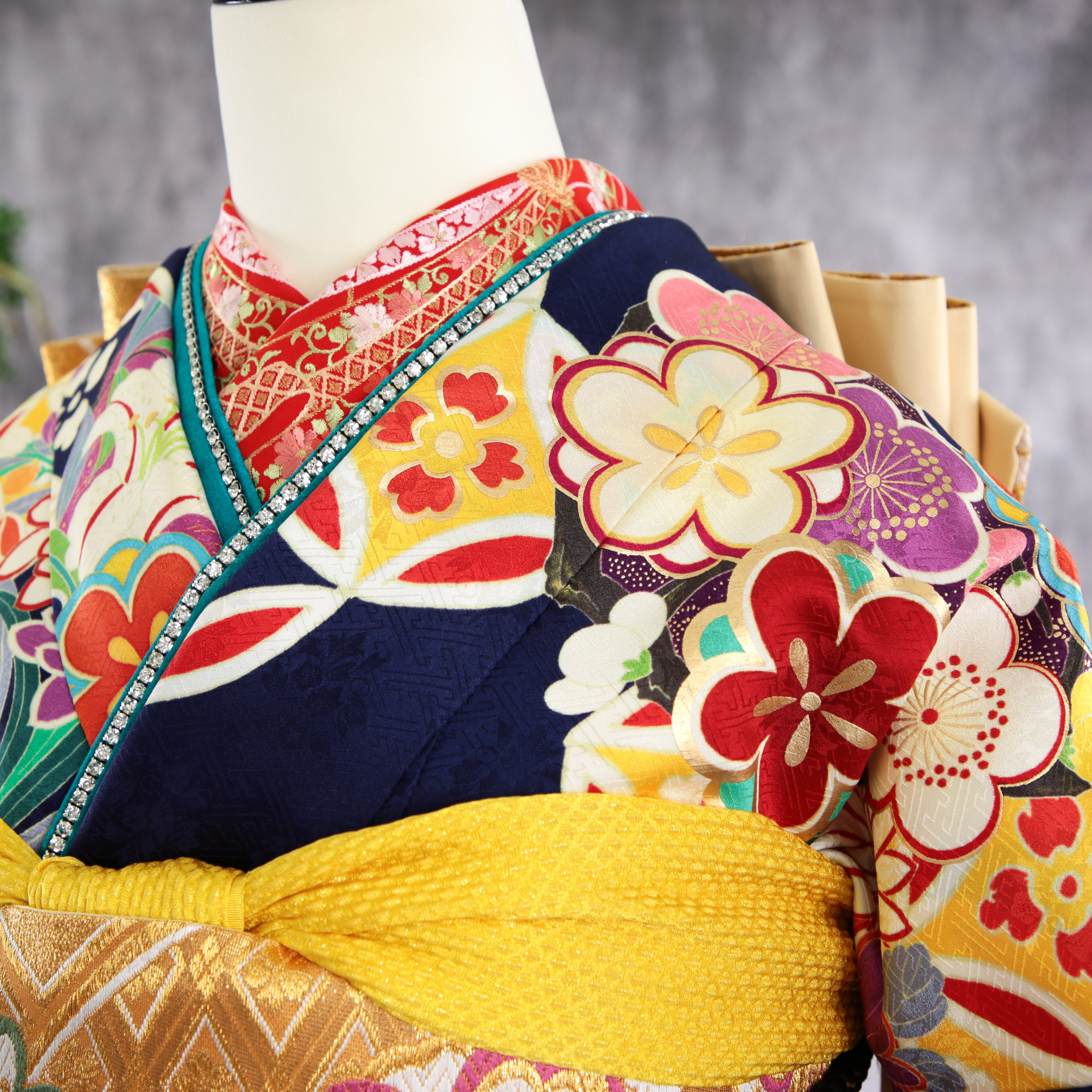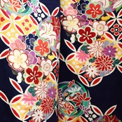 深い紺地に梅や七宝が印象的なモダン振袖です。
