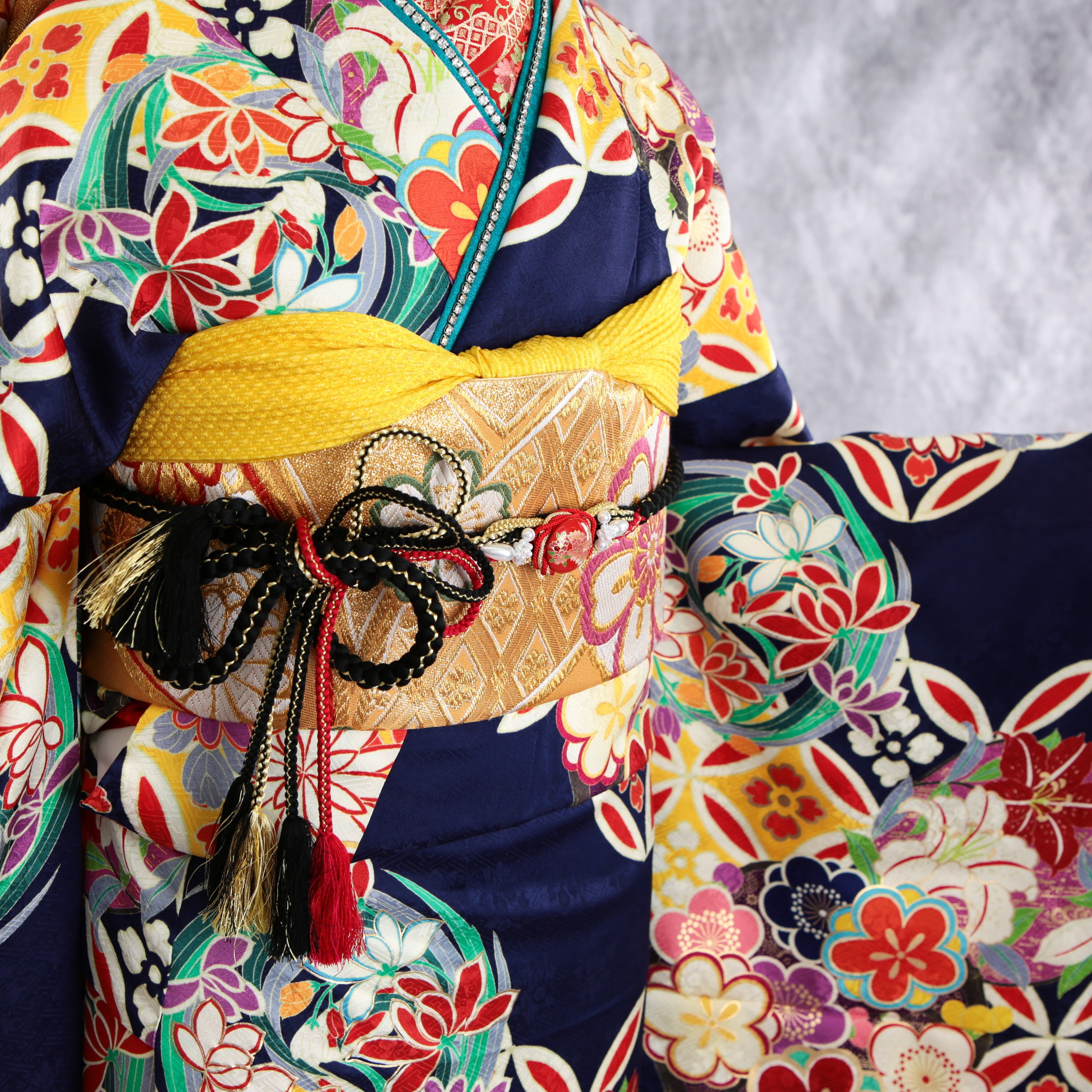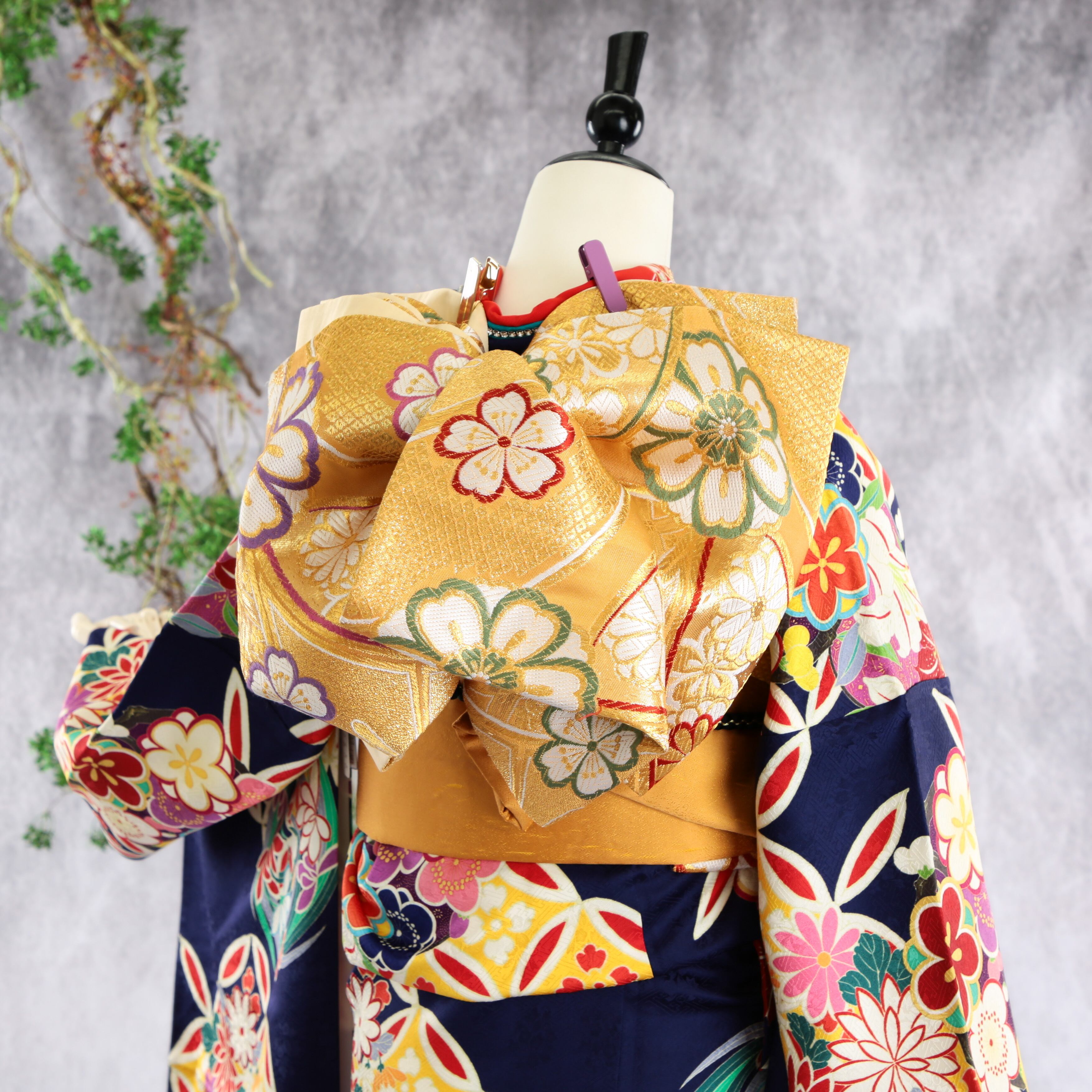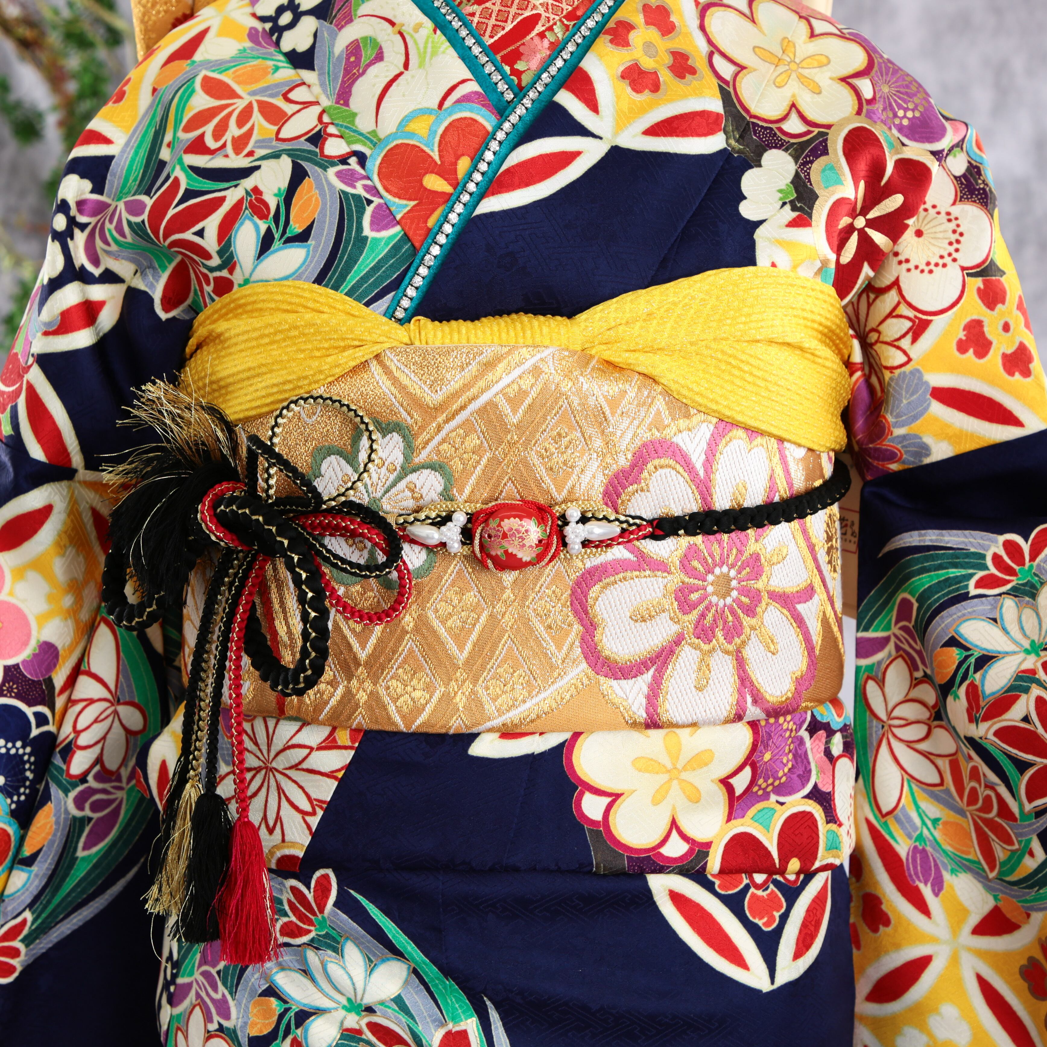 深い紺地に梅や七宝が印象的なモダン振袖です。