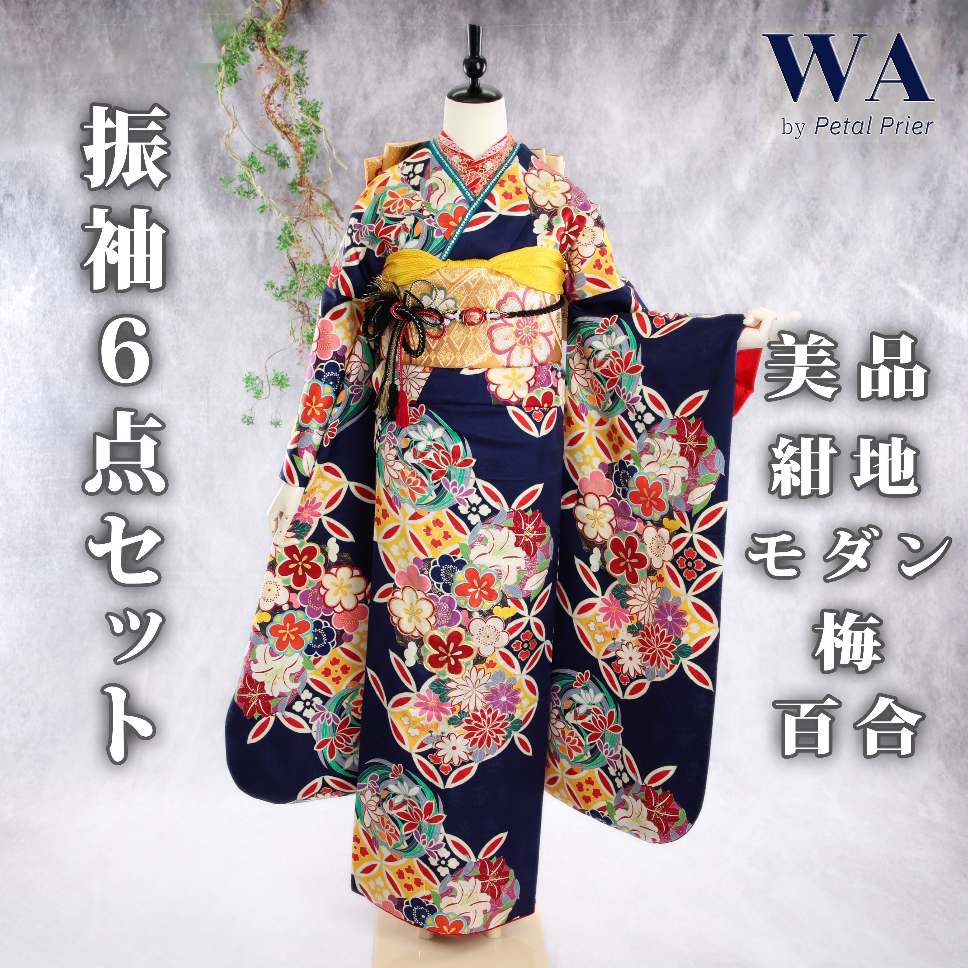 振袖フルセット 振袖セット 振袖 Mサイズ 紺×モダン 美品 成人式 着物 晴れ着 6点セット FN-512