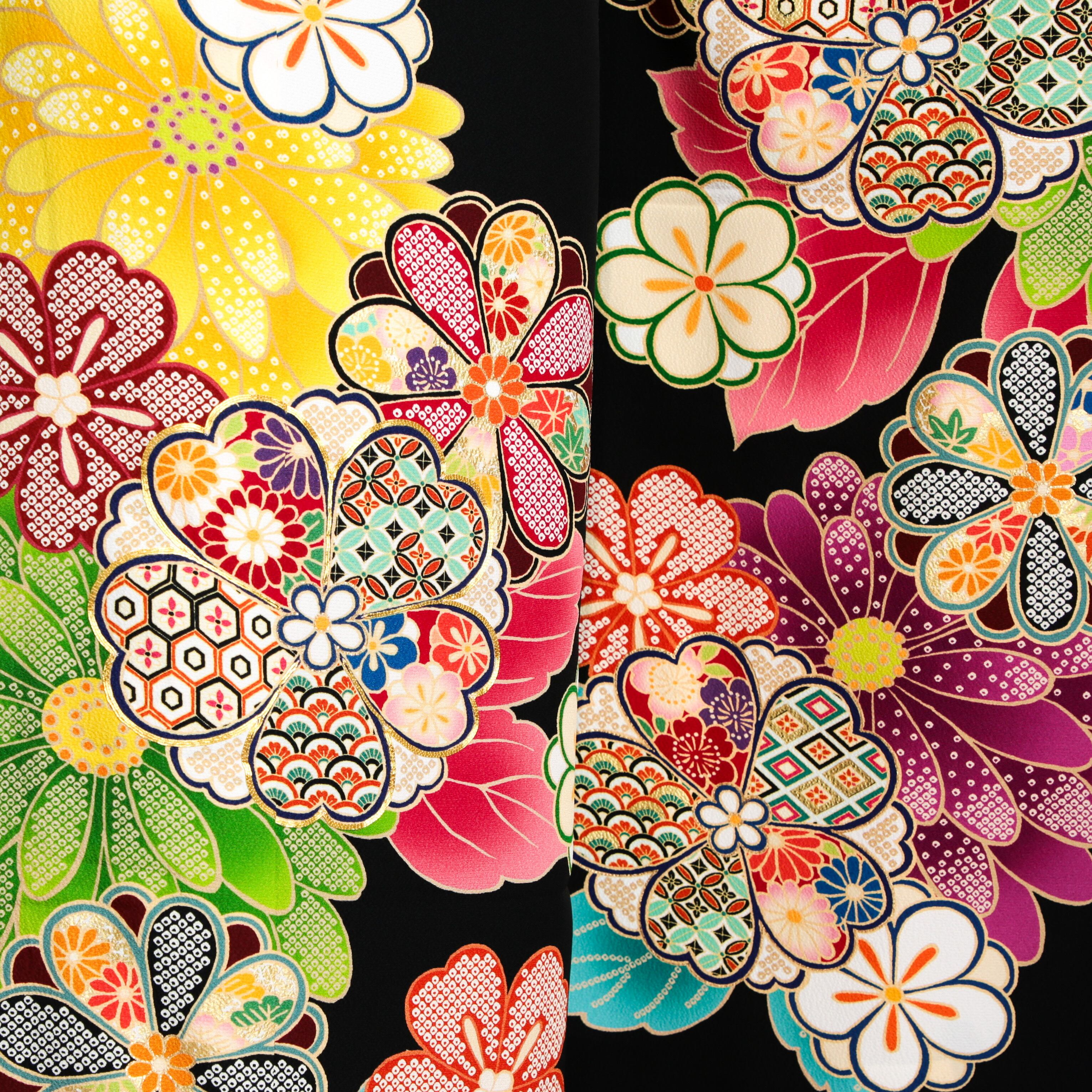 黒に鮮やかな柄がメリハリあるデザインです。