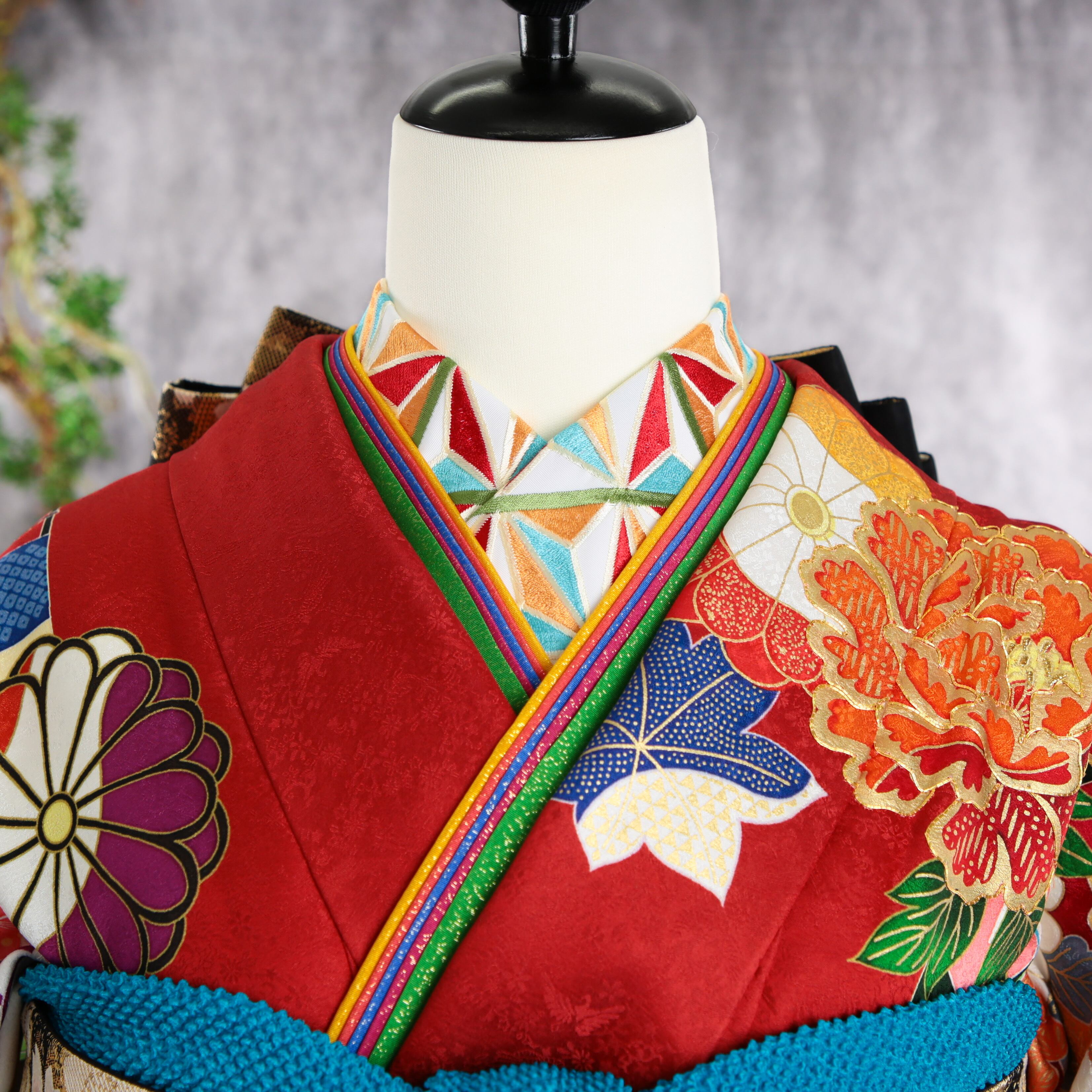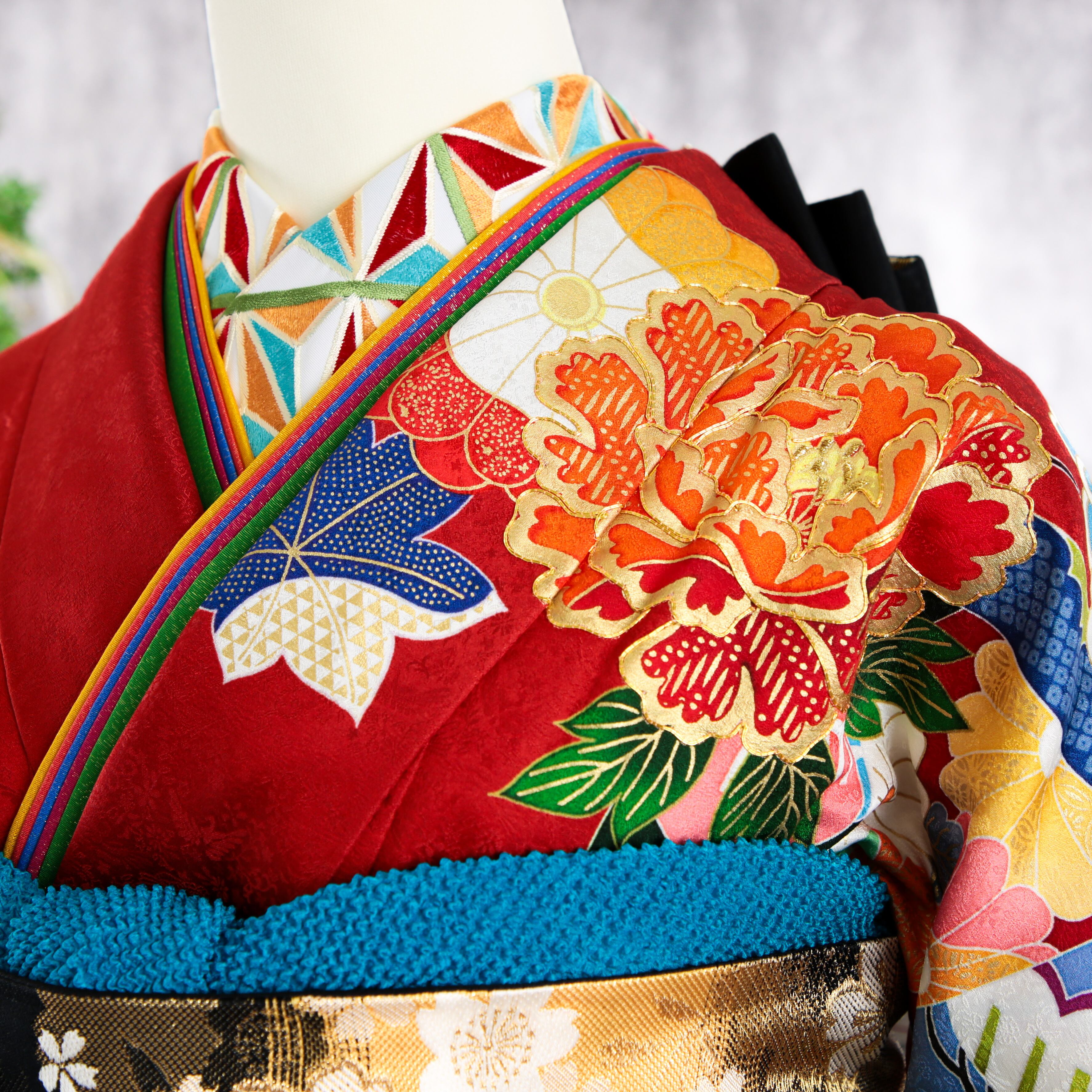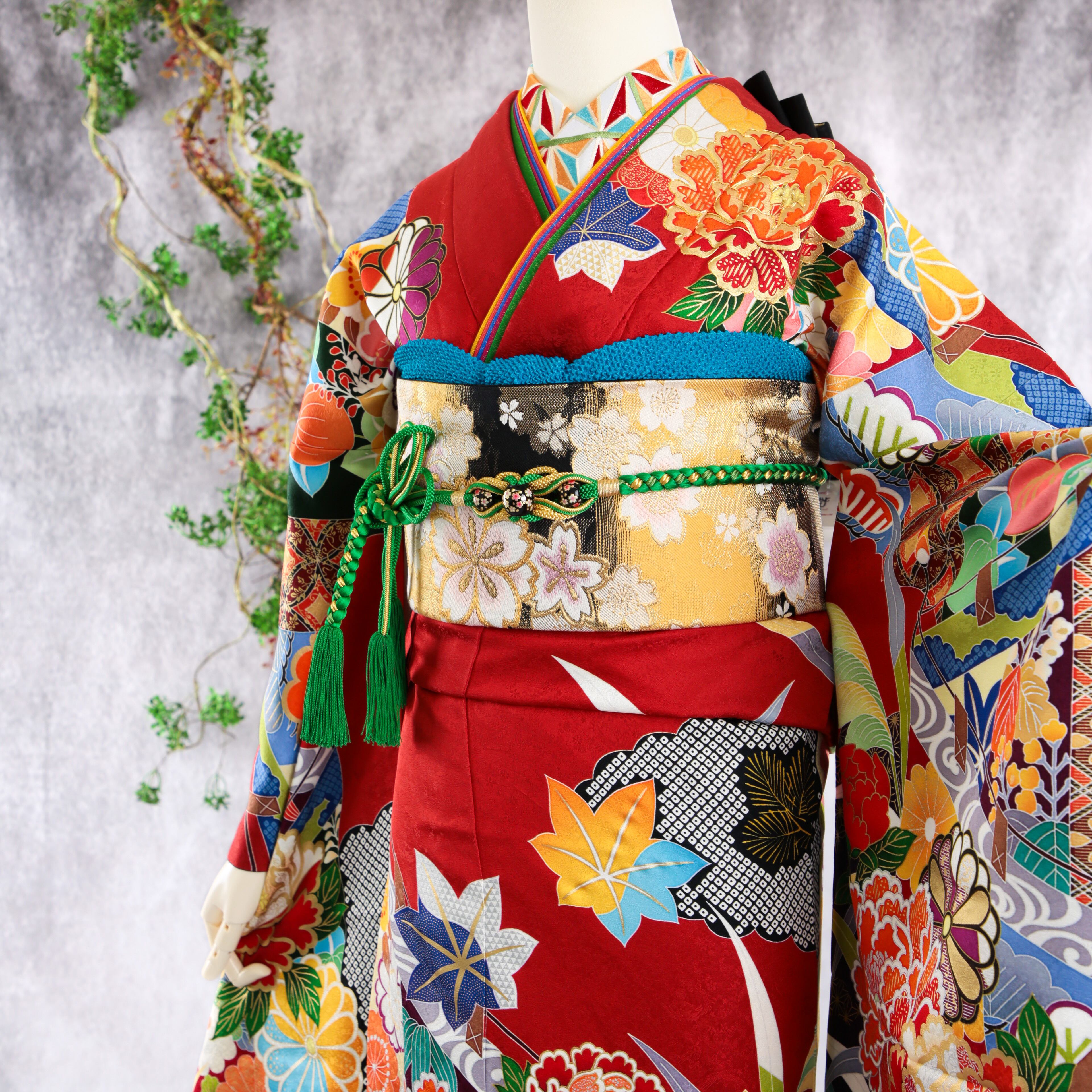 赤地に牡丹や鹿の子が印象的な古典振袖です。