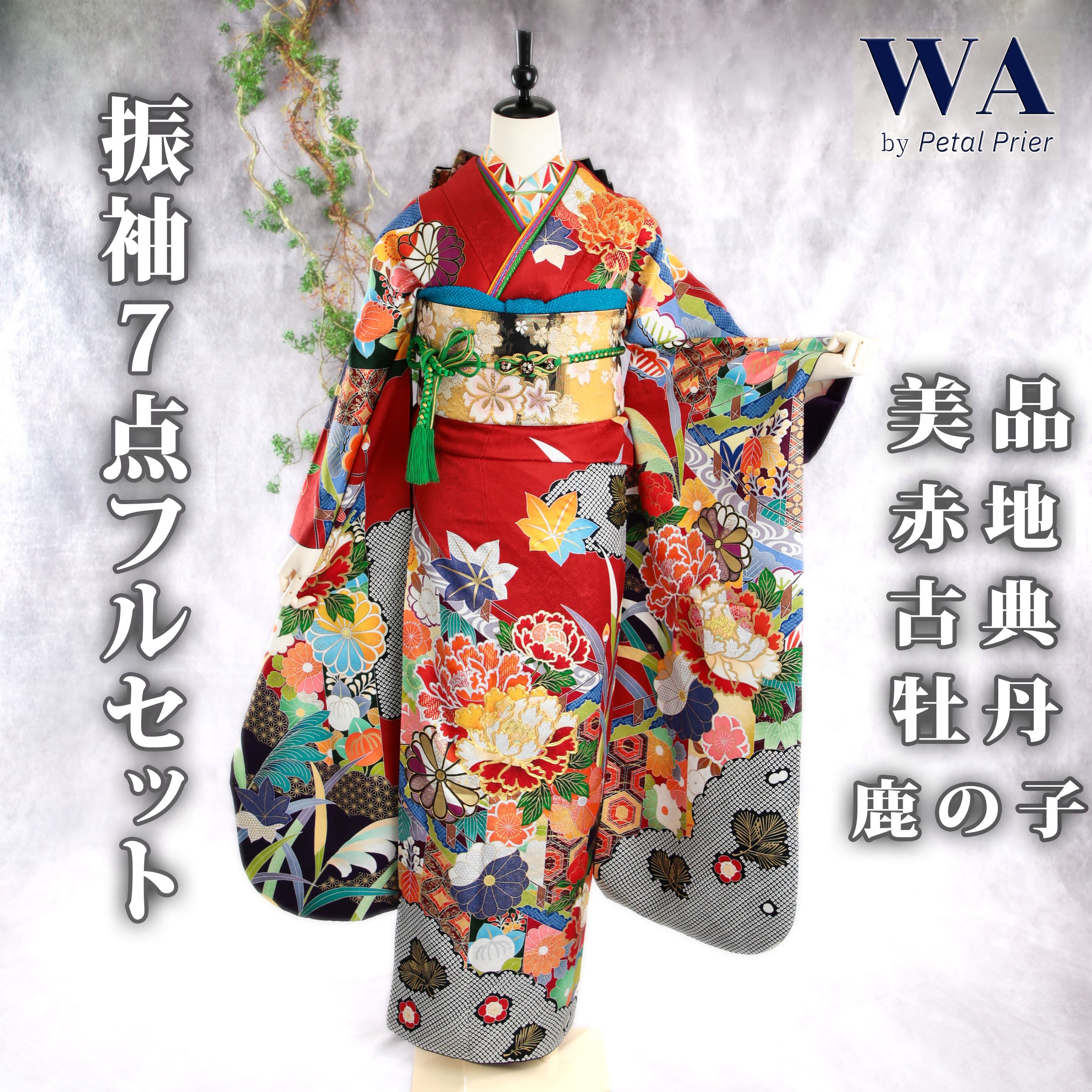 振袖フルセット 振袖セット 振袖 L〜LLサイズ 赤×古典 美品 成人式 着物 晴れ着 7点フルセット F-494