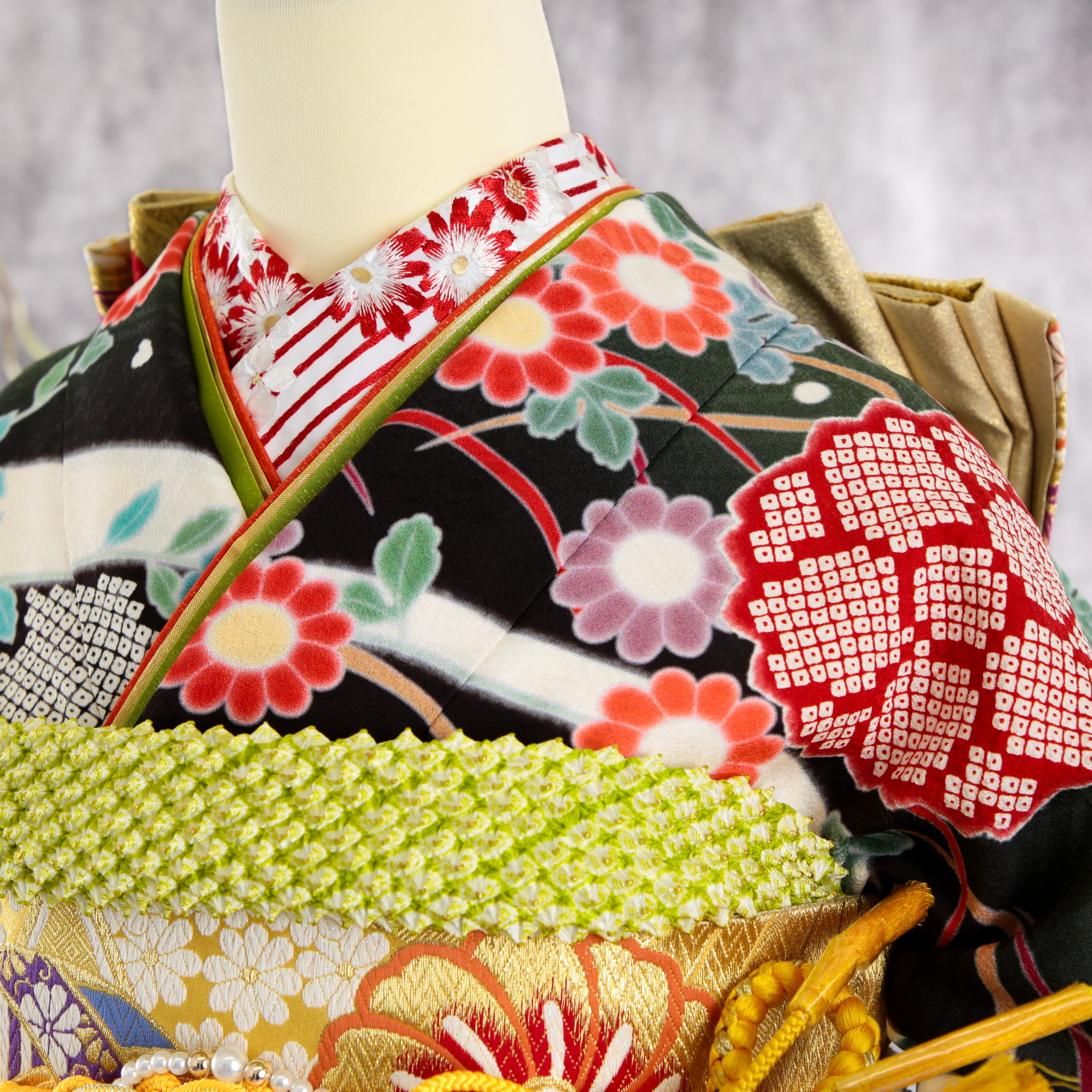 振袖フルセット 振袖セット 振袖 Lサイズ 深緑×大正ロマン 美品 成人式 着物 晴れ着 7点フルセット F-507