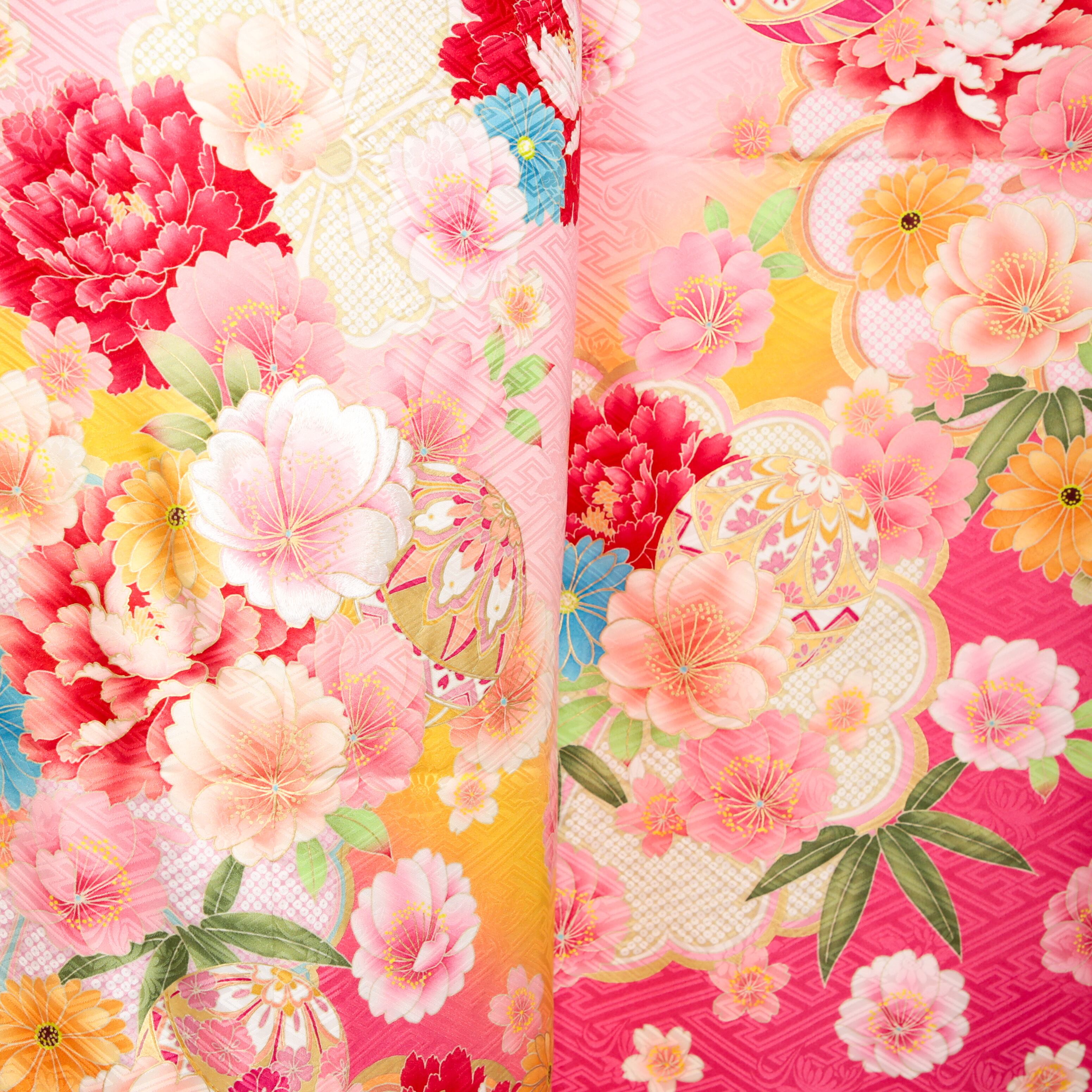 優しいピンク地に桜や鞠が印象的な新古典振袖です。