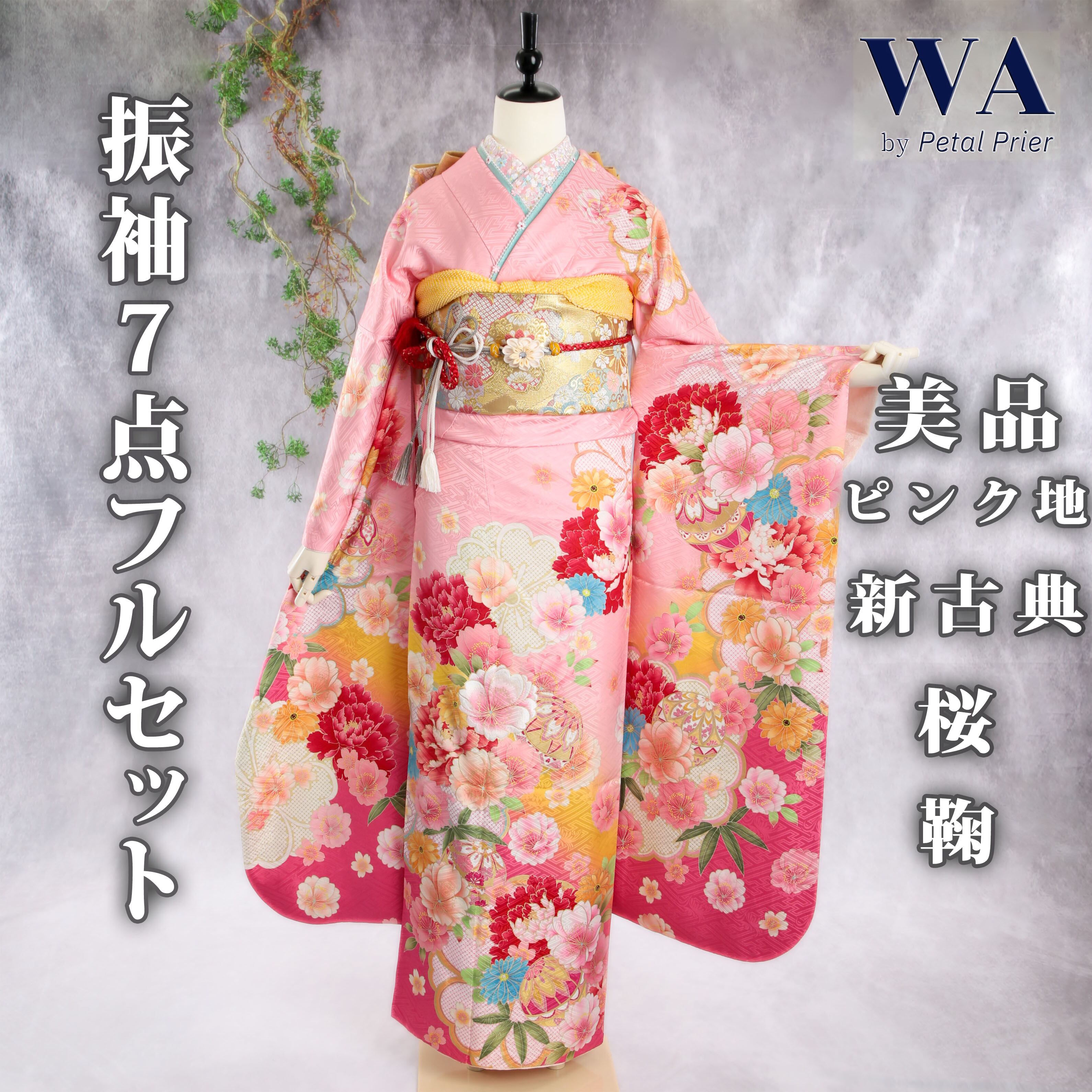 振袖フルセット 振袖セット 振袖 Lサイズ ピンク×新古典 美品 成人式 着物 晴れ着 7点フルセット F-509