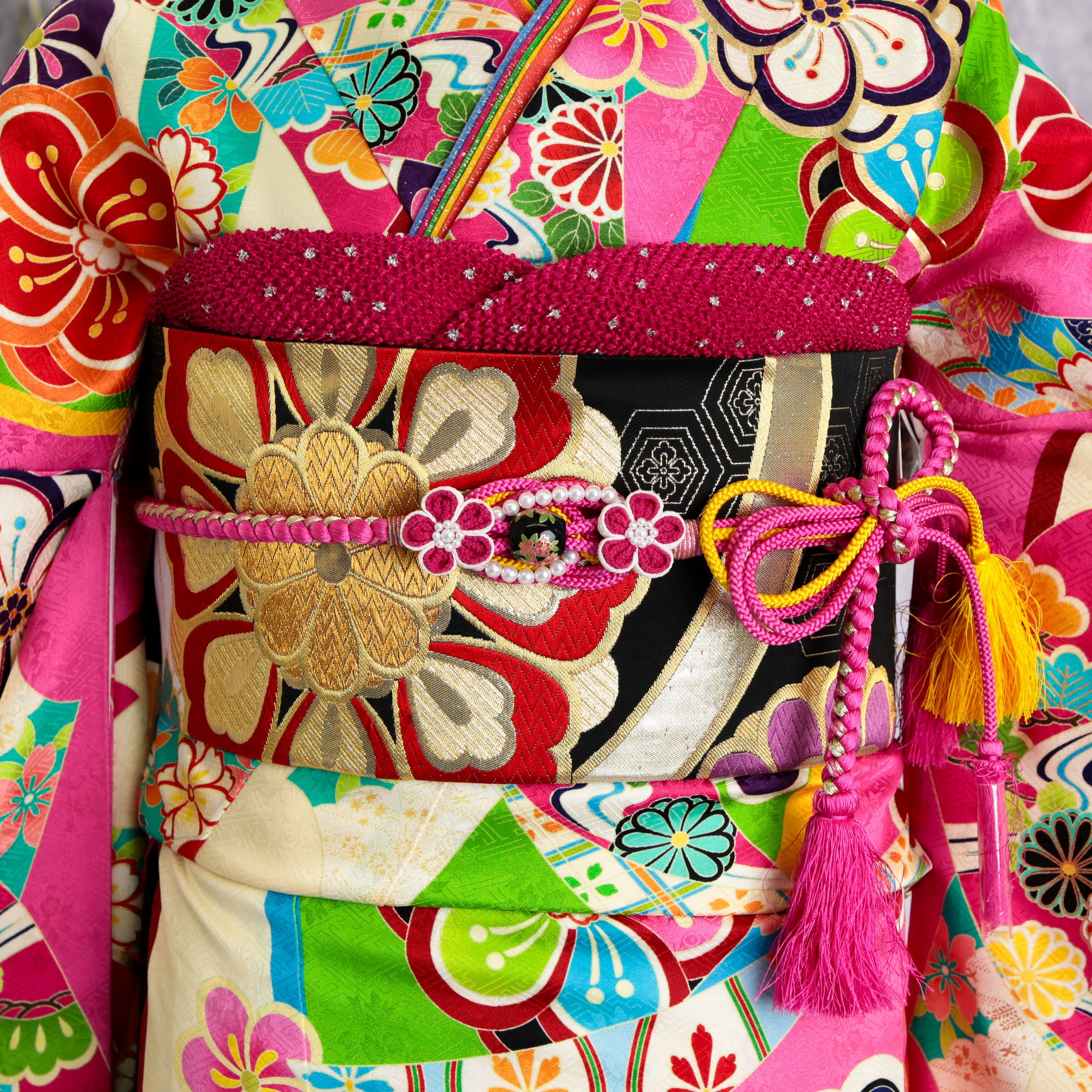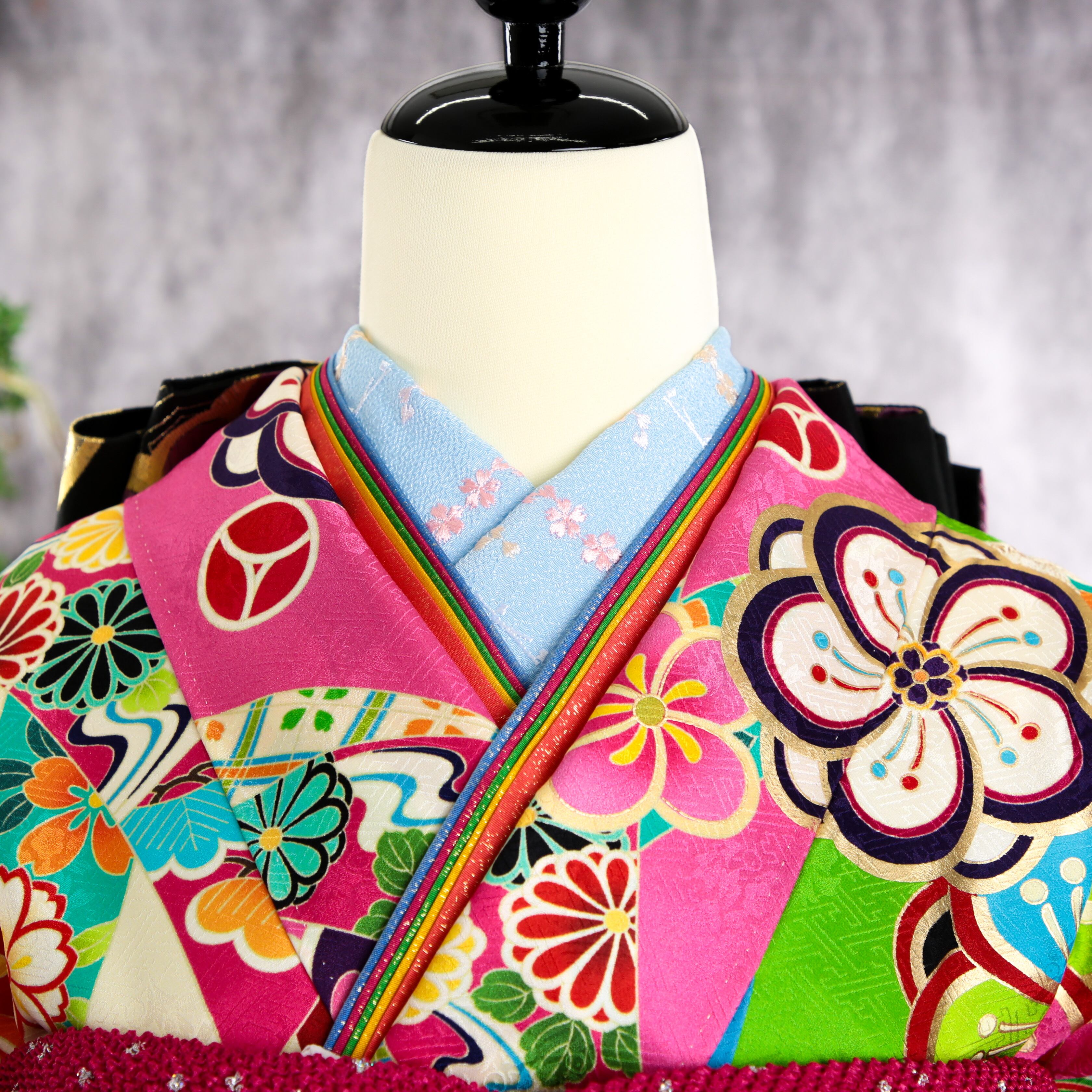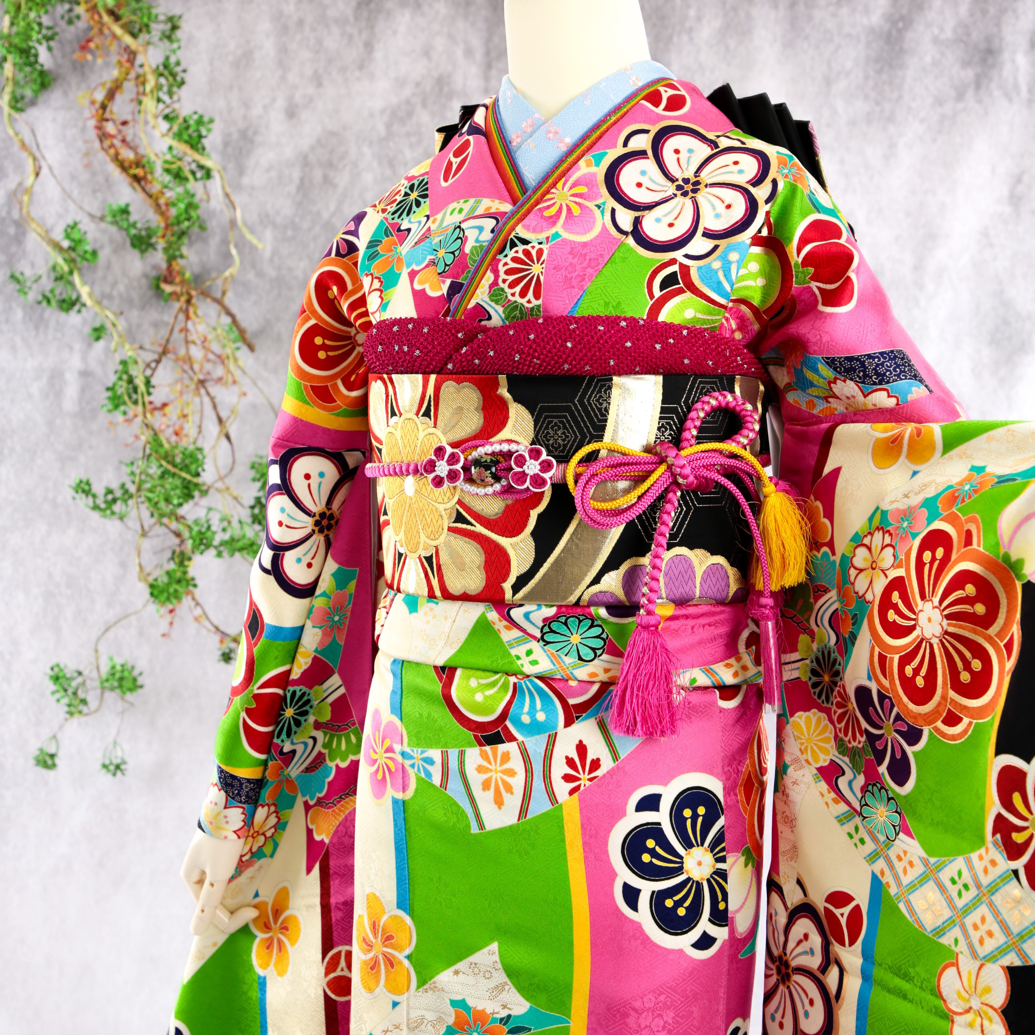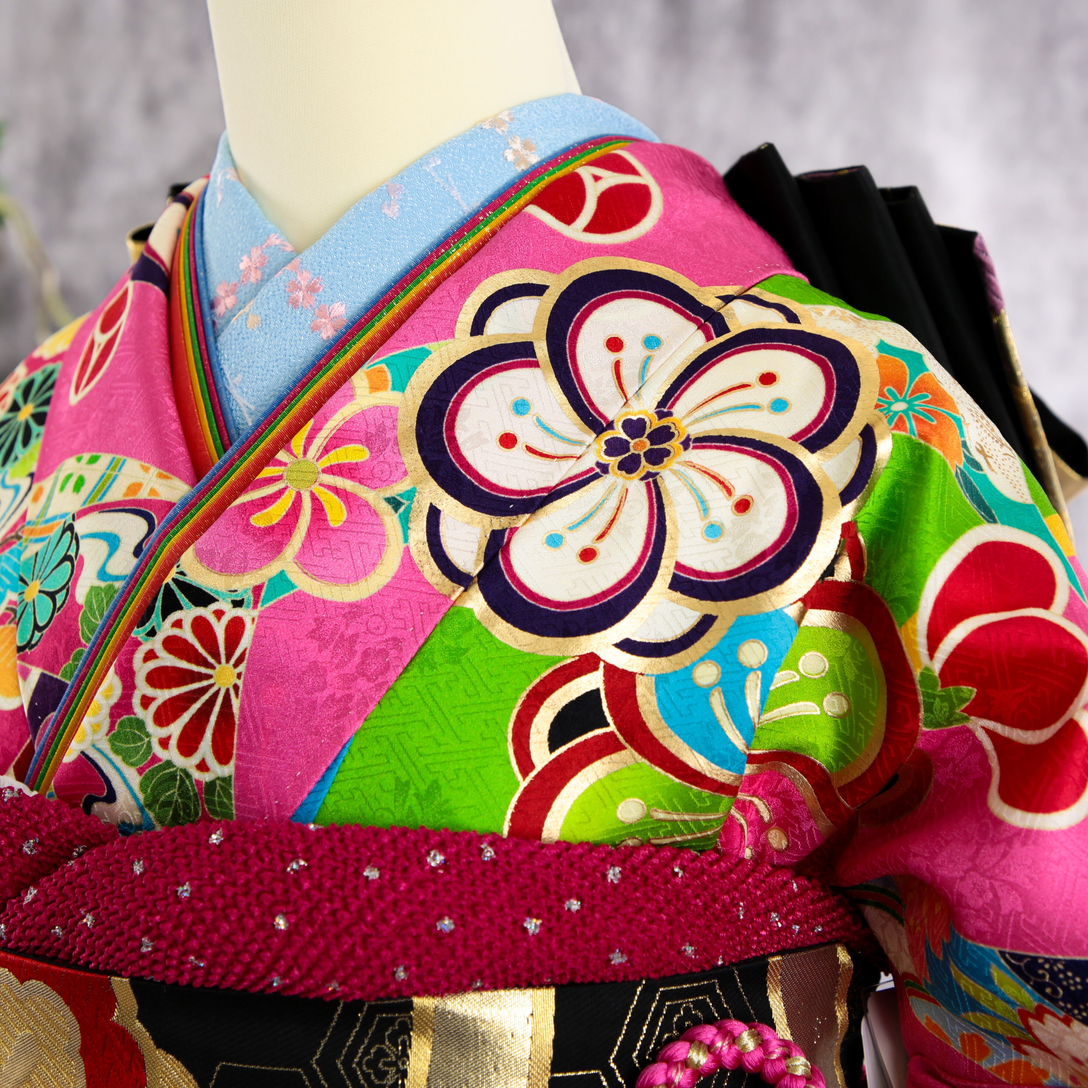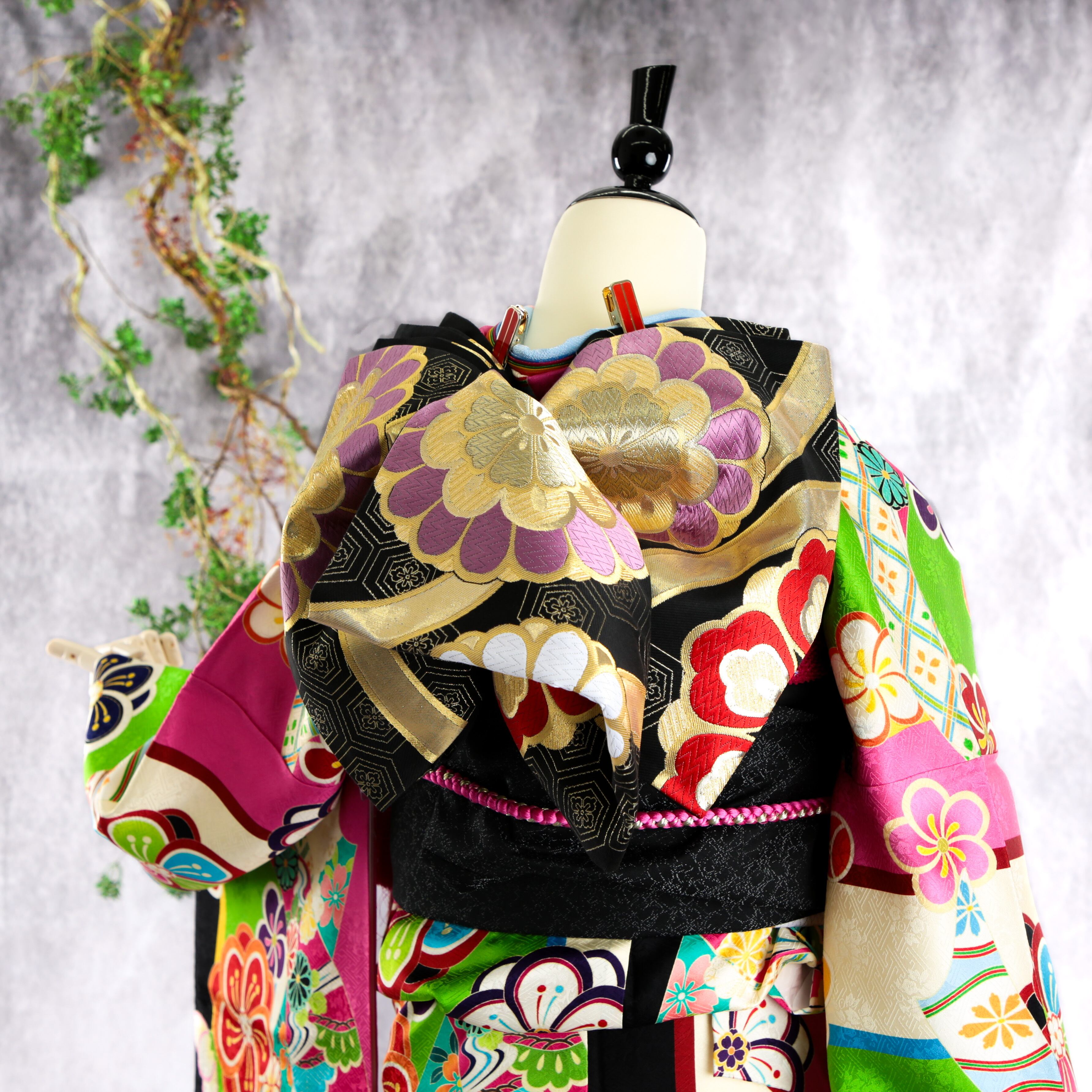 ピンク、緑、黒、クリームのカラフルな地が華やかなレトロモダン振袖です。