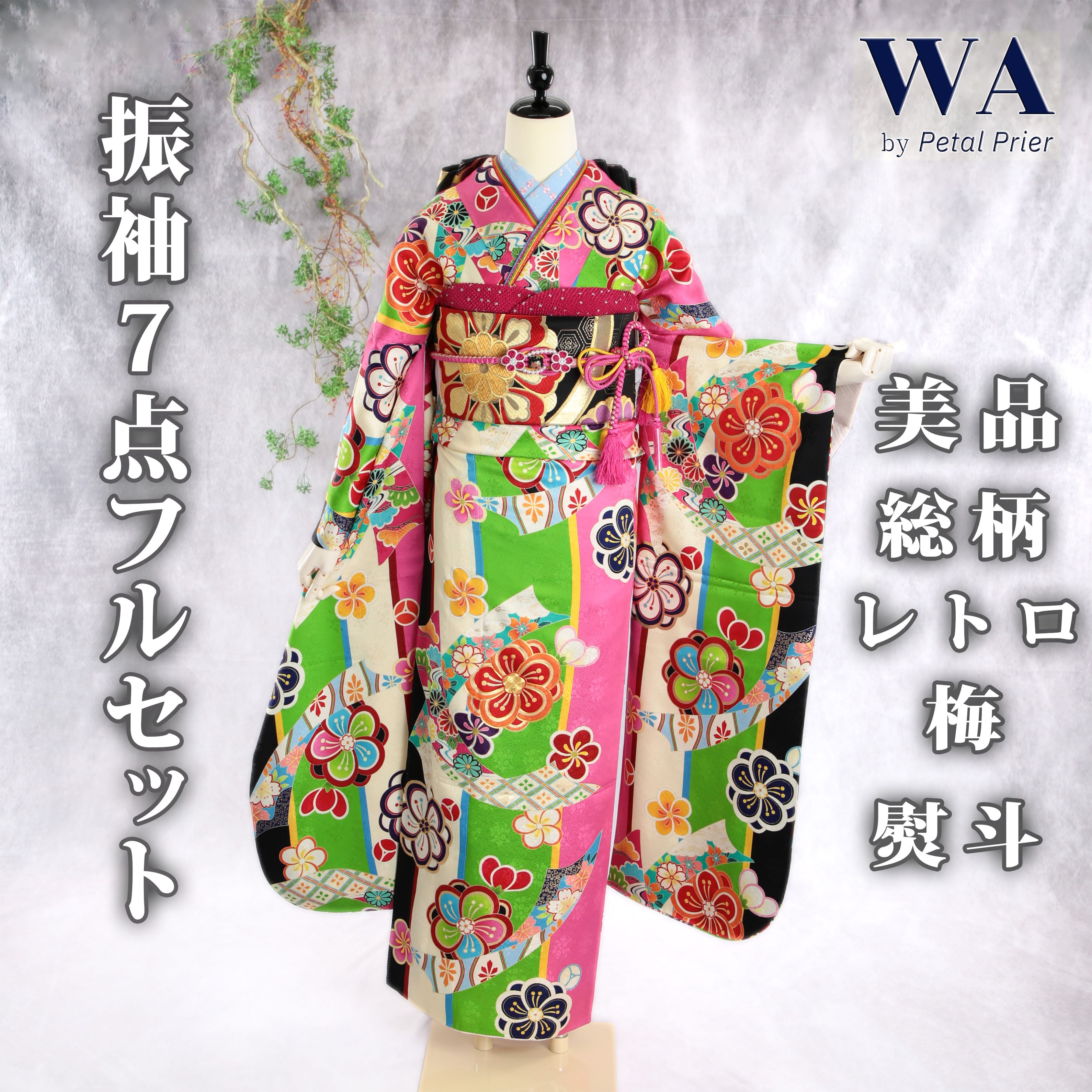 振袖フルセット 振袖セット 振袖 Lサイズ 総柄×レトロ 美品 成人式 着物 晴れ着 7点フルセット F-514