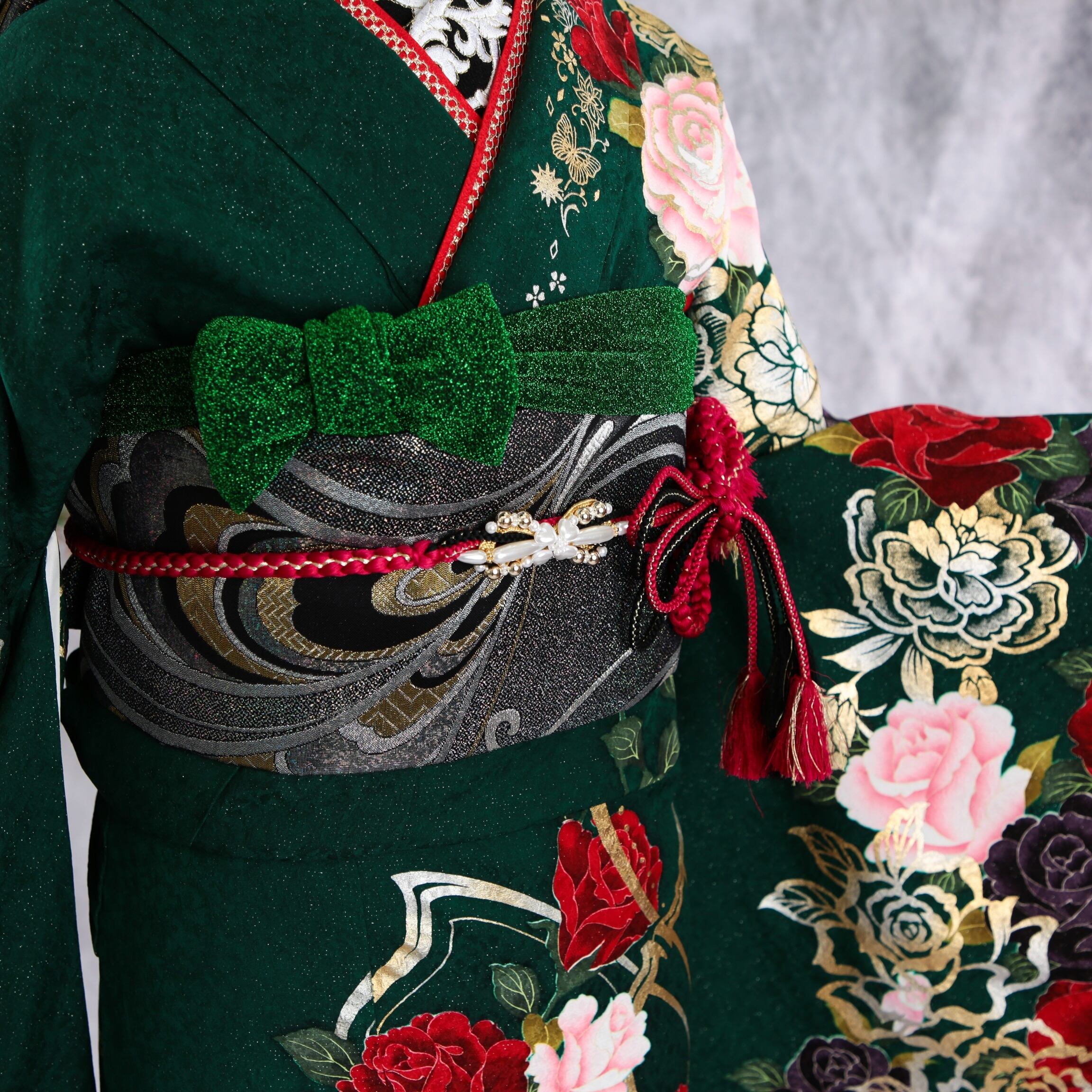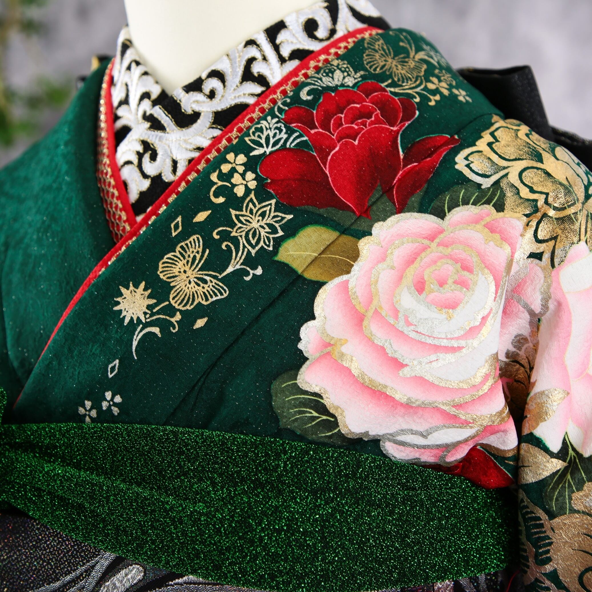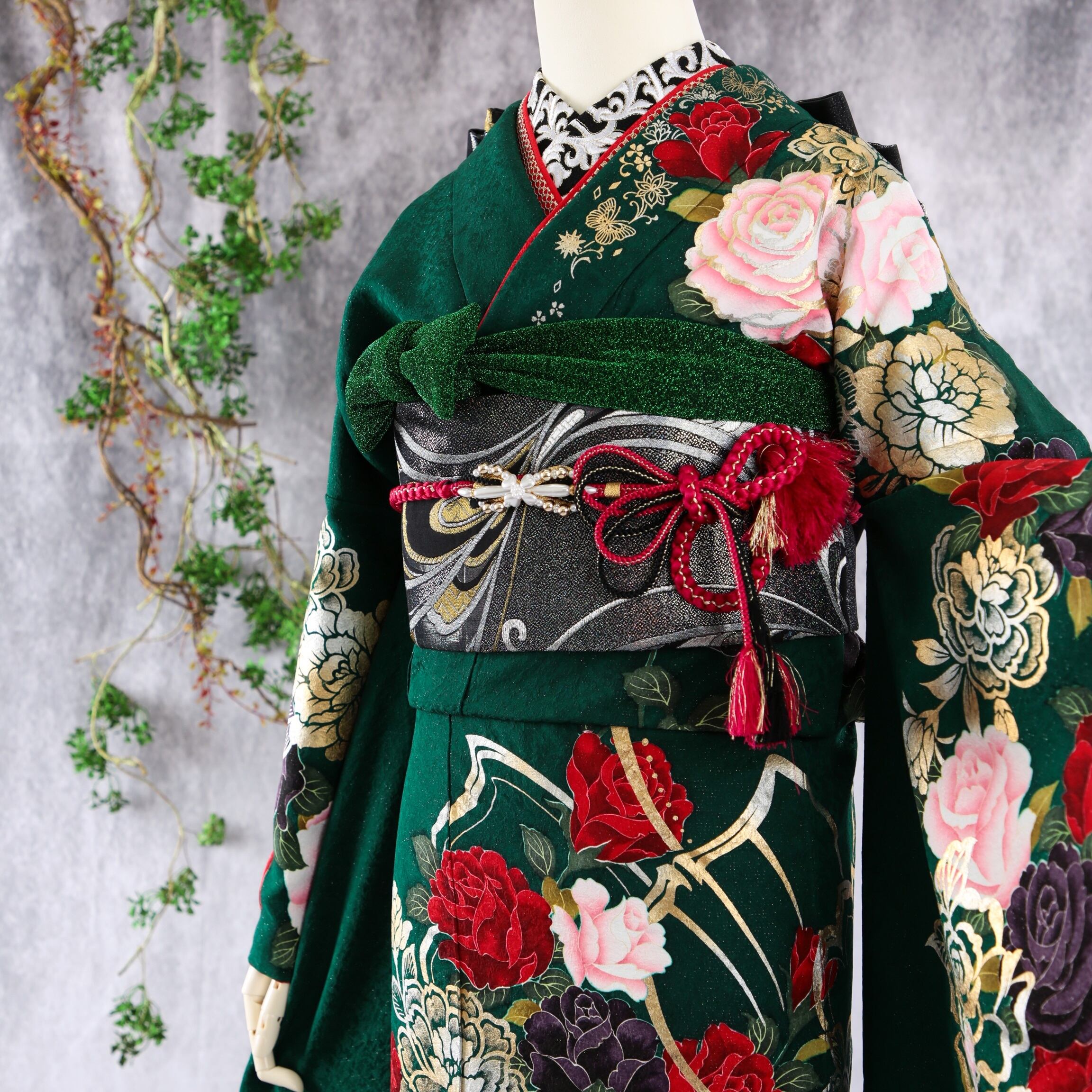 振袖フルセット 振袖セット 振袖 L〜LLサイズ 緑×エレガント 美品 成人式 着物 晴れ着 7点フルセット F-469
