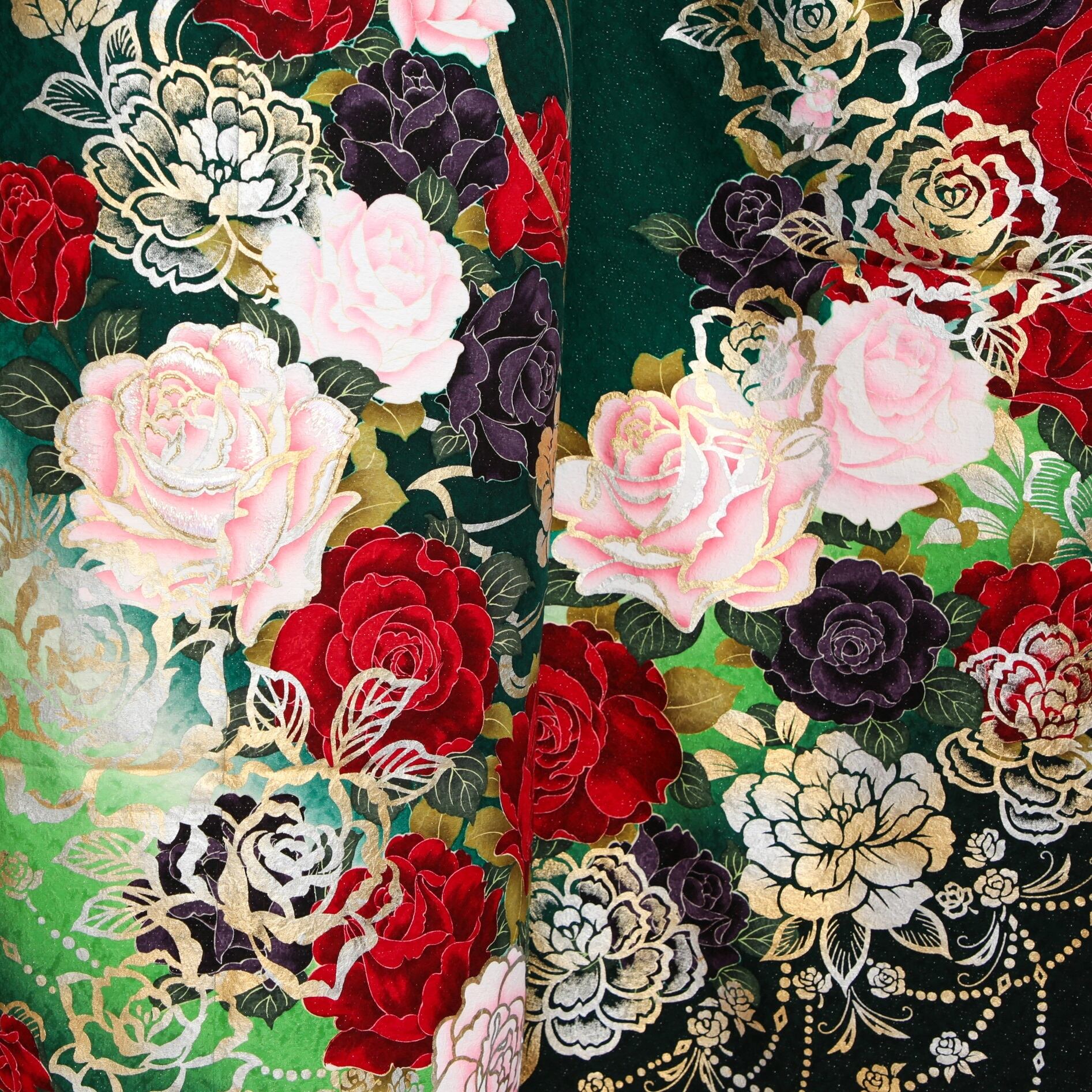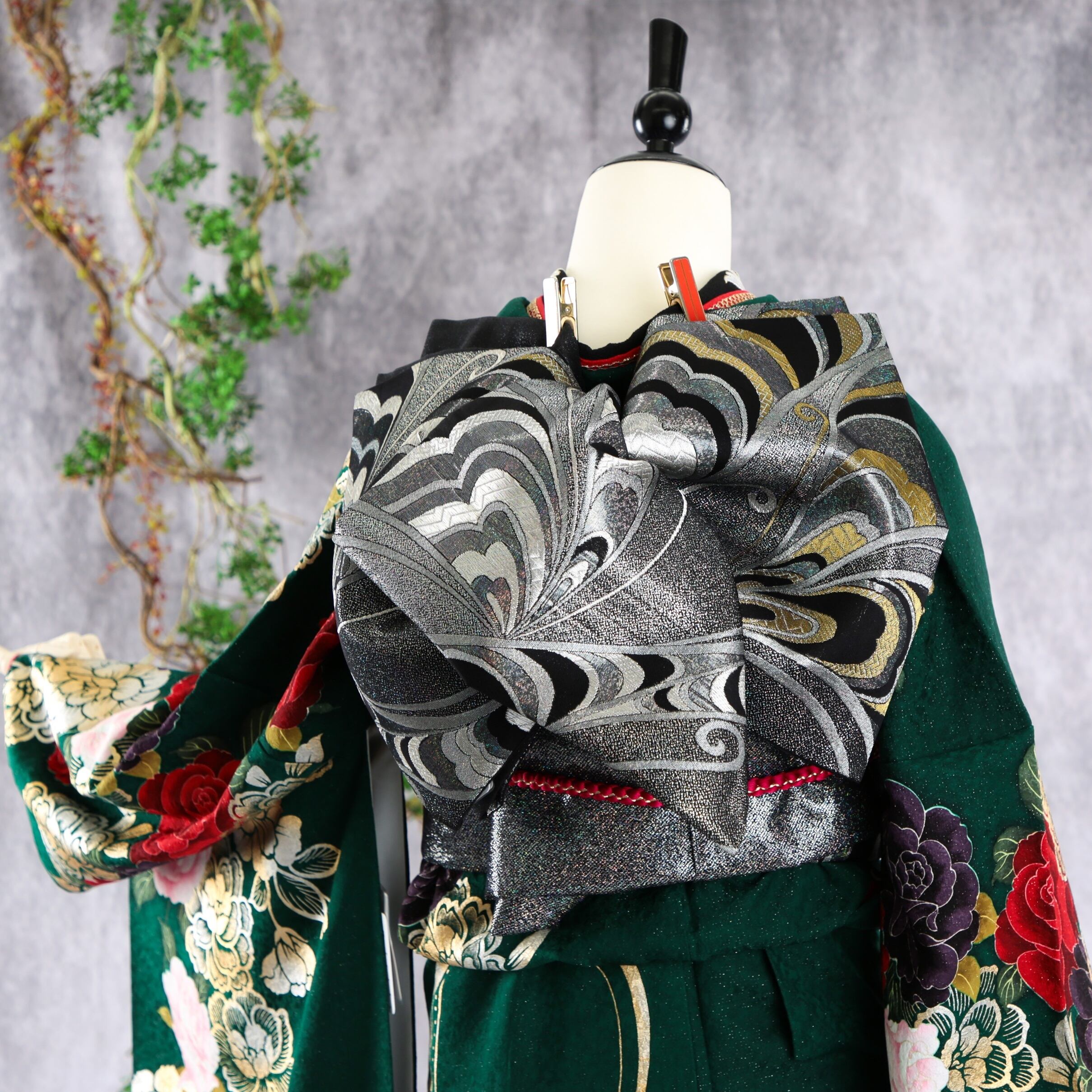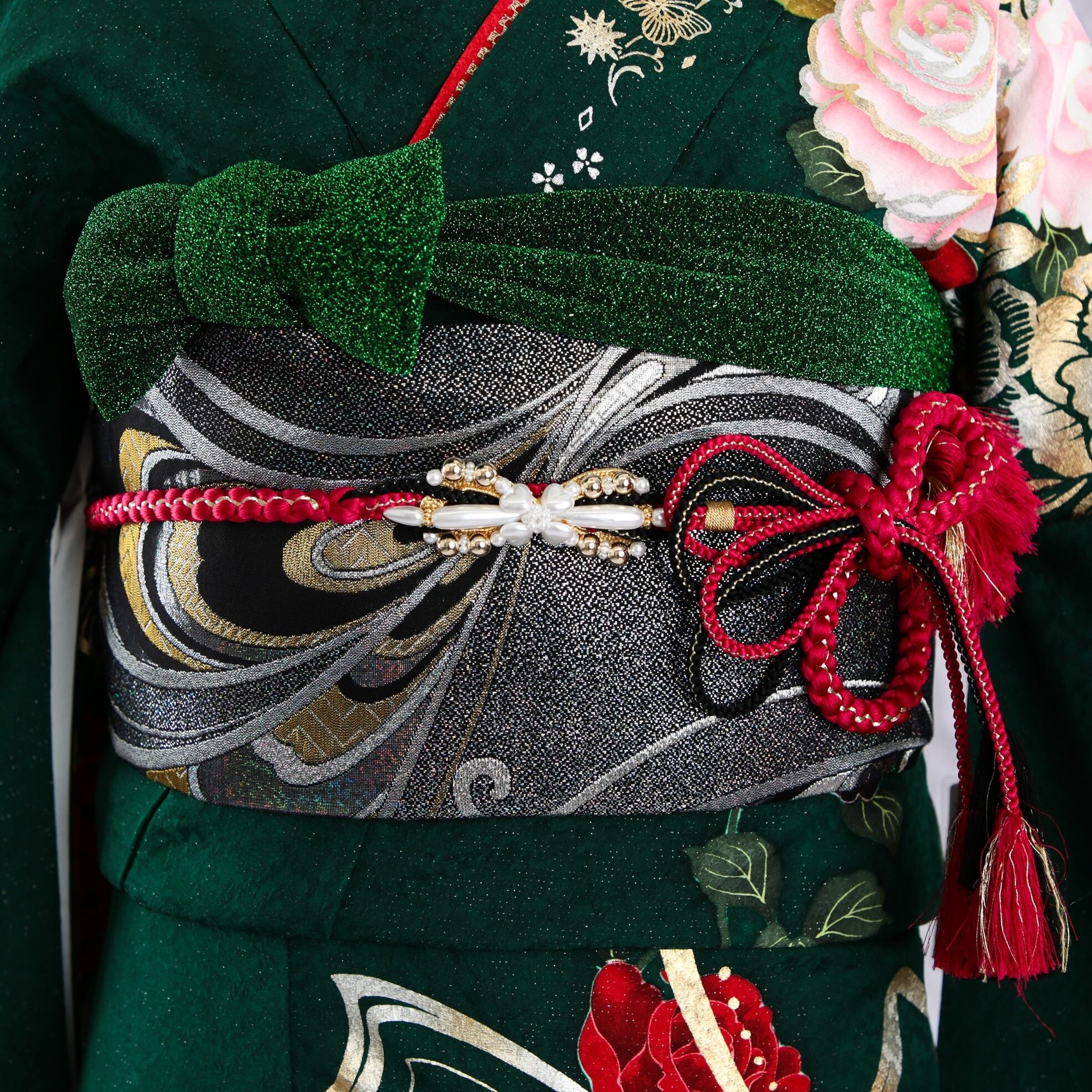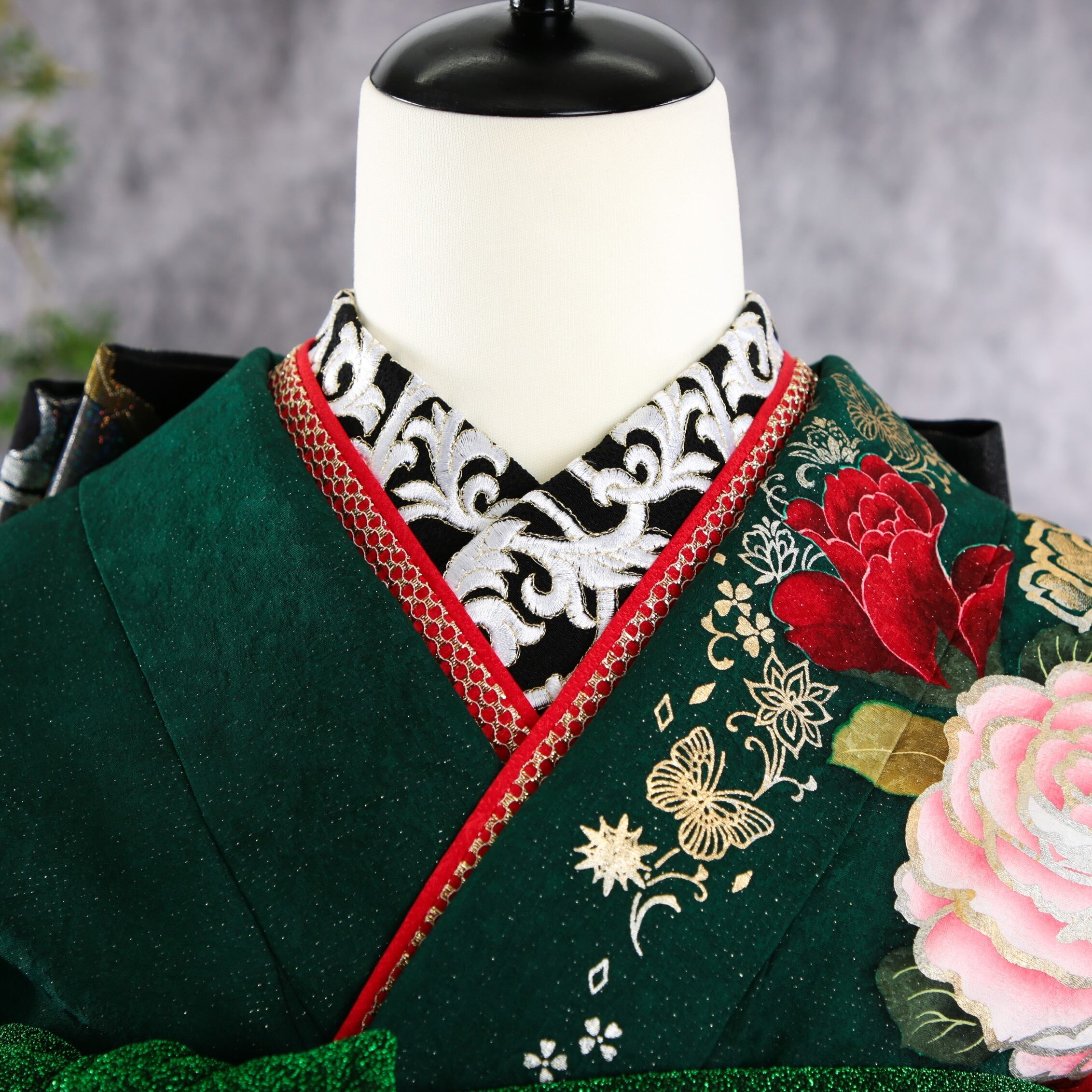 振袖フルセット 振袖セット 振袖 L〜LLサイズ 緑×エレガント 美品 成人式 着物 晴れ着 7点フルセット F-469