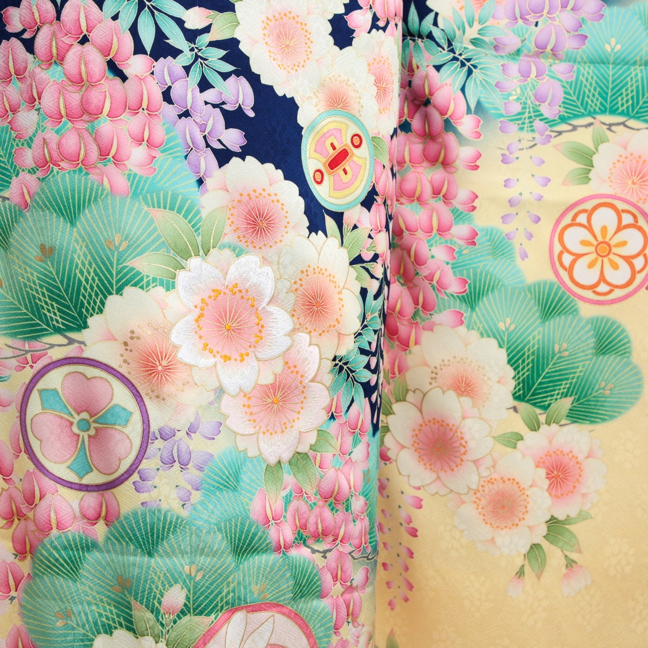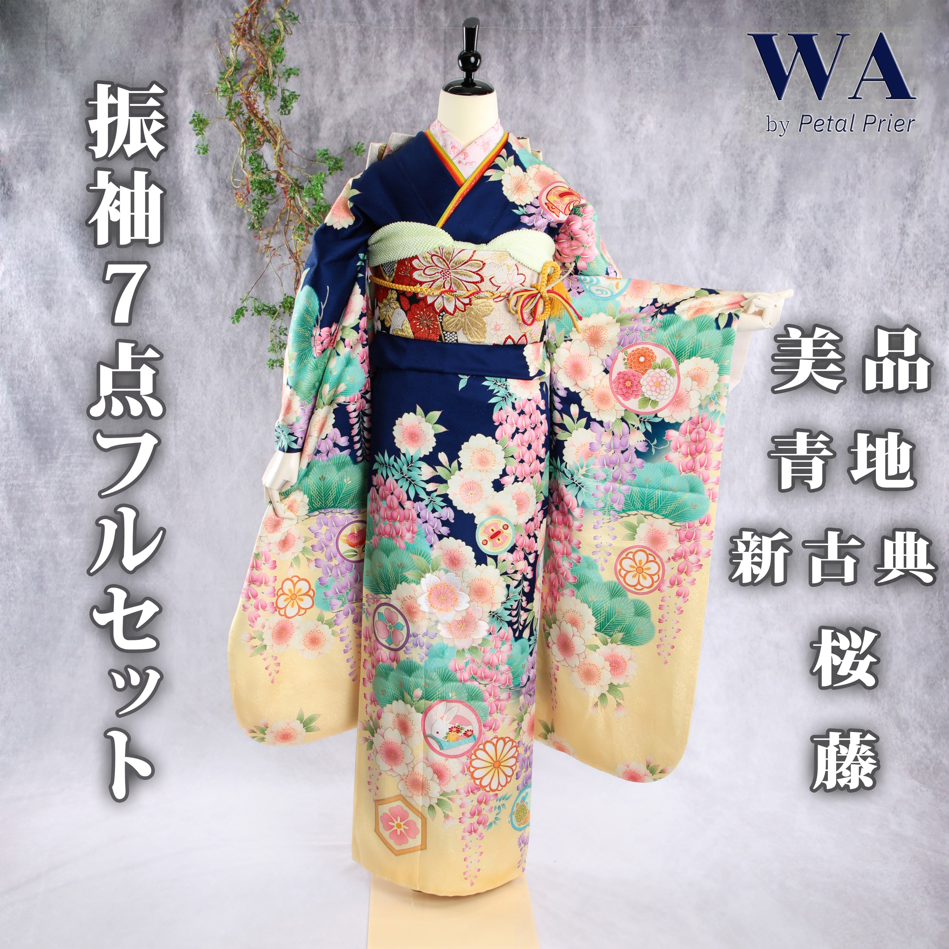 青地に藤や桜が印象的な振袖です。