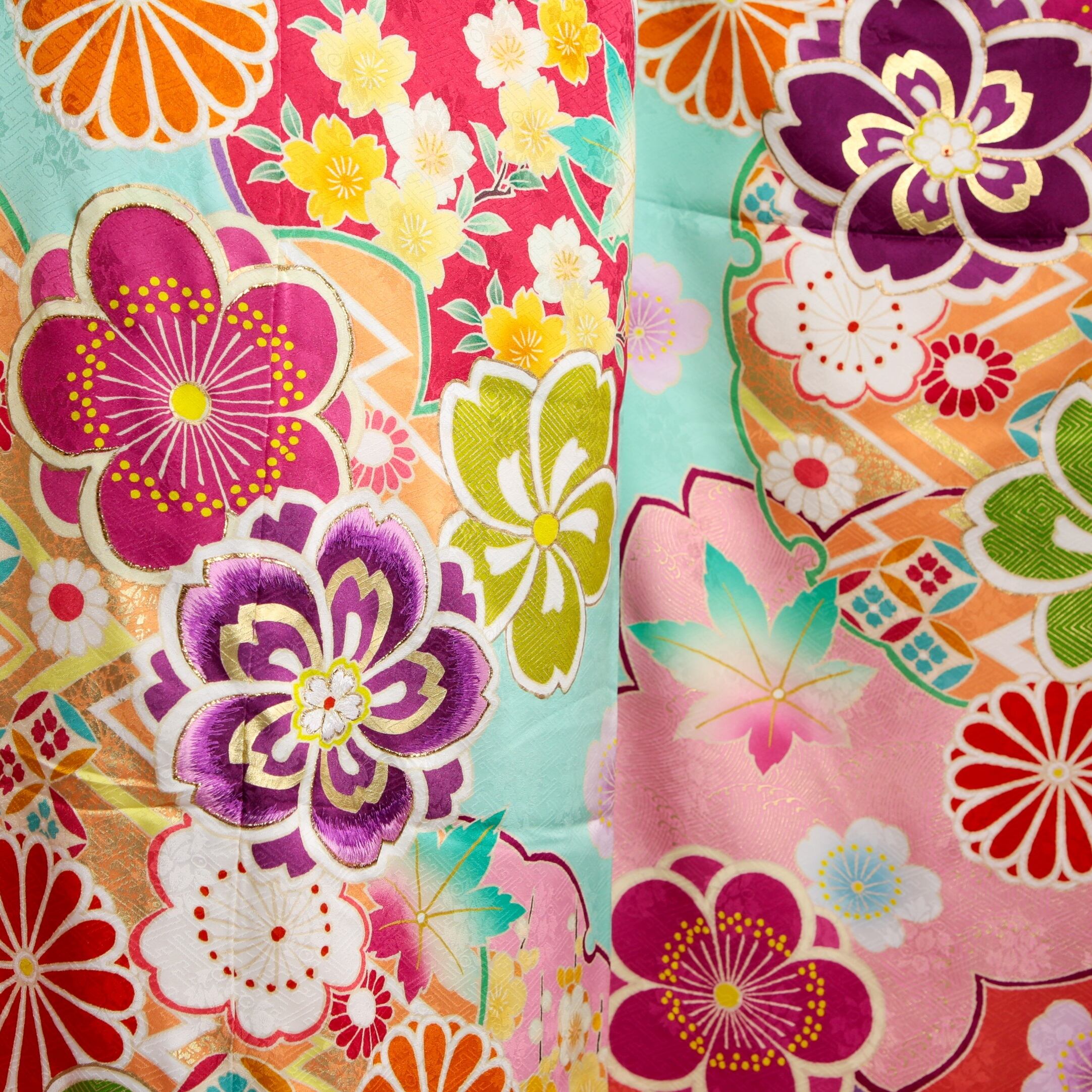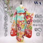振袖フルセット 振袖セット 振袖 LLサイズ 水色×キュート 美品 成人式 着物 晴れ着 7点フルセット F-475