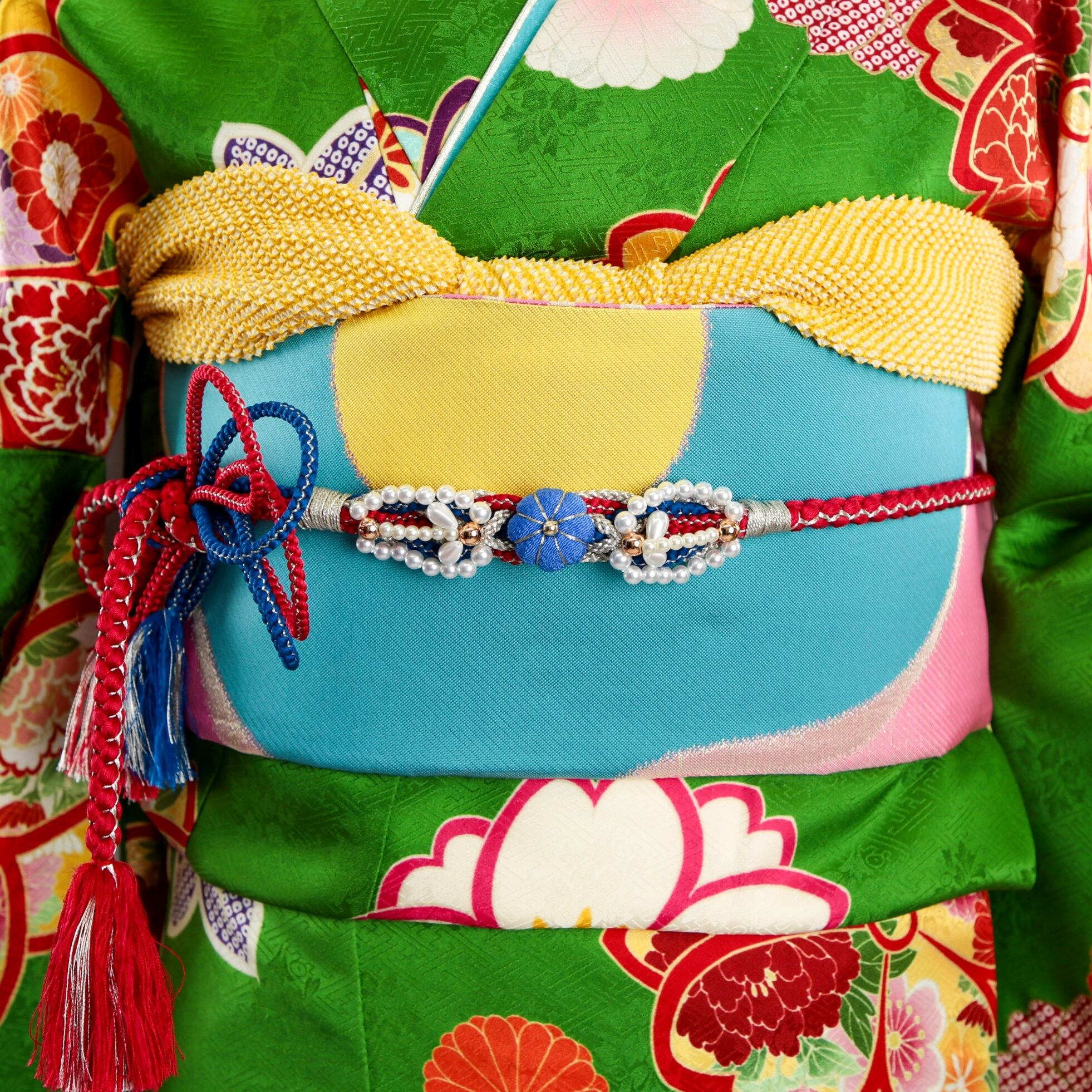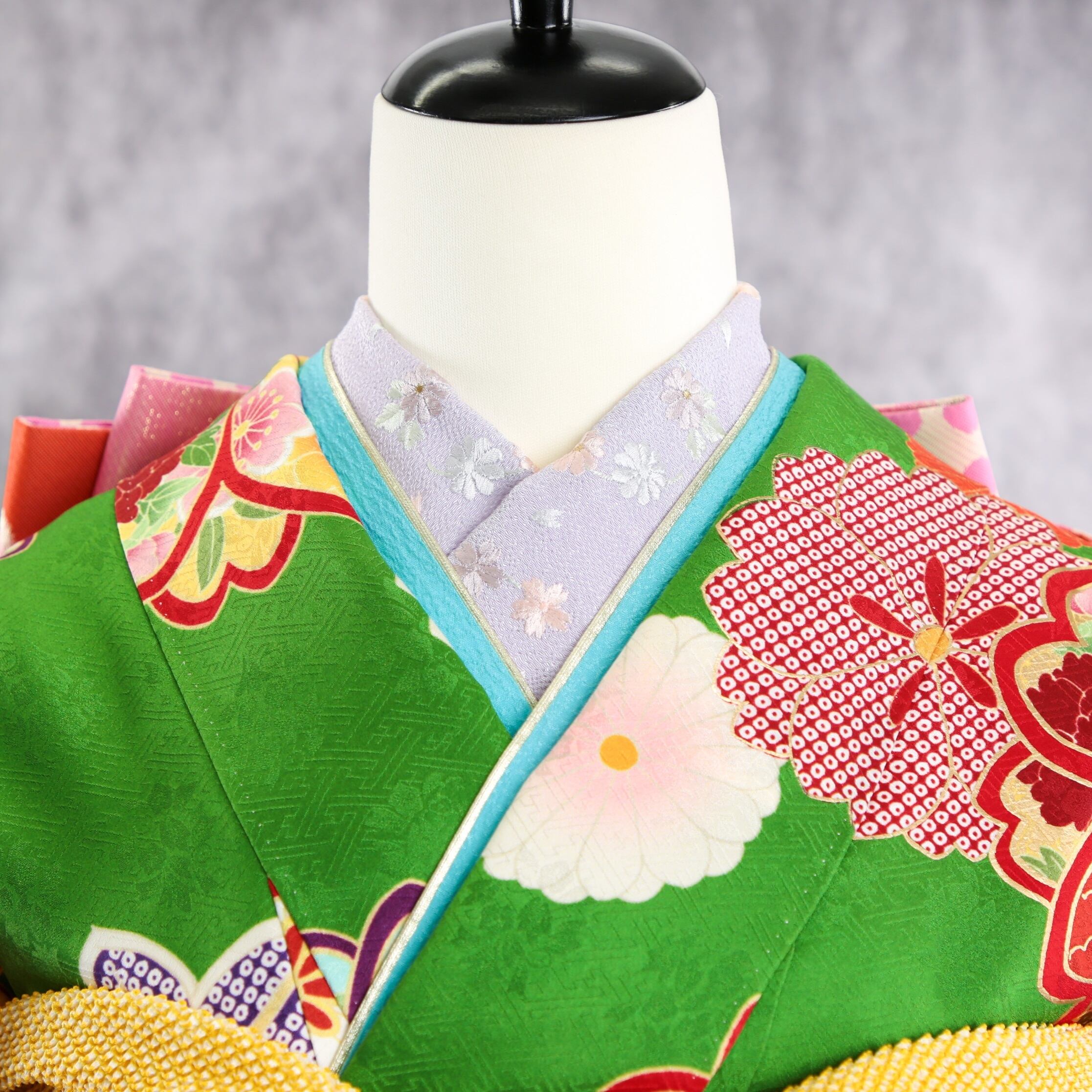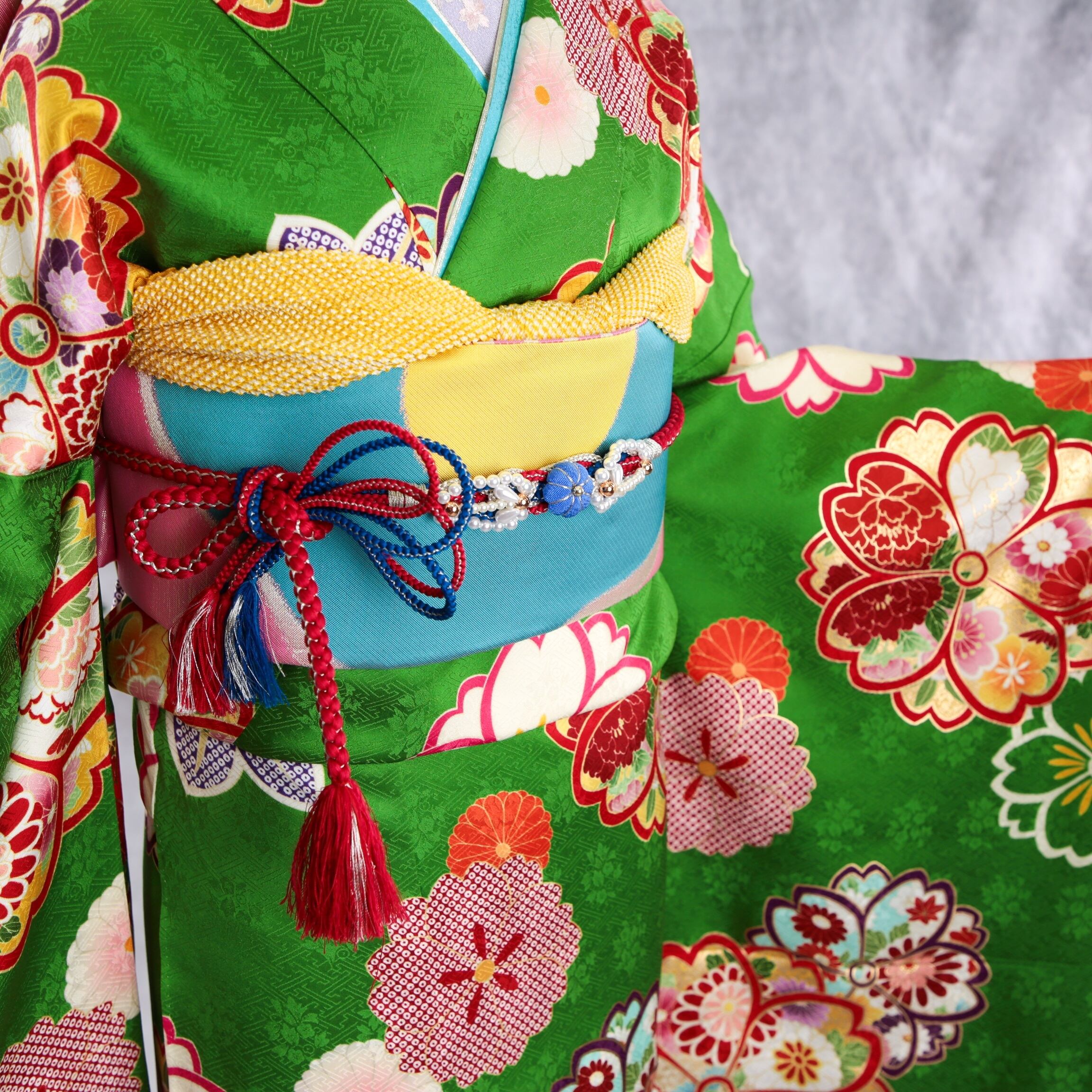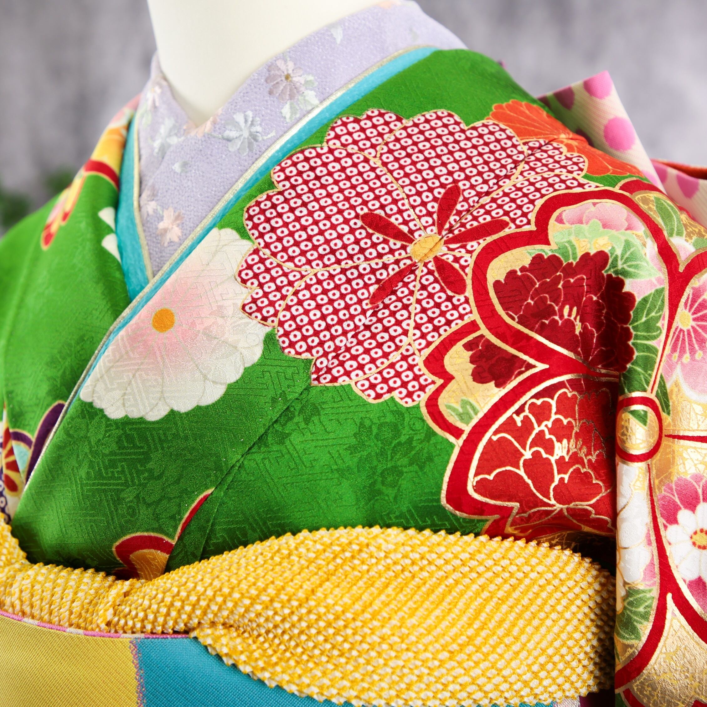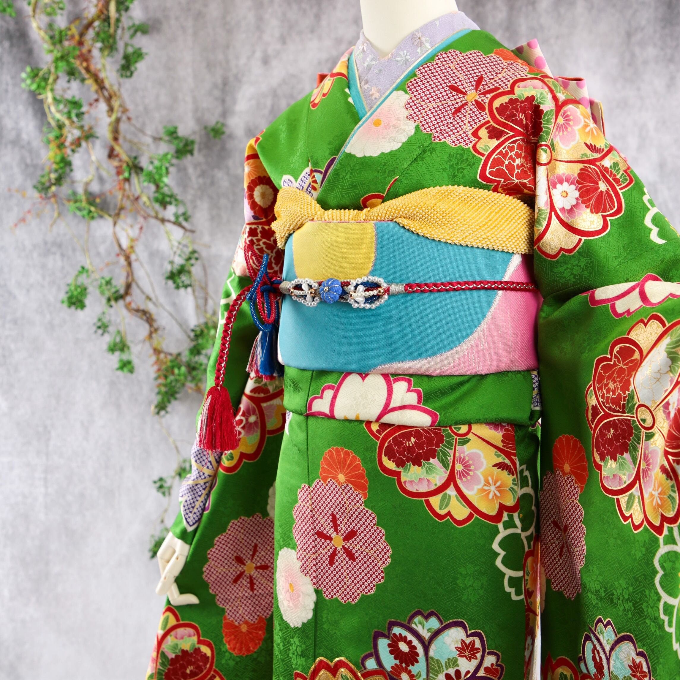 緑の振袖にカラフルな帯の配色が特徴的で、周りと被らないデザインをお求めの方におすすめです。