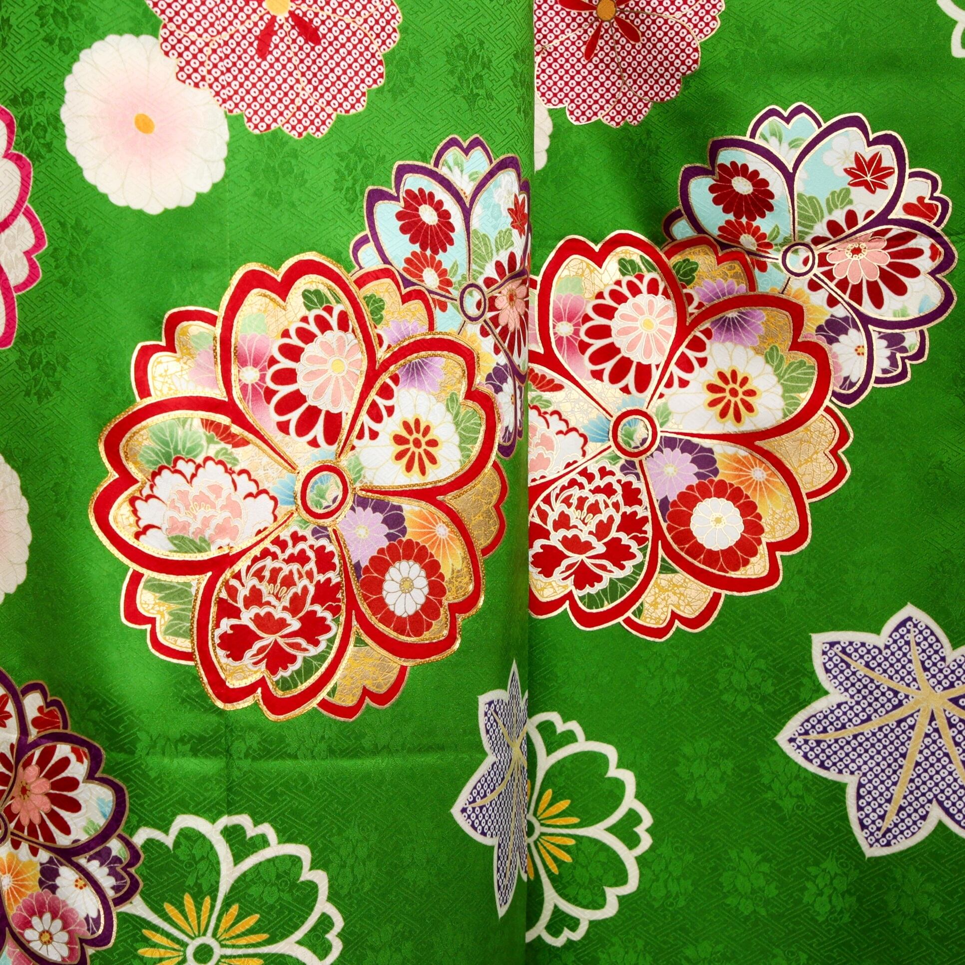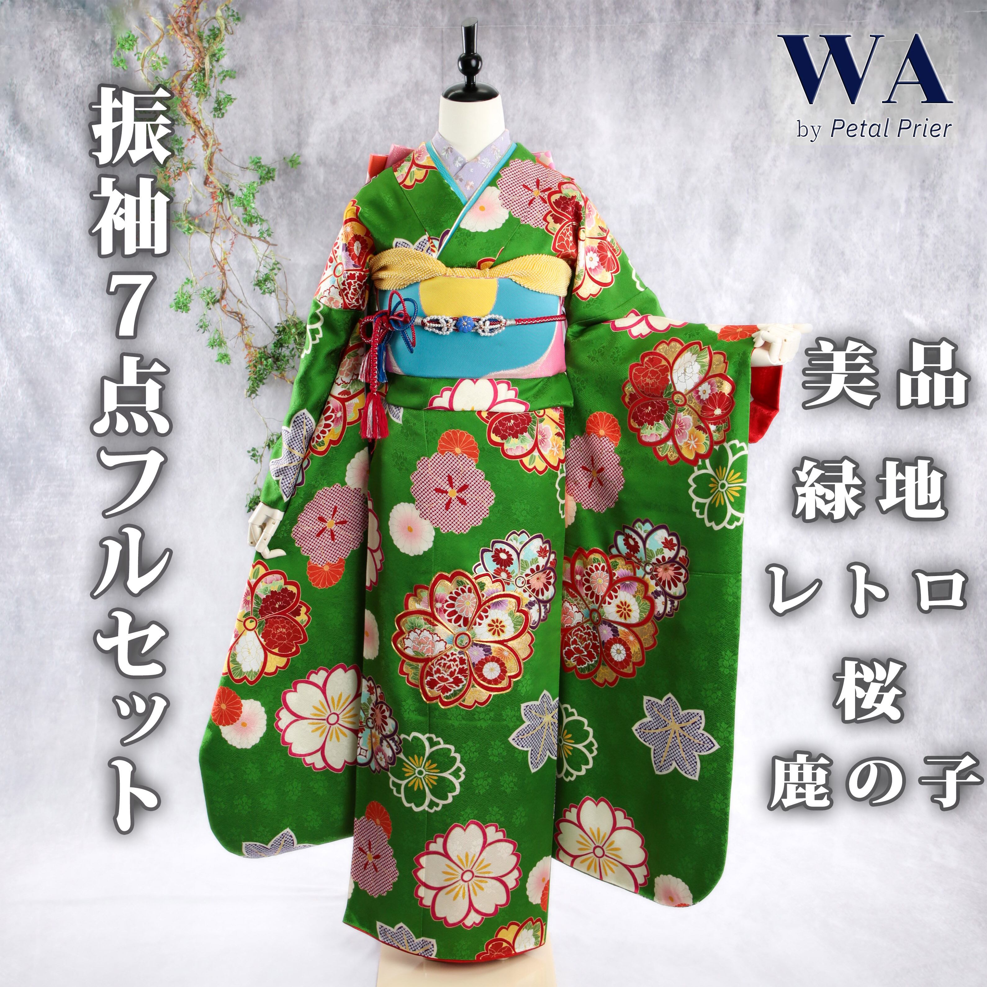 振袖フルセット 振袖セット 振袖 L〜LLサイズ 緑×レトロ 美品 成人式 着物 晴れ着 7点フルセット F-477