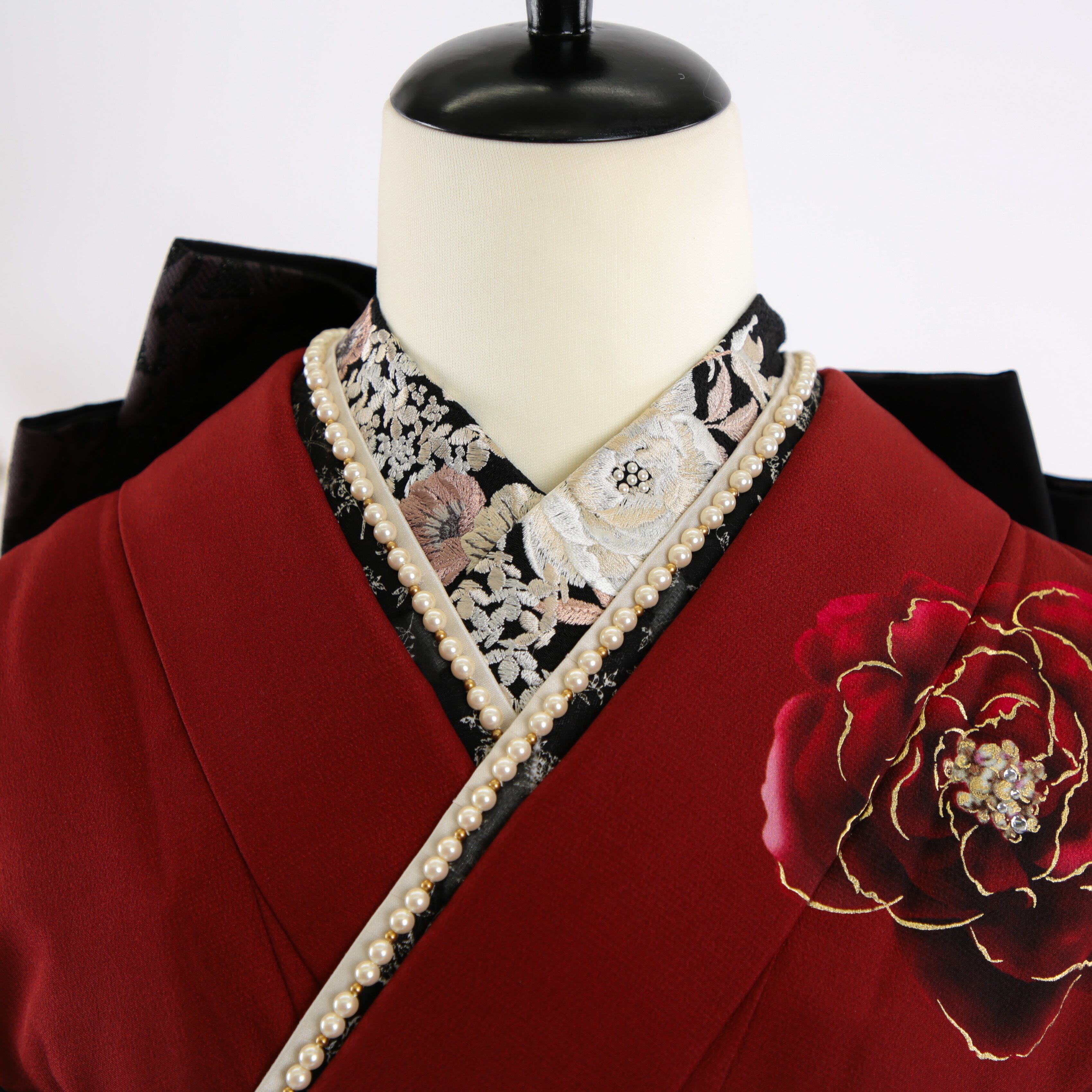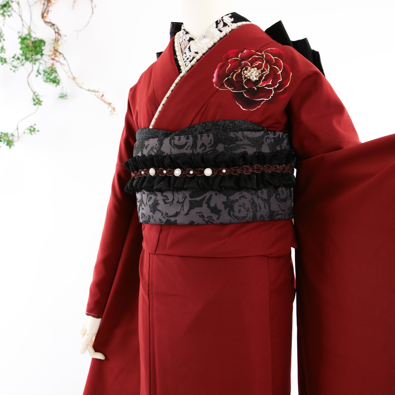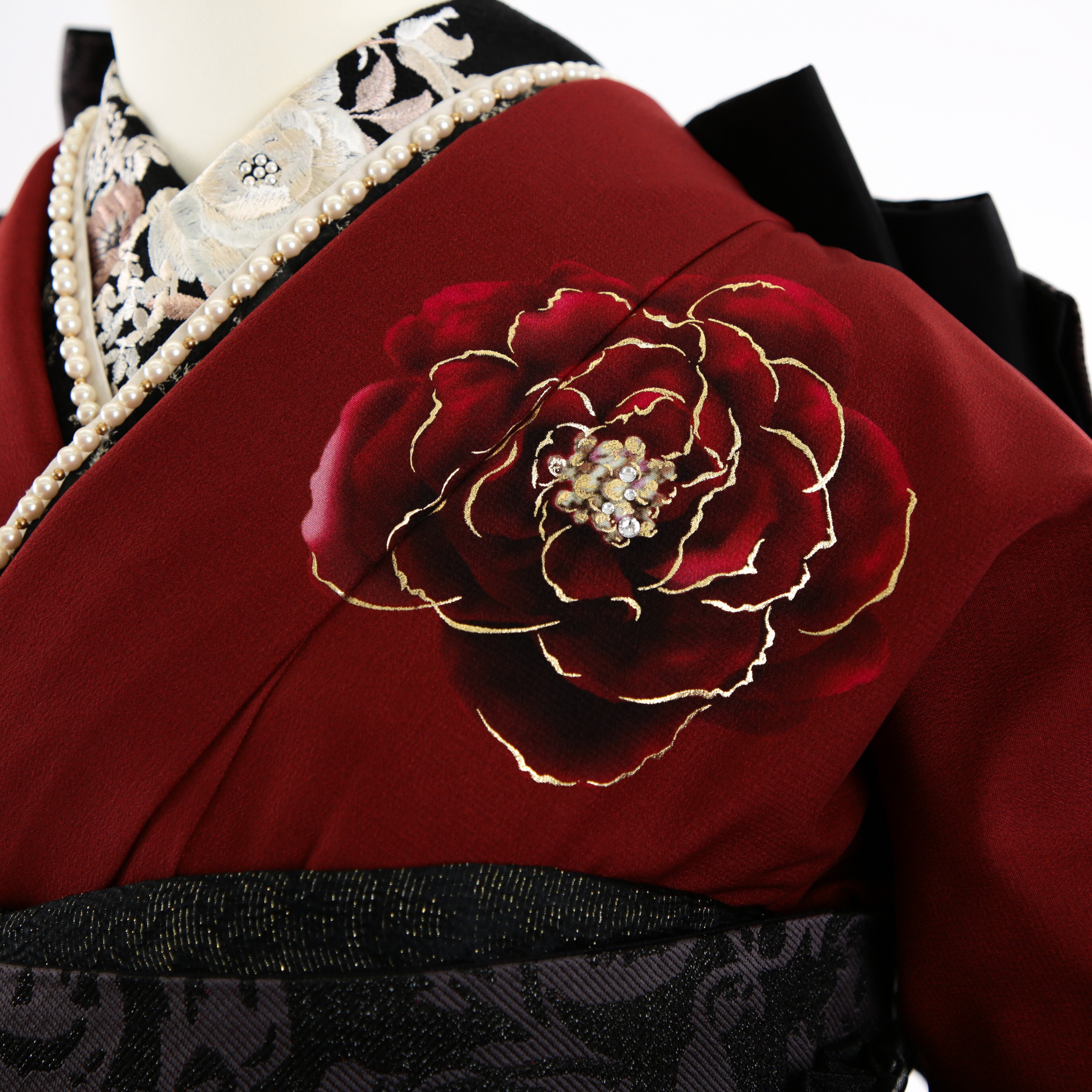 赤と黒で統一されたデザインが特徴的な振袖です。