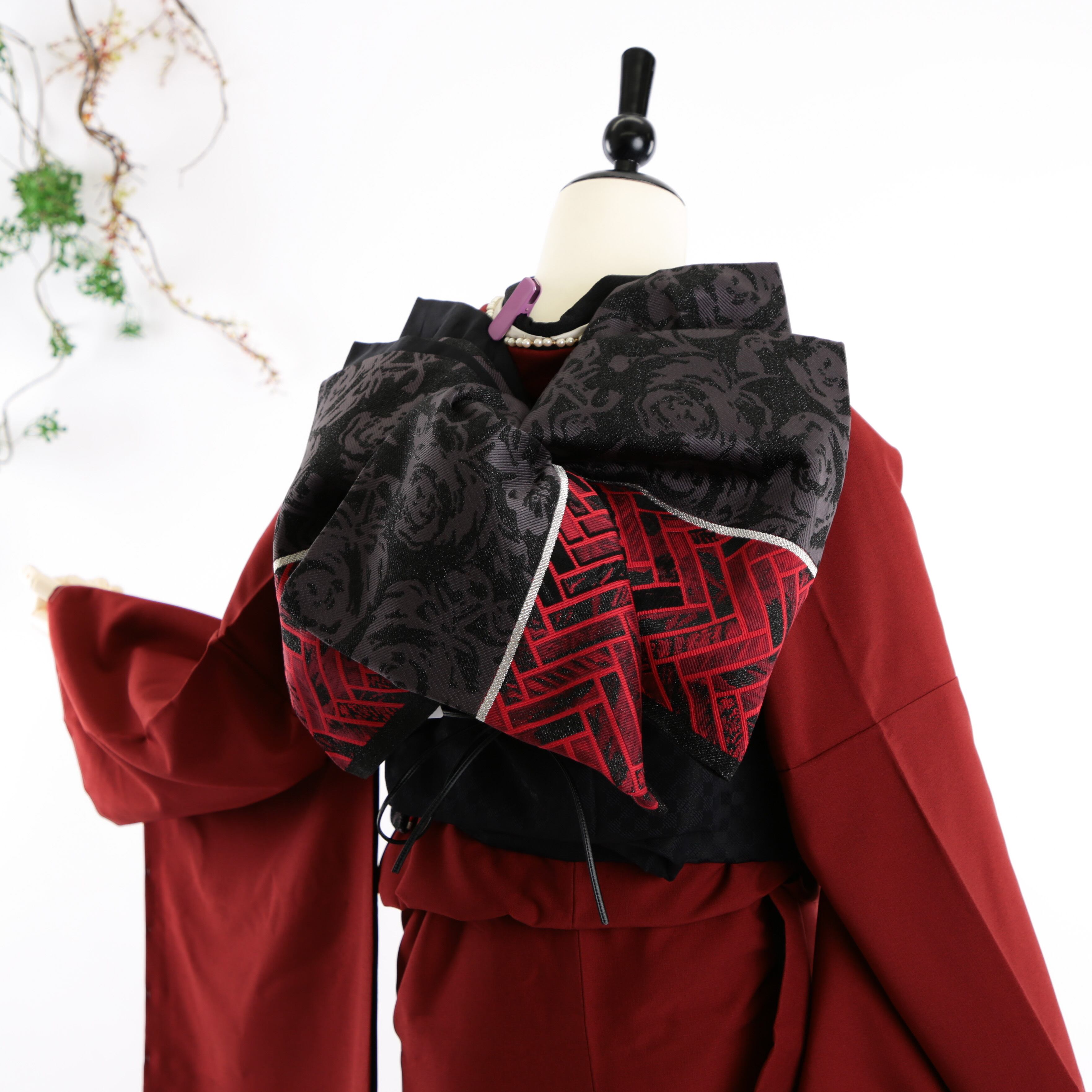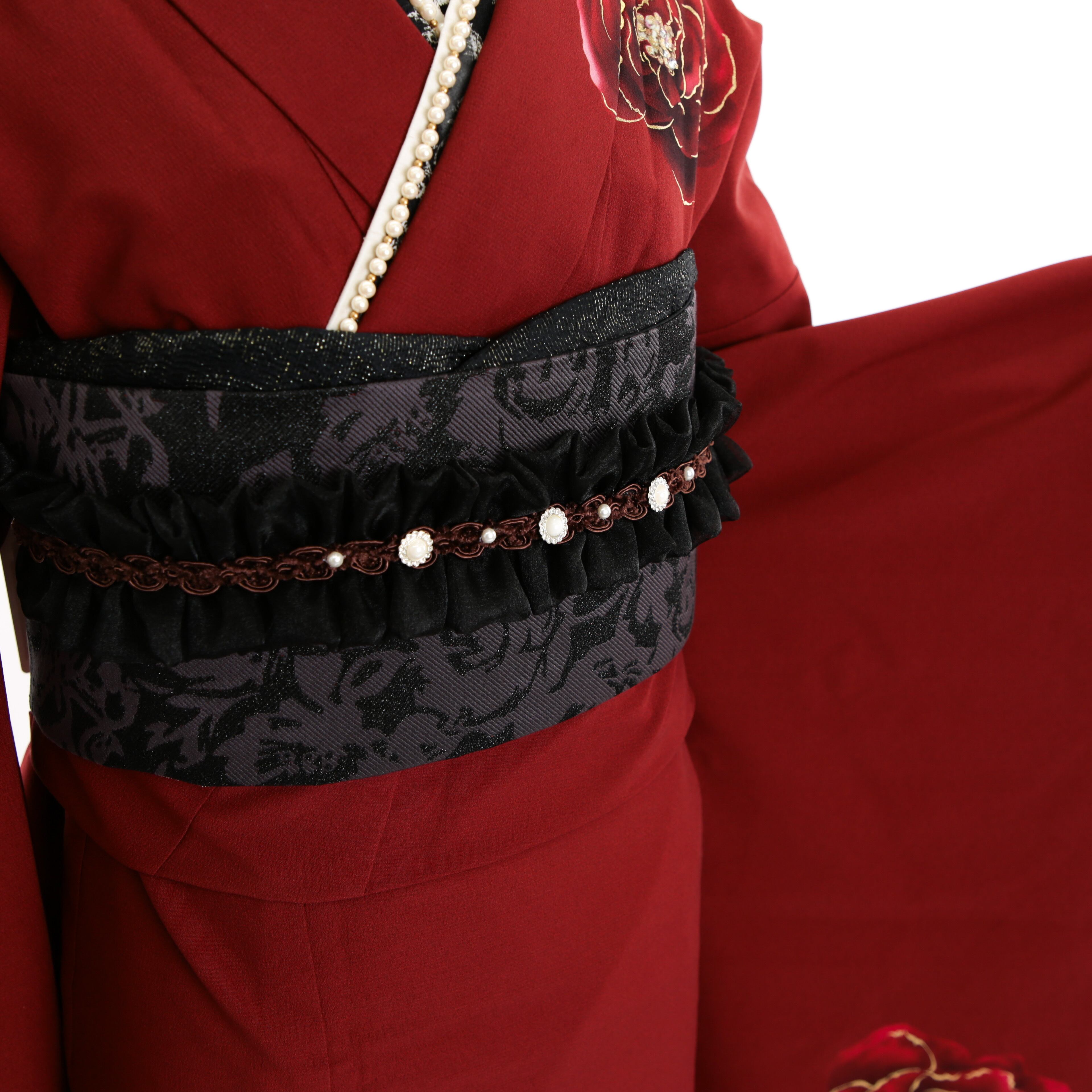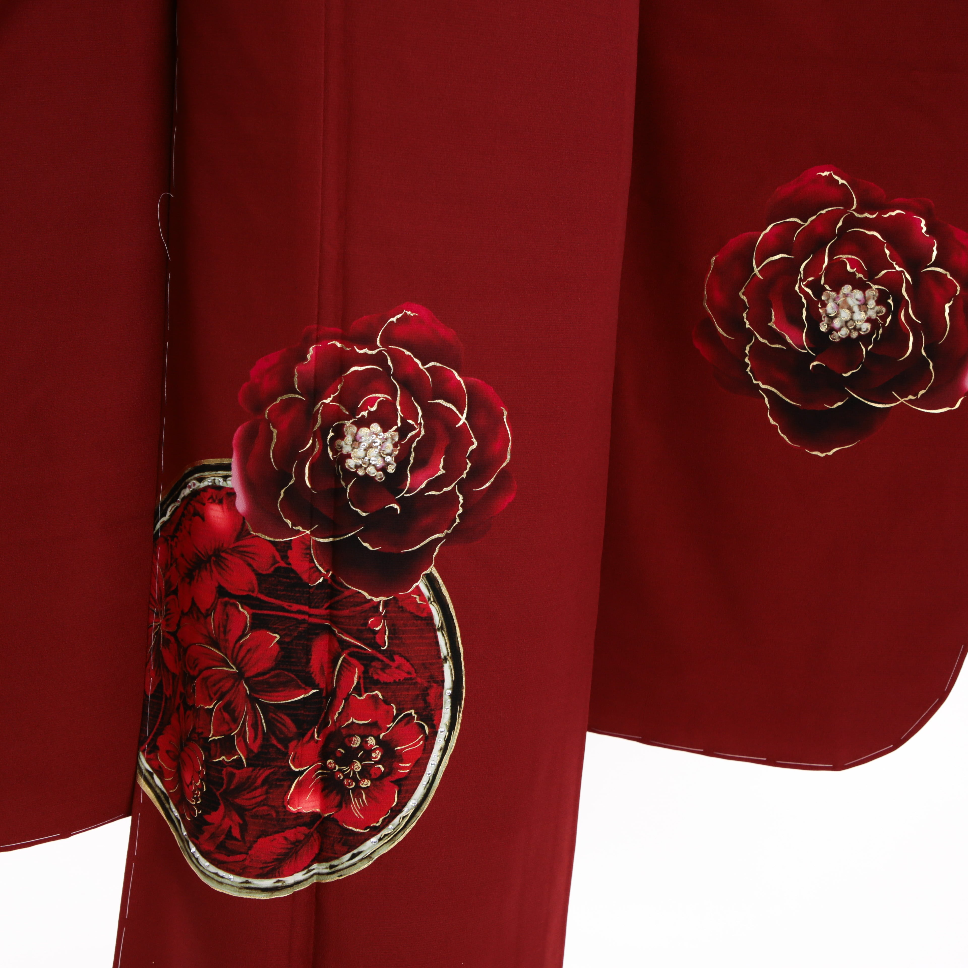 赤と黒で統一されたデザインが特徴的な振袖です。